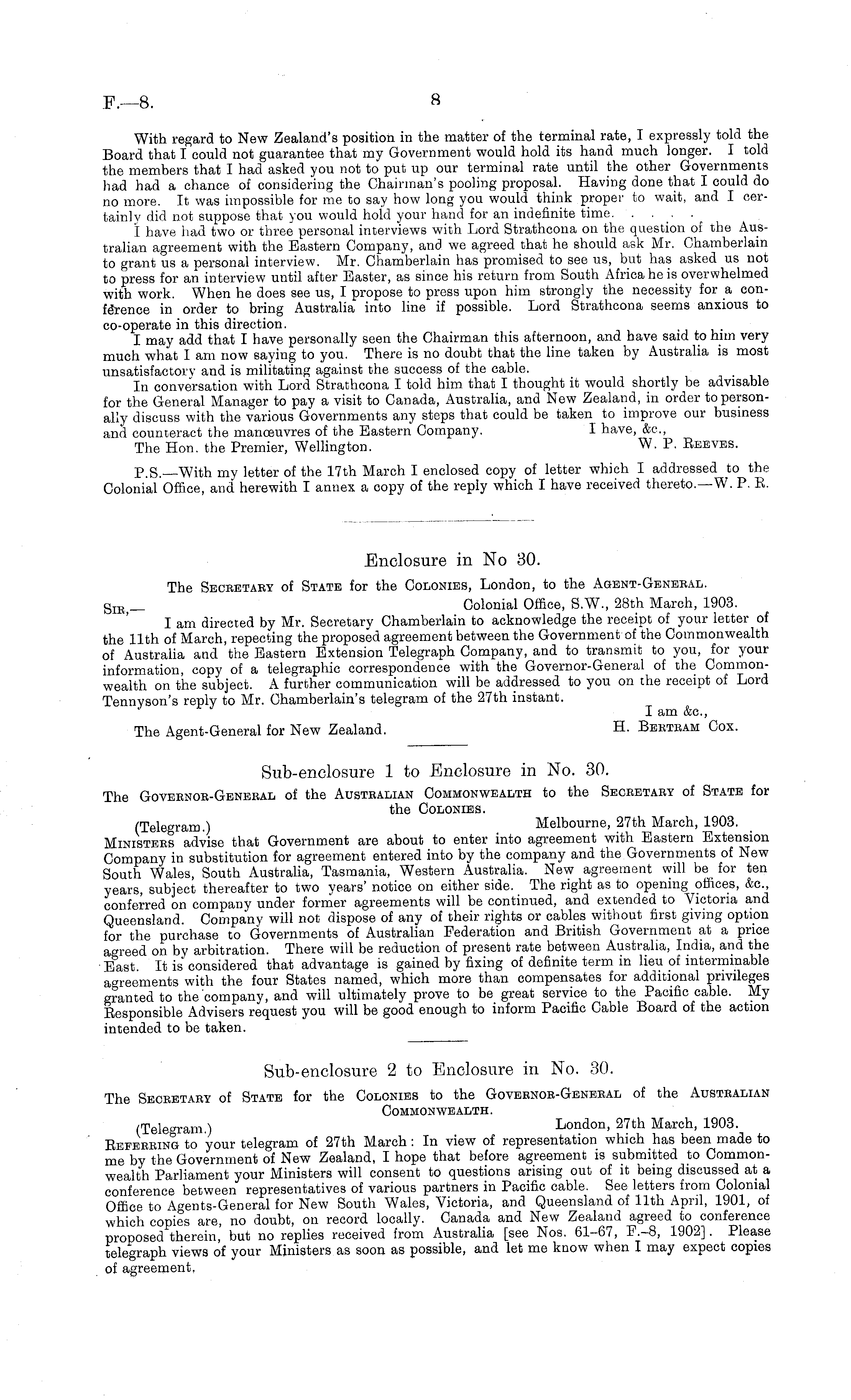 With regard to New Zealand's position in the matter of the terminal rate, I expressly told the Board that I could not guarantee that my Government would hold its hand much longer. I told the members that I had asked you not to put up our terminal rate until the other Governments had had a chance of considering the Chairman's pooling proposal. Having done that I could do no more. It was impossible for me to say how long you would think proper to wait, and I certainly did not suppose that you would hold your hand for an indefinite time. . . _. . I have had two or three personal interviews with Lord Strathcona on the question of the Australian agreement with the Eastern Company, and we agreed that he should ask Mr. Chamberlain to grant us a personal interview. Mr. Chamberlain has promised to see us, but has asked us not to press for an interview until after Easter, as since his return from South Africa he is overwhelmed with work. When he does see us, I propose to press upon him strongly the necessity for a conference in order to bring Australia into line if possible. Lord Strathcona seems anxious to co-operate in this direction. I may add that I have personally seen the Chairman this afternoon, and have said to him very much what lam now saying to you. There is no doubt that the line taken by Australia is most unsatisfactory and is militating against the success of the cable. In conversation with Lord Strathcona I told him that I thought it would shortly be advisable for the General Manager to pay a visit to Canada, Australia, and New Zealand, in order to personally discuss with the various Governments any steps that could be taken to improve our business and counteract the manoeuvres of the Eastern Company. I have, &c, The Hon. the Premier, Wellington. W. P. Beeves. p.S. With my letter of the 17th March I enclosed copy of letter which I addressed to the Colonial Office, and herewith I annex a copy of the reply which I have received thereto.—W. P. R.