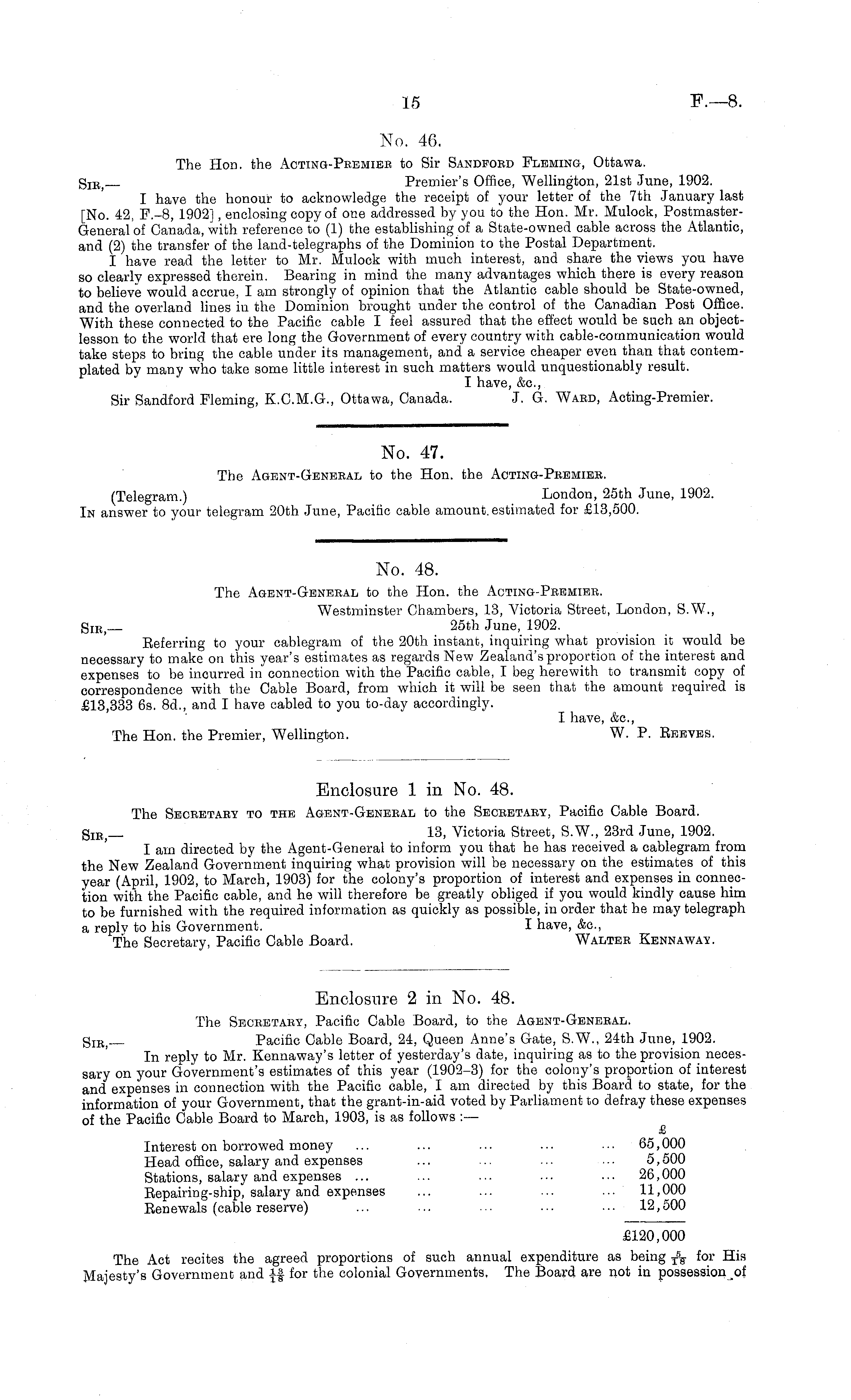 No. 47. The Agent-General to the Hon. the Acting-Pkemier. (Telegram.) London, 25th June, 1902. In answer to your telegram 20th June, Pacific cable amount, estimated for £13,500.