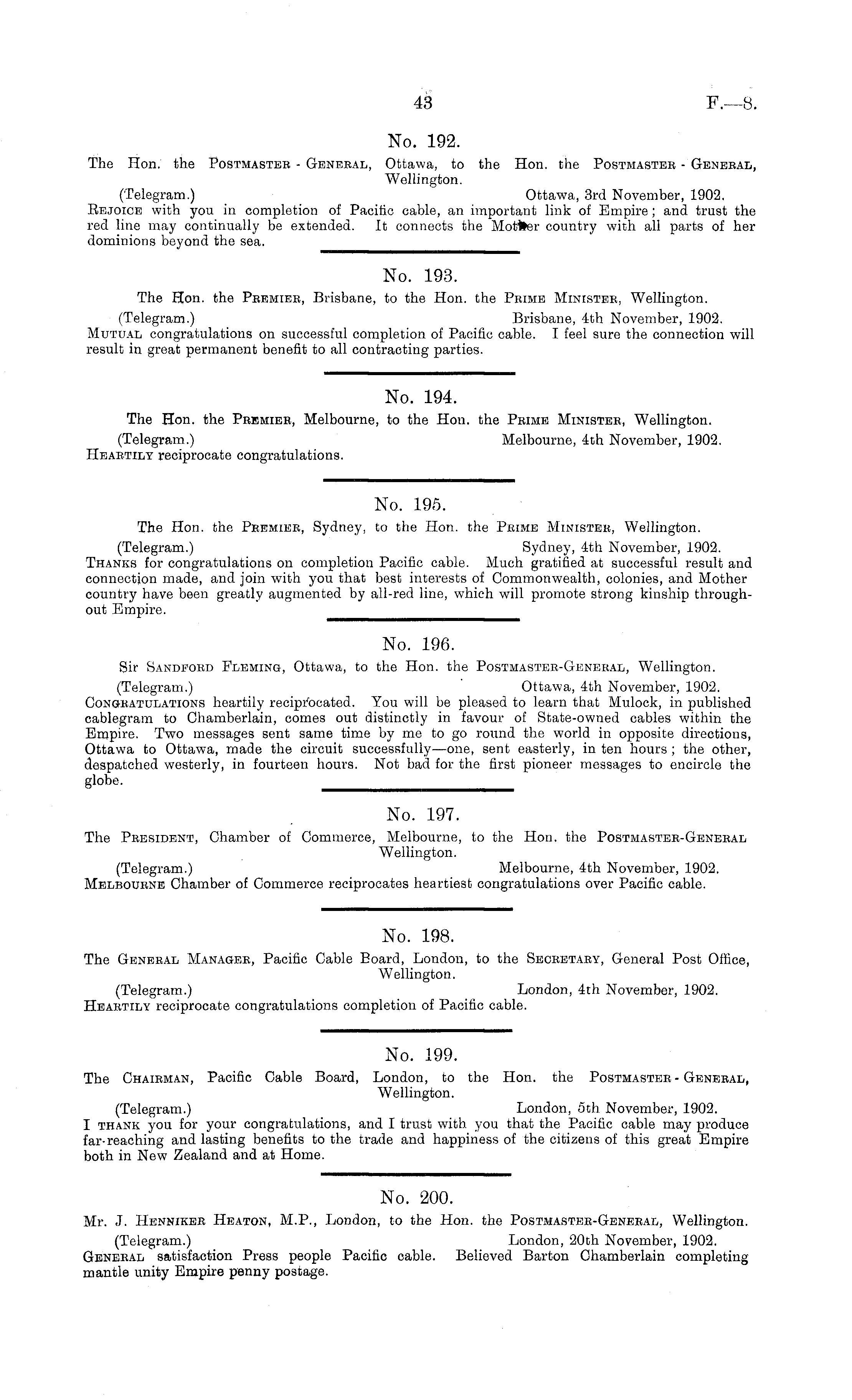 No. 196. Sir Sandpord Fleming, Ottawa, to the Hon. the Postmaster-General, Wellington. (Telegram.) Ottawa, 4th November, 1902. Congratulations heartily reciprocated. You will be pleased to learn that Mulock, in published cablegram to Chamberlain, comes out distinctly in favour of State-owned cables within the Empire. Two messages sent same time by me to go round the world in opposite directions, Ottawa to Ottawa, made the circuit successfully—one, sent easterly, in ten hours ; the other, despatched westerly, in fourteen hours. Not bad for the first pioneer messages to encircle the globe.