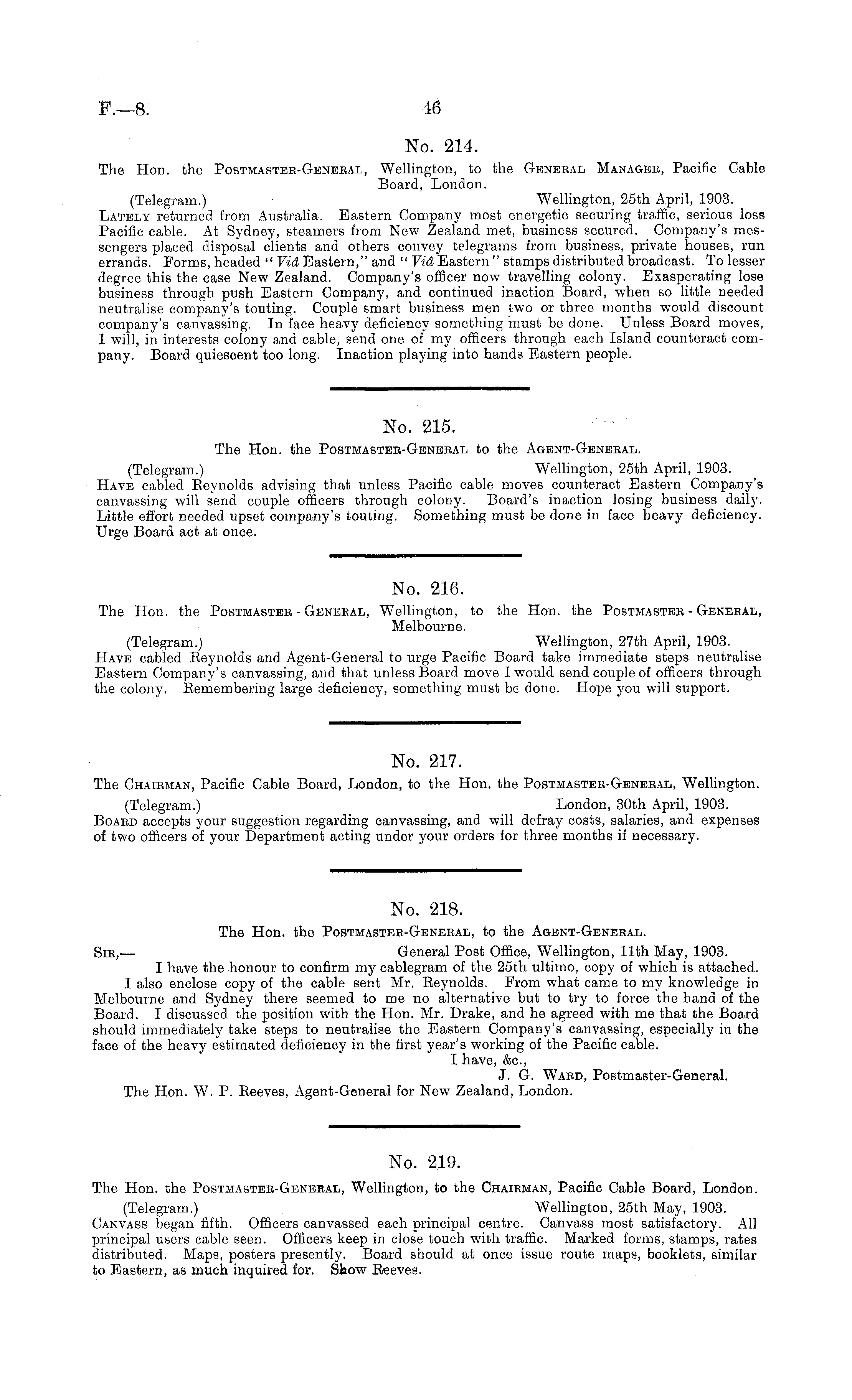 No. 215. The Hon. the Postmasteb-Genehal to the Aokent-Genekal. (Telegram.) Wellington, 25th April, 1903. Have cabled Eeynolds advising that unless Pacific cable moves counteract Eastern Company's canvassing will send couple officers through colony. Board's inaction losing business daily. Little effort needed upset company's touting. Something must be done in face heavy deficiency. Urge Board act at once.