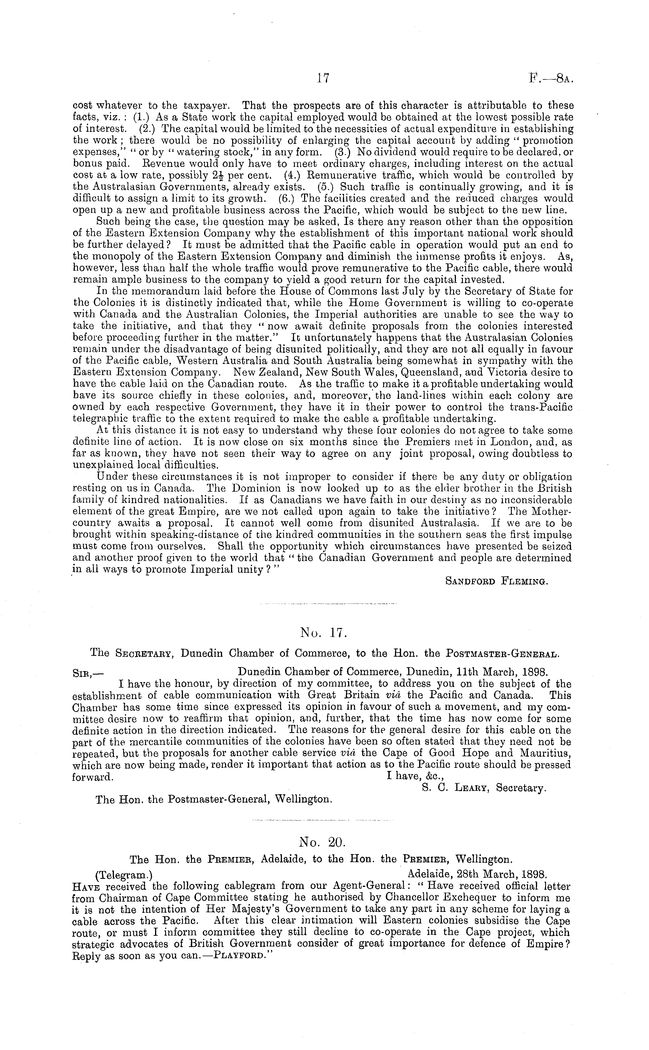 No. 17. The Secretary, Dunedin Chamber of Commerce, to the Hon. the Postmaster-General. Sir, — Dunedin Chamber of Commerce, Dunedin, 11th March, 1898. I have the honour, by direction of my committee, to address you on the subject of the establishment of cable communication with Great Britain vid the Pacific and Canada. This Chamber has some time since expressed its opinion in favour of such a movement, and my committee desire now to reaffirm that opinion, and, further, that the time has now come for some definite action in the direction indicated. The reasons for the general desire for this cable on the part of the mercantile communities of the colonies have been so often stated that they need not be repeated, but the proposals for another cable service vid the Cape of Good Hope and Mauritius, which are now being made, render it important that action as to the Pacific route should be pressed forward. I have, &c, S. C. Leary, Secretary. The Hon. the Postmaster-General, Wellington.