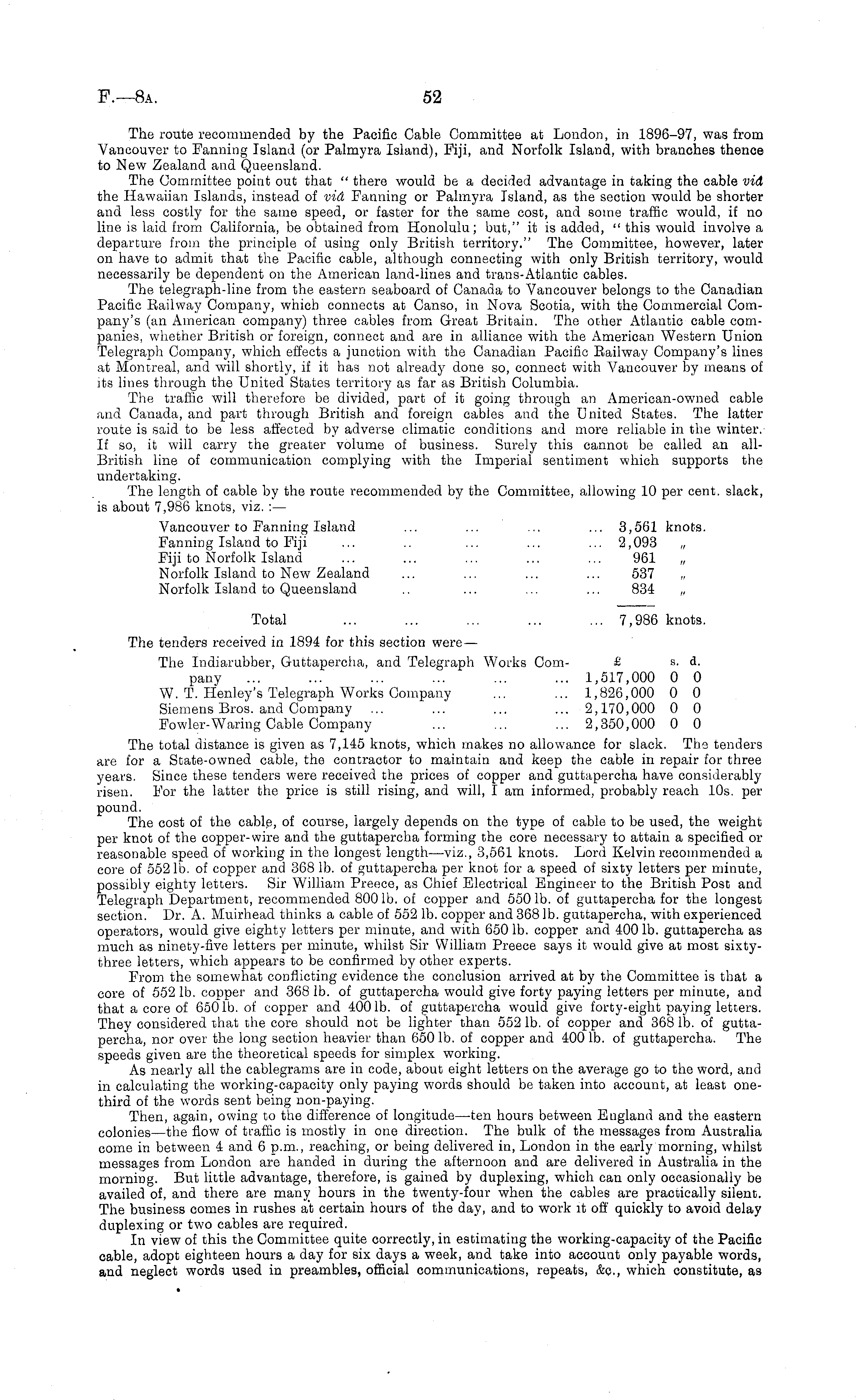 The route recommended by the Pacific Cable Committee at London, in 1896-97, was from Vancouver to Fanning Island (or Palmyra Island), Fiji, and Norfolk Island, with branches thence to New Zealand and Queensland. The Committee point out that " there would be a decided advantage in taking the cable vid the Hawaiian Islands, instead of vid Fanning or Palmyra Island, as the section would be shorter and less costly for the same speed, or faster for the same cost, and some traffic would, if no line is laid from California, be obtained from Honolulu; but," it is added, " this would involve a departure from the principle of using only British territory." The Committee, however, later on have to admit that the Pacific cable, although connecting with only British territory, would necessarily be dependent on the American land-lines and trans-Atlantic cables. The telegraph-line from the eastern seaboard of Canada to Vancouver belongs to the Canadian Pacific Bailway Company, which connects at Canso, in Nova Scotia, with the Commercial Company's (an American company) three cables from Great Britain. The other Atlantic cable companies, whether British or foreign, connect and are in alliance with the American Western Union Telegraph Company, which effects a junction with the Canadian Pacific Bailway Company's lines at Montreal, and will shortly, if it has not already done so, connect with Vancouver by means of its lines through the United States territory as far as British Columbia. The traffic will therefore be divided, part of it going through an American-owned cable and Canada, and part through British and foreign cables and the United States. The latter route is said to be less affected by adverse climatic conditions and more reliable in the winter. If so, it will carry the greater volume of business. Surely this cannot be called an allBritish line of communication complying with the Imperial sentiment which supports the undertaking. The length of cable by the route recommended by the Committee, allowing 10 per cent, slack, is about 7,986 knots, viz. : — Vancouver to Fanning Island ... ... ... ... 3,561 knots. Fanning Island to Fiji ... .. ... ... ... 2,093 Fiji to Norfolk Island ... ... ... ... ... 961 Norfolk Island to New Zealand ... ... ... ... 537 Norfolk Island to Queensland .. ... ... ... 834 „ Total ... ... ... ... ... 7,986 knots. The tenders received in 1894 for this section were — The Indiarubber, Guttapercha, and Telegraph Works Com- £ s. d. pany ... ... ... ... ... ... 1,517,000 0 0 W. T. Henley's Telegraph Works Company ... ... 1,826,000 0 0 Siemens Bros, and Company ... ... ... ... 2,170,000 0 0 Fowler-Waring Cable Company ... ... ... 2,350,000 0 0 The total distance is given as 7,145 knots, which makes no allowance for slack. The tenders are for a State-owned cable, the contractor to maintain and keep the cable in repair for three years. Since these tenders were received the prices of copper and guttapercha have considerably risen. For the latter the price is still rising, and will, lam informed, probably reach 10s. per pound. The cost of the cable, of course, iargely depends on the type of cable to be used, the weight per knot of the copper-wire and the guttapercha forming the core necessary to attain a specified or reasonable speed of working in the longest length—viz., 3,561 knots. Lord Kelvin recommended a core of 552 lb. of copper and 368 lb. of guttapercha per knot for a speed of sixty letters per minute, possibly eighty letters. Sir William Preece, as Chief Electrical Engineer to the British Post and Telegraph Department, recommended 800 lb. of copper and 550 lb. of guttapercha for the longest section. Dr. A. Muirhead thinks a cable of 552 lb. copper and 368 lb. guttapercha, with experienced operators, would give eighty letters per minute, and with 650 lb. copper and 400 lb. guttapercha as much as ninety-five letters per minute, whilst Sir William Preece says it would give at most sixtythree letters, which appears to be confirmed by other experts. From the somewhat conflicting evidence the conclusion arrived at by the Committee is that a core of 552 lb. copper and 368 lb. of guttapercha would give forty paying letters per minute, and that a core of 6501b. of copper and 4001b. of guttapercha would give forty-eight paying letters. They considered that the core should not be lighter than 552 lb. of copper and 368 lb. of guttapercha, nor over the long section heavier than 650 lb. of copper and 400 lb. of guttapercha. The speeds given are the theoretical speeds for simplex working. As nearly all the cablegrams are in code, about eight letters on the average go to the word, and in calculating the working-capacity only paying words should be taken into account, at least onethird of the words sent being non-paying. Then, again, owing to the difference of longitude—ten hours between England and the eastern colonies —the flow of traffic is mostly in one direction. The bulk of the messages from Australia come in between 4 and 6 p.m., reaching, or being delivered in, London in the early morning, whilst messages from London are handed in during the afternoon and are delivered in Australia in the morning. But little advantage, therefore, is gained by duplexing, which can only occasionally be availed of, and there are many hours in the twenty-four when the cables are practically silent. The business comes in rushes at certain hours of the day, and to work it off quickly to avoid delay duplexing or two cables are required. In view of this the Committee quite correctly, in estimating the working-capacity of the Pacific cable, adopt eighteen hours a day for six days a week, and take into account only payable words, and neglect words used in preambles, official communications, repeats, &c., which constitute, as