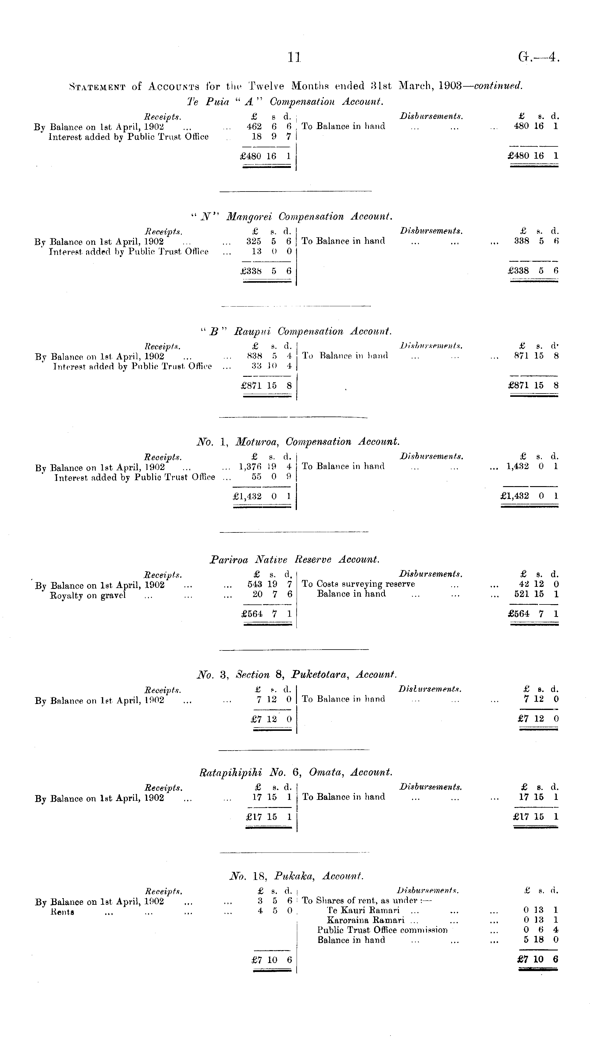 "_B " Raupui Compensation Account. Receipts. £ s. d. I Disbursements. £ b. d . By Balance on Ist April, 1902 ... ... 838 5 4 To Balance in Imnd ... ... ... 87115 8 Interest added by Public Trust Office ... 33 10 4 £871 15 8 £871 15 8