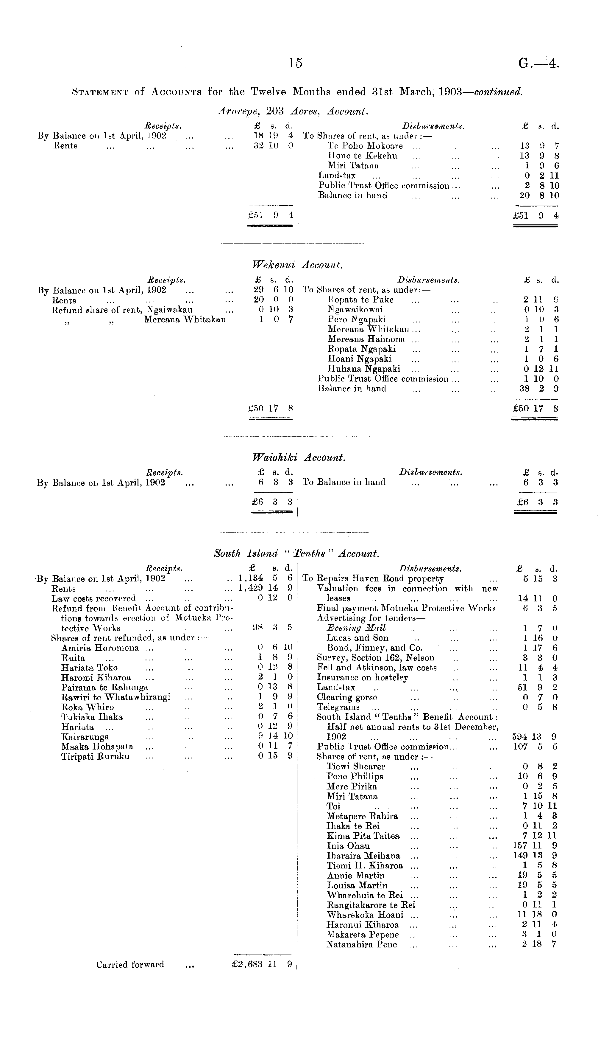 Statement of Accounts for the Twelve Months ended 31st March, 1903 — continued. Ararepe, 203 Acres, Account. Receipts. £ s. d. ! Disbursements. £ s. d. By Balance on Ist April, 1902 ... ... 18 19 4J To Shares of rent, as under:— Rents ... ... ... ... 32 10 0 ; Tβ Poho Mokoare ... .. ... 13 9 7 Hone te Kekehu ... ... ... 13 9 8 Miri Tatana ... ... ... 196 Land-tax ... ... 0 2 11 Public Trust Office commission ... ... 2 8 10 Balance in hand ... ... ... 20 8 10 £51 9 4 £51 9 4