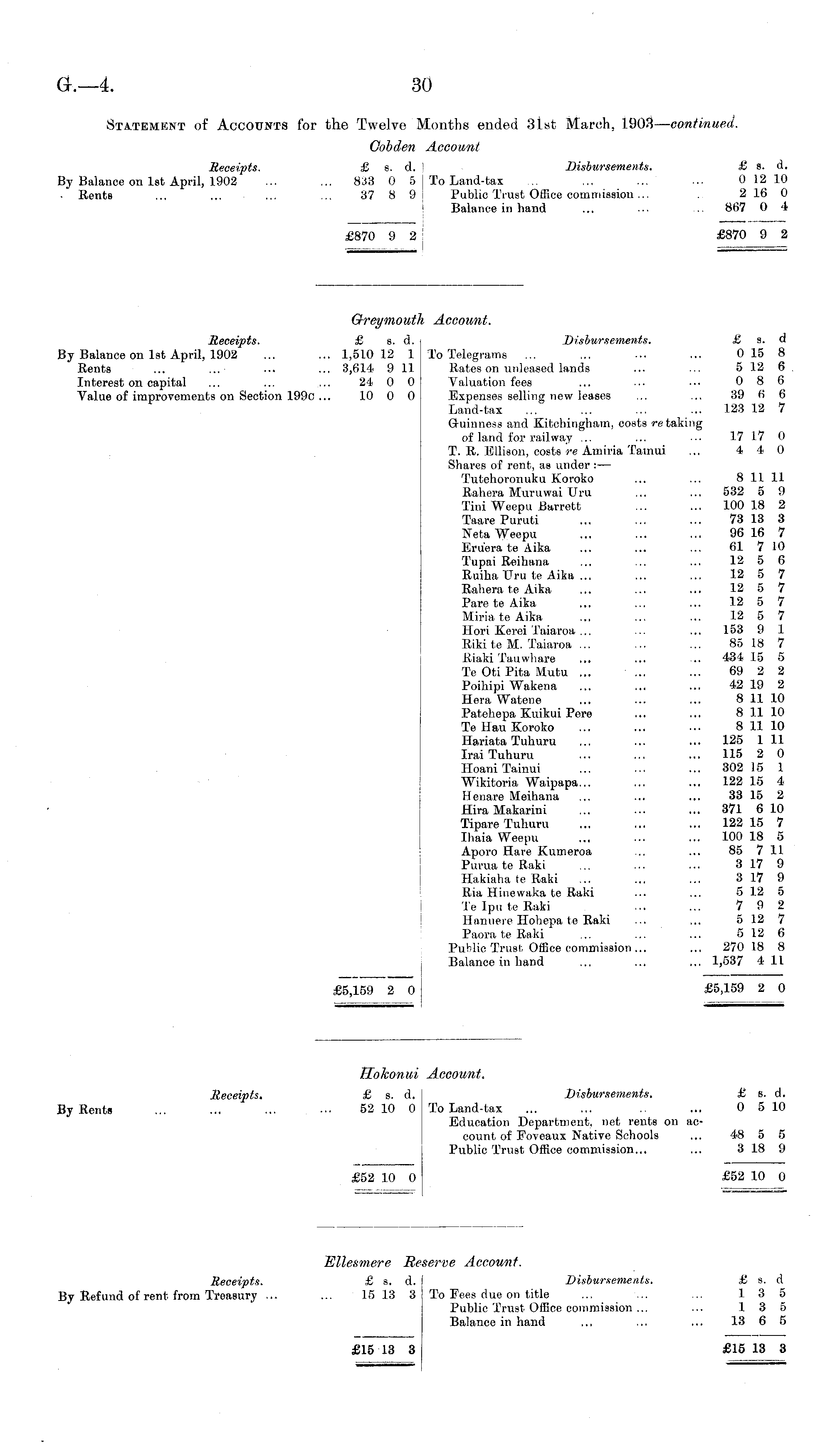 Ellesmere Reserve Account. Receipts. £ s. d. I Disbursements. £ s. d By Refund of rent from Treasury ... ... 15 13 3To Fees due on title ... ... ... 135 Public Trust Office commission ... ... 13 5 Balance in hand ... ... ... 13 6 5 £15 13 3 £15 13 3