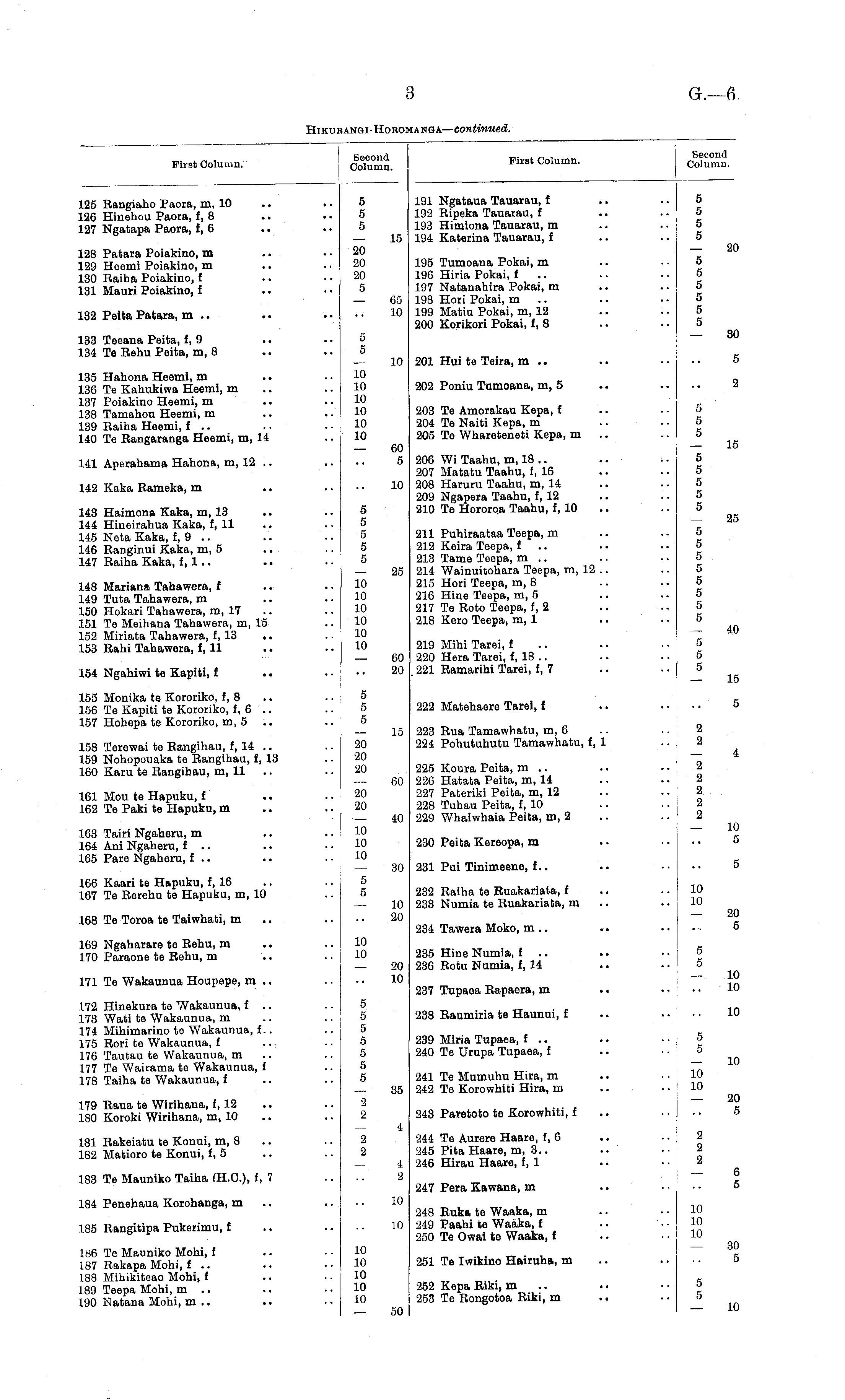 First Column. Second Column. First Column. Second Column. 125 Rangiaho Paora, m, 10 126 Hinehou Paora, f, 8 127 Ngatapa Paora, i , 6 5 5 5 191 Ngataua Tauarau, £ 192 Ripeka Tauarau, t 193 Himiona Tauarau, m 194 Katerina Tauarau, f 5 5 5 5 128 Patara Poiakino, m 129 Heemi Poiakino, m 130 Raiha Poiakino, f 131 Mauri Poiakino, £ 20 20 20 5 15 195 Tumoana Pokai, m 196 Hiria Pokai, f .. 197 Natanahira Pokai, m 198 Hori Pokai, m 199 Matiu Pokai, m, 12 200 Korikori Pokai, i, 8 5 5 5 5 5 5 20 132 Peita Patara, m .. 65 10 133 Teeana Peita, f, 9 134 Tβ Rehu Peita, m, 8 5 5 30 10 201 Hui te Teira, m .. 5 135 Hahona Heemi, m 136 Te Kahukiwa Heemi, m 137 Poiakino Heemi, m 138 Tamahou Heemi, m 139 Raiha Heemi, f .. 140 Te Rangaranga Heemi, m, 14 10 10 10 10 10 10 202 Poniu Tumoana, m, 5 203 Te Amorakau Kepa, f 204 Te Naiti Kepa, m 205 Te Whareteneti Kepa, m 5 5 5 2 141 Aperahama Hahona, m, 12 60 5 10 206 Wi Taahu, m, 18.. 207 Matatu Taahu, f, 16 208 Haruru Taahu, m, 14 209 Ngapera Taahu, f, 12 210 Te Hororqa Taahu, f, 10 5 5 5 5 5 15 142 Kaka Rameka, m 143 Haimona Kaka, m, 13 144 Hineirahua Kaka, f, 11 145 NetaKaka, f, 9 .. 146 Ranginui Kaka, m, 5 147 Raiha Kaka, f , 1 .. 5 5 5 5 5 211 Puhiraataa Teepa, m 212 Keira Teepa, I .. 213 Tame Teepa, m .. 214 Wainuitohara Teepa, m, 12 .. 215 Hori Teepa, m, 8 216 Hine Teepa, m, 5 217 Te Roto Teepa, f, 2 218 Kero Teepa, m, 1 5 5 5 5 5 5 5 5 25 25 148 Mariana Tahawera, i 149 Tuta Tahawera, m 150 Hokari Tahawera, m, 17 151 Te Meihana Tahawera, m, 15 152 Miriata Tahawera, f, 13 153 Rahi Tahawera, f, 11 10 10 10 10 10 10 219 Mihi Tarei, f 220 Hera Tarei, f, 18 .. 221 Ramarihi Tarei, f, 7 5 5 5 40 154 Ngahiwi te Kapiti, i 60 20 15 155 Monika te Kororiko, f, 8 156 Te Kapiti te Kororiko, £,6 157 Hohepa te Kororiko, m, 5 5 5 5 222 Matehaere Tarei, f 5 20 20 20 15 223 Rua Tamawhatu, m, 6 224 Pohutuhutu Tamawhatu, f, 1 2 2 158 Terewai te Rangihau, f, 14 159 Nohopouaka te Rangihau, f, 13 160 Karu te Rangihau, m, 11 225 Koura Peita, m .. 226 Hatata Peita, m, 14 227 Pateriki Peita, m, 12 228 Tuhau Peita, f, 10 229 Whaiwhaia Peita, m, 2 2 2 2 2 2 4 60 161 Mou te Hapuku, f 162 Te Paki te Hapuku, m 20 20 163 Tairi Ngaheru, m 164 Ani Ngaheru, f .. 165 Pare Ngaheru, t .. 10 10 10 40 230 Peita Kereopa, m 10 5 5 5 30 231 Pui Tinimeene, i.. 5 166 Kaari te H&puku, f, 16 167 Te Rerehu te Hapuku, m, 10 232 Raiha te Ruakariata, f 233 Numia te Ruakariata, m 10 10 168 Te Toroa te Taiwhati, m 10 20 20 5 234 Tawera Moko, m .. 169 Ngaharare te Rehu, m 170 Paraone te Rehu, m 10 10 235 Hine Numia, f .. 236 Rotu Numia, f, 14 5 5 171 Te Wakaunua Houpepe, m .. 20 10 10 10 237 Tupaea Rapaera, m 172 Hinekura te Wakaunua, f .. 173 Wati te Wakaunua, m 174 Mihimarino te Wakaunua, f.. 175 Rori te Wakaunua, f 176 Tautau te Wakaunua, m 177 Te Wairama te Wakaunua, I 178 Taiha te Wakaunua, i 5 5 5 5 5 5 5 238 Raumiria te Haunui, f 239 Miria Tupaea, f .. 240 Te Urupa Tupaea, f 5 5 10 241 Te Mumuhu Hira, m 242 Te Korowhiti Hira, m 10 10 10 35 179 Raua te Wirihana, f, 12 180 Koroki Wirihana, m, 10 •2 2 20 243 Paretoto te Korowhiti, f 4 244 Te Aurere Haare, f, 6 245 Pita Haare, m, 3.. 246 Hirau Haare, f, 1 2 2 2 181 Rakeiatu te Kouui, m, 8 182 Matioro te Konui, f, 5 2 2 183 Tβ Mauniko Taiha (H.C.), t, 7 4 2 6 247 Pera Kawana, m 5 184 Penehaua Korohanga, m 10 248 Ruka te Waaka, m 249 Paahi te Waaka, f 250 Tβ Owai te Waaka, t 10 10 10 185 Rangitipa Pukerimu, f 10 186 Te Mauniko Mohi, f 187 Rakapa Mohi, f .. 188 Mihikiteao Mohi, f 189 Teepa Mohi, m .. 190 Natana Mohi, m .. 10 10 10 10 10 251 Tβ Iwikino Hairuha, m 5 5 30 5 252 Kepa Riki, m 253 Te Rongotoa Riki, m 10