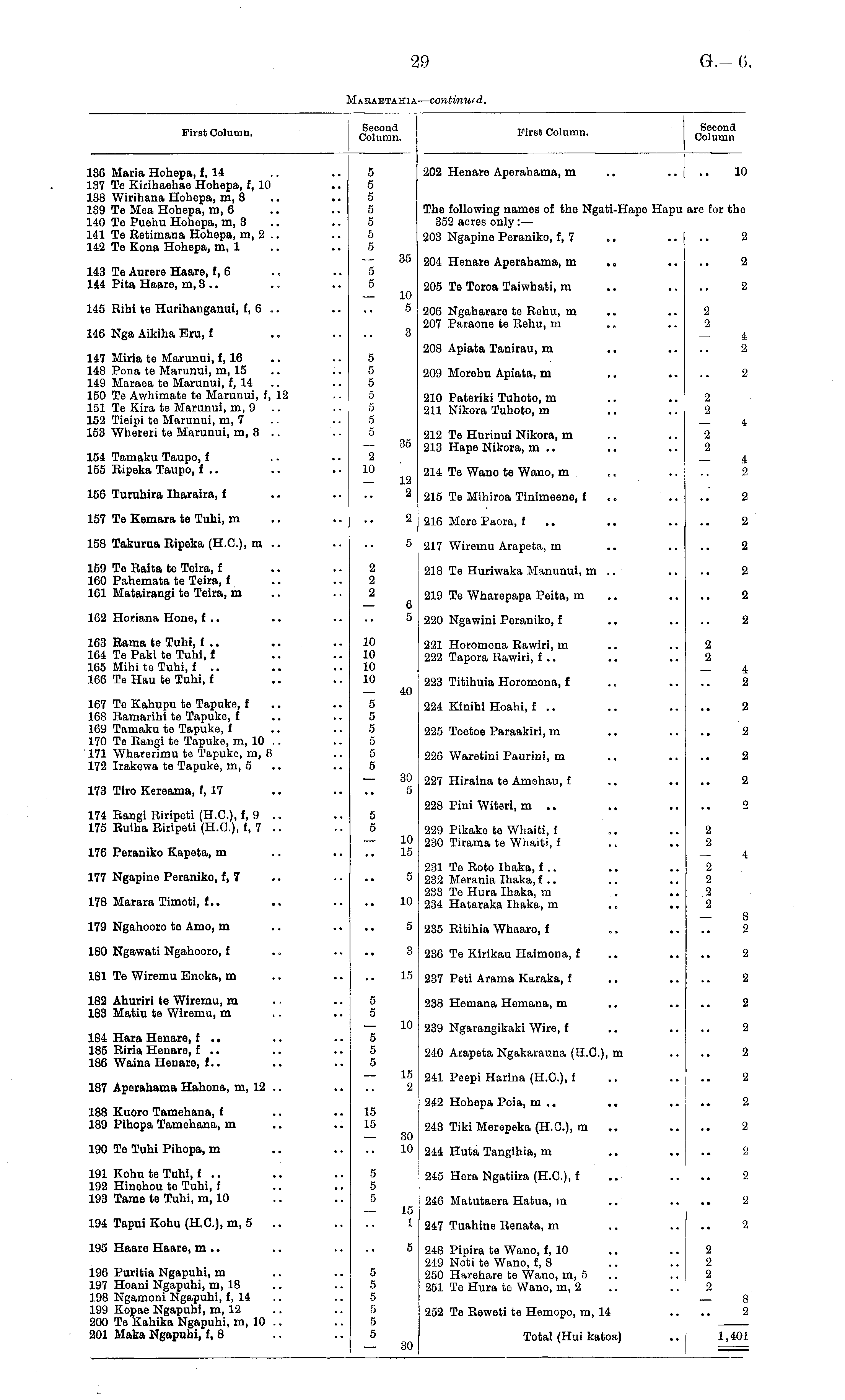 First Column. Second Column. First Column. SeconS Column 136 Maria Hohepa, f, 14 137 Te Kirihaehae Hohepa, f, 10 138 Wirihana Hohepa, m, 8 139 Te Mea Hohepa, m, 6 140 Te Puehu Hohepa, m, 3 141 Te Retimana Hohepa, m, 2 .. 142 Te Kona Hohepa, m, 1 5 5 5 5 5 5 5 202 Henare Aperahama, m .. .... 10 The following names of the Ngati-Hape Hapu are for the 352 acres only:— 203 Ngapine Peraniko, f, 7 .. .... 2 143 Te Aurere Haare, f, 6 144 Pita Haare, m, 3 .. 5 5 35 204 Henace Aperahama, m .. .... 2 205 Te Toroa Taiwhati, m .. .... 2 145 Rihi te Hurihanganui, f, 6 .. 10 5 206 Ngaharare te Rehu, m .. .. 2 207 Paraone te Rehu, m .. 2 146 Nga Aikiha Era, t 3 4 208 Apiata Tanirau, m .. .... 2 147 Miria te Marunui, f, 16 148 Pona te Marunui, m, 15 149 Maraea te Marunui, f, 14 150 Te Awhimate te Marunui, f, 12 151 Te Kira te Marunui, m, 9 152 Tieipi te Marunui, m, 7 153 Whereri te Marunui, m, 3 5 5 5 5 5 5 5 209 Morehu Apiata, m .. .. .. 2 210 Pateriki Tuhoto, m .. .. 2 211 Nikora Tuhoto, m .. .. 2 4 212 Te Hurinui Nikora, m .. .. 2 213 Hape Nikora, m .. .. .. 2 154 Tamaku Taupo, f 155 Ripeka Taupo, f .. 2 10 35 214 Te Wano te Wano, m .. .... 2 156 Turuhira Iharaira, f 12 2 215 Te Mihiroa Tinimeene, f .... 2 157 Te Kemara te Tuhi, m 2 216 Mere Paora, f .. .... 2 158 Takurua Ripeka (H.C.), m .. 5 217 Wiremu Arapeta, m .. .... 2 159 Te Raita te Teira, f 160 Pahemata te Teira, f 161 Matairangi te Teira, m 2 2 2 218 Te Huriwaka Manunui, m .. .. .. 2 219 Te Wharepapa Peita, m .. .. .. 2 162 Horiana Hone, f .. 6 5 220 Ngawini Peraniko, f .. .... 2 163 Eama te Tuhi, f .. 164 Te Paki te Tuhi, I 165 Mihi teTuhi, f .. 166 Te Hau te Tuhi, f 10 10 10 10 221 Horomona Rawiri, m .. .. 2 222 Tapora Rawiri, f .. .. .. 2 — 4 223 Titihuia Horomona, i ., .... 2 167 Te Kahupu te Tapuke, f 168 Ramarihi te Tapuke, f 169 Tamaku te Tapuke, f 170 Te Rangi te Tapuke, m, 10 171 Wharerimu te Tapuke, m, 8 172 Irakewa te Tapuke, m, 5 5 5 5 5 5 5 40 224 Kinihi Hoahi, f .. .. .... 2 225 Toetoe Paraakiri, m .. .... 2 226 Waretini Paurini, m .. .. .. 2 173 Tiro Kereama, £,17 30 5 227 Hiraina te Amohau, £ .. .... 2 174 Rangi Riripeti (H.C.), f, 9 175 Ruiha Riripeti (H.G.), £,7 5 5 228 Pini Witeri, m .. .. .. .. 2 10 15 229 Pikake te Whaiti, f .. .. 2 230 Tirama te Whaiti, f .. .. 2 176 Peraniko Kapeta, m — 4 177 Ngapine Peraniko, f, 7 5 231 Te Roto Ihaka, f .. .. .. 2 232 Merania Ihaka.f.. .. .. 2 233 Te Hura Ihaka, m ,. 2 234 Hataraka Ihaka, m .. .. 2 178 Marara Timoti, f.. 10 179 Ngahooro te Amo, m 5 — 8 235 Ritihia Whaaro, f ., .... 2 180 Ngawati Ngahooro, f 3 236 Te Kirikau Haimona, f .. .. .. 2 181 Te Wiremu Enoka, m 15 237 Peti Arama Karaka, f .. .... 2 182 Ahuriri te Wiremu, m 183 Matiu te Wiremu, m 5 5 233 Hemana Hemana, m .. .. .. 2 184 Hara Henare, f .. 185 Riria Henare, f .. 186 Waina Henare, f.. 5 5 5 10 239 Ngarangikaki Wire, f .. .... 2 240 Arapeta Ngakarauna (H.O.), m .. .. 2 187 Aperahama Hahona, m, 12 15 2 241 Peepi Harina (H.C.), £ .. .... 2 188 Kuoro Tamehana, f 189 Pihopa Tamehana, m 15 15 242 Hohepa Poia, m .. .. .. .. 2 243 Tiki Merepeka (H.O.), m .. .... 2 190 Te Tuhi Pihopa, m 30 10 244 Huta Tangihia, m .. .... 2 191 Kohu te Tuhi, i .. 192 Hinehou te Tuhi, f 193 Tame te Tuhi, m, 10 5 5 5 245 Hera Ngatiira (H.C.), £ .. •• •• 2 246 Matutaera Hatua, m 194 Tapui Kohu (H,C), m, 5 15 1 247 Tuahine Renata, m .. .... 2 195 Haare Haare, m .. 5 248 Pipira te Wano, f, 10 .. .. 2 249 Noti te Wano, £,8 .. .. 2 250 Harehare te Wano, m, 5 .. .. 2 251 Te Hura te Wano, m, 2 .. .. 2 196 Puritia Ngapuhi, m 197 Hoani Ngapuhi, m, 18 198 Ngamoni Ngapuhi, f, 14 199 Kopae Ngapuhi, m, 12 200 Te Kahika Ngapuhi, m, 10 201 Maka Ngapuhi, f, 8 5 5 5 6 5 5 — 8 252 Te Reweti te Hemopo, m, 14 .... 2 Total (Hui katoa) .. 1,401 30