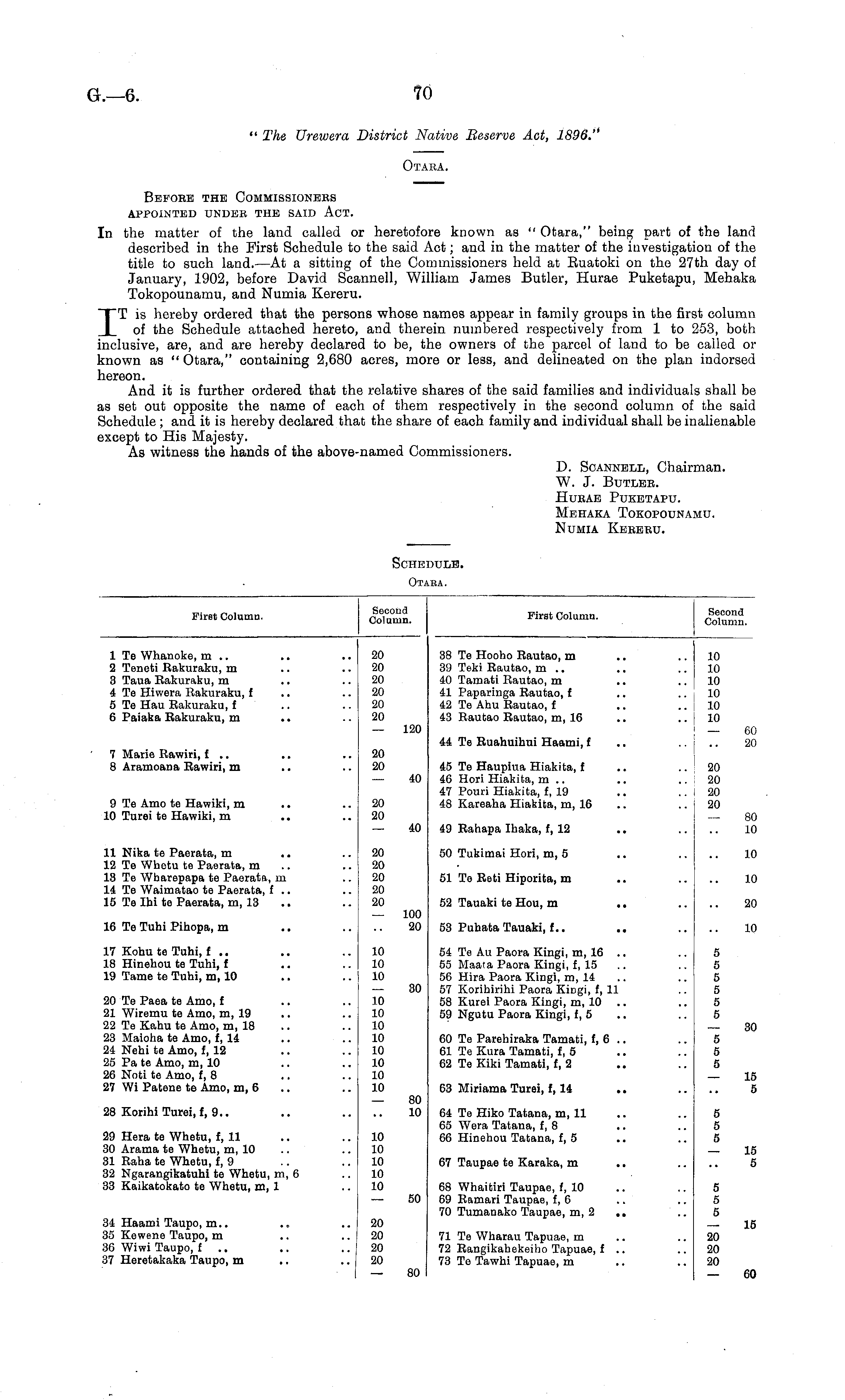 Before the Commissionebs appointed undeb the said act. In the matter of the land called or heretofore known as " Otara," being part of the land described in the First Schedule to the said Act; and in the matter of the investigation of the title to such land.—At a sitting of the Commissioners held at Euatoki on the 27th day of January, 1902, before David Scannell, William James Butler, Hurae Puketapu, Mehaka Tokopounamu, and Numia Kereru. IT is hereby ordered that the persons whose names appear in family groups in the first column of the Schedule attached hereto, and therein numbered respectively from 1 to 253, both inclusive, are, and are hereby declared to be, the owners of the parcel of land to be called or known as " Otara," containing 2,680 acres, more or less, and delineated on the plan indorsed hereon. And it is further ordered that the relative shares of the said families and individuals shall be as set out opposite the name of each of them respectively in the second column of the said Schedule ; and it is hereby declared that the share of each family and individual shall be inalienable except to His Majesty. As witness the hands of the above-named Commissioners. D. Scannell, Chairman. w. j. butleb. Hueae Puketapu. Mehaka Tokopounamu. Numia Kebebu.