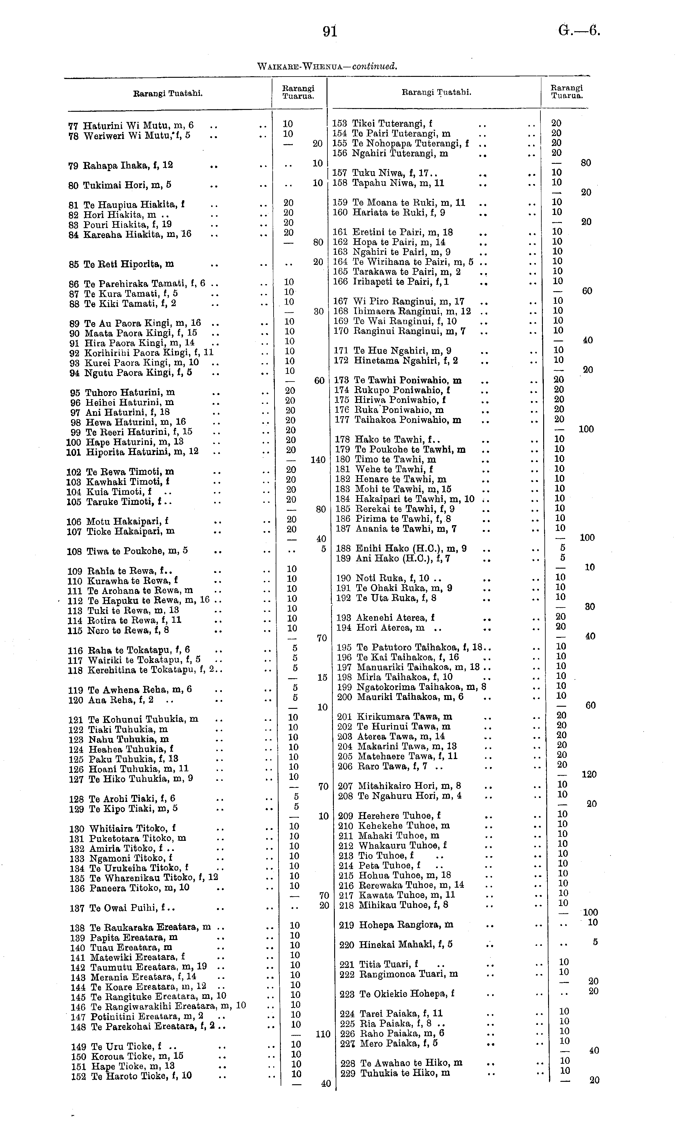 Karangi Tuatahi. Rarangi Tuarua. Rarangi Tuatahi. Rarangi Tuarua. 77 Haturini Wi Mutu, m, 6 78 Weriweri Wi Mutu.'f, 5 10 10 153 Tikei Tuterangi, f 154 Tβ Pairi Tuterangi, m 155 Te Nohopapa Tuterangi, f .. 156 Ngahiri Tuterangi, m 20 20 20 20 20 79 Kahapa Ihaka, f, 12 10 10 10 80 80 Tukimai Hori, m, 5 10 157 TukuNiwa, f, 17.. 158 Tapahu Niwa, m, 11 81 Tβ Haupiua Hiakita, £ 82 Hori Hiakita, m .. 83 Pouri Hiakita, f, 19 84 Kareaha Hiakita, m, 16 20 20 20 20 159 Tβ Moana te Buki, m, 11 160 Hariata te Ruki, f, 9 10 10 20 85 Tβ Beti Hiporita, m 80 161 Eretini te Pairi, m, 18 162 Hopa te Pairi, m, 14 163 Ngahiri te Pairi, m, 9 164 Tβ Wirihana te Pairi, m, 5 .. 165 Tarakawa te Pairi, m, 2 166 Irihapeti te Pairi, f, 1 10 10 10 10 10 10 20 20 86 Tβ Parehiraka Tamati, f, 6 .. 87 Te Kura Tamati, I, 5 88 Tβ Kiki Tamati, f, 2 10 10 10 60 89 Tβ Au Paora Kingi, m, 16 90 Maata Paora Kingi, £,15 91 Hira Paora Kingi, m, 14 92 Korihiribi Paora Kingi, f, 11 93 Kurei Paora Kingi, m, 10 94 Ngutu Paora Kingi, £,5 10 10 10 10 10 10 30 167 Wi Piro Ranginui, m, 17 168 Ihimaera Ranginui, m, 12 169 Tβ Wai Rauginui, f, 10 170 Ranginui Ranginui, m, 7 10 10 10 10 171 Te Hue Ngahiri, m, 9 172 Hinetama Ngahiri, f, 2 10 10 40 95 Tuhoro Haturini, m 96 Heihei Haturini, m 97 Ani Haturini, f, 18 98 Hewa Haturini, m, 16 99 Tβ Reeri Haturini, f, 15 100 Hape Haturini, m, 13 101 Hiporita Haturini, m, 12 20 20 20 20 20 20 20 60 173 Te Tawhi Poniwahio, m 174 Rukupo Poniwahio, f 175 Hiriwa Poniwahio, £ 176 Ruka Poniwahio, m 177 Taihakoa Poniwahio, m 20 20 20 20 20 20 102 Tβ Rewa Timoti, m 103 Kawhaki Timoti, i 104 Kuia Timoti, f .. 105 Taruke Timoti, f .. 20 20 20 20 140 178 Hako te Tawhi, f.. 179 Tβ Poukohe te Tawhi, m 180 Tirno te Tawhi, m 181 Wehe te Tawhi, f 182 Henare te Tawhi, m 183 Mohi te Tawhi, m, 15 184 Hakaipari te Tawhi, m, 10 t . 185 Rerekai te Tawhi, f, 9 186 Pirima te Tawhi, f, 8 187 Anania te Tawhi, m, 7 10 10 10 10 10 10 10 10 10 10 100 106 Motu Hakaipari, £ 107 Tioke Hakaipari, m 20 20 80 108 Tiwa te Poukohe, m, 5 40 5 188 Enihi Hako (H.O.), m, 9 189 Ani Hako (H.O.), f, 7 5 5 100 109 Rahia te Rewa, f.. 110 Kurawha te Rewa, f 111 Tβ Arohana te Rewa, m 112 Te Hapuku te Rewa, m, 16 .. 113 Tuki te Rewa, m, 13 114 Rotira te Rewa, £,11 115 Nero te Rewa, £,8 10 10 10 10 10 10 10 190 Noti Ruka, f, 10 .. 191 Te Ohaki Ruka, m, 9 192 Te UtaRuka, f, 8 10 10 10 10 30 193 Akenehi Aterea, £ 194 Hori Aterea, m .. 20 20 116 Raha te Tokatapu, f, 6 117 Wairiki te Tokatapu, £,5 118 Kerehitina te Tokatapu, f, 2.. 5 5 5 70 195 Tβ Patutoro Taihakoa, £,18.. 196 Tβ Kai Taihakoa, f, 16 197 Manuariki Taihakoa, m, 13 .. 198 Miria Taihakoa, f, 10 199 Ngatokorima Taihakoa, m, 8 200 Mauriki Taihakoa, m, 6 10 10 10 10 10 10 40 15 119 Te Awhena Reha, m, 6 120 Ana Seha, f, 2 .. 5 5 121 Tβ Kohunui Tuhukia, m 122 Tiaki Tuhukia, m 123 Nahu Tuhukia, m 124 Heahea Tuhukia, f 125 Paku Tuhukia, £,13 126 Hoani Tuhukia, m, 11 127 Te Hiko Tuhukia, m, 9 10 10 10 10 10 10 10 10 201 Kirikumara Tawa, m. 202 Tβ Hurinui Tawa, m 203 Aterea Tawa, m, 14 204 Makarini Tawa, m, 13 205 Matehaere Tawa, £,11 206 Raro Tawa, f, 7 .. 20 20 20 20 20 20 60 70 207 Mitahikairo Hori, m, 8 208 Te Ngahuru Hori, m, 4 10 10 120 128 Te Arohi Tiaki, £,6 129 Te Kipo Tiaki, m, 5 5 5 10 10 10 10 10 10 10 10 10 10 20 130 Whitiaira Titoko, f 131 Puketotara Titoko, m 132 Amiria Titoko, £ .. 133 Ngamoni Titoko, £ 134 Tβ Urukeiha Titoko, f 135 Te Wharenikau Titoko, f, 12 136 Paneera Titoko, m, 10 10 10 10 10 10 10 10 10 209 Herehere Tuhoe, £ 210 Kehekehe Tuhoe, m 211 Mahaki Tuhoe, m 212 Whakauru Tuhoe, i 213 Tio Tuhoe, f 214 Peta Tuhoe, f .. 215 Hohua Tuhoe, m, 18 216 Rerewaka Tuhoe, m, 14 217 Kawata Tuhoe, m, 11 218 Mihikau Tuhoe, f, 8 137 Tβ Owai Puilii, f .. 70 20 138 Tβ Raukaraka Ereatara, m .. 139 Papita Ereatara, m 140 Tuau Ereatara, m 141 Matewiki Ereatara, f 142 Taumutu Ereatara, m, 19 143 Merania Ereatara, f, 14 144 Tβ Koare Ereatara, m, 12 .. 145 Te Rangituke Ereatara, m, 10 146 Te Rangiwarakihi Ereatara, m, 10 147 Potinitini Ereatara, m, 2 148 Tβ Parekohai Ereatara, f, 2 .. 10 10 10 10 10 10 10 10 10 10 10 219 Hohepa Rangiora, m 100 10 220 Hinekai Mahaki, f, 5 5 221 TitiaTuari, £ .. 222 Rangimonoa Tuari, m 10 10 223 Tβ Okiekie Hohepa, f 20 20 224 Tarei Paiaka, f, 11 225 Ria Paiaka, f, 8 .. 226 Raho Paiaka, m, 6 221 Mero Paiaka, £,5 10 10 10 10 149 Te Uru Tioke, f .. 150 Koroua Tioke, m, 15 151 Hape Tioke, m, 13 152 Tβ Haroto Tioke, f, 10 10 10 10 10 110 228 Te Awahao te Hiko, m 229 Tuhukia te Hiko, m 10 10 40 40 20