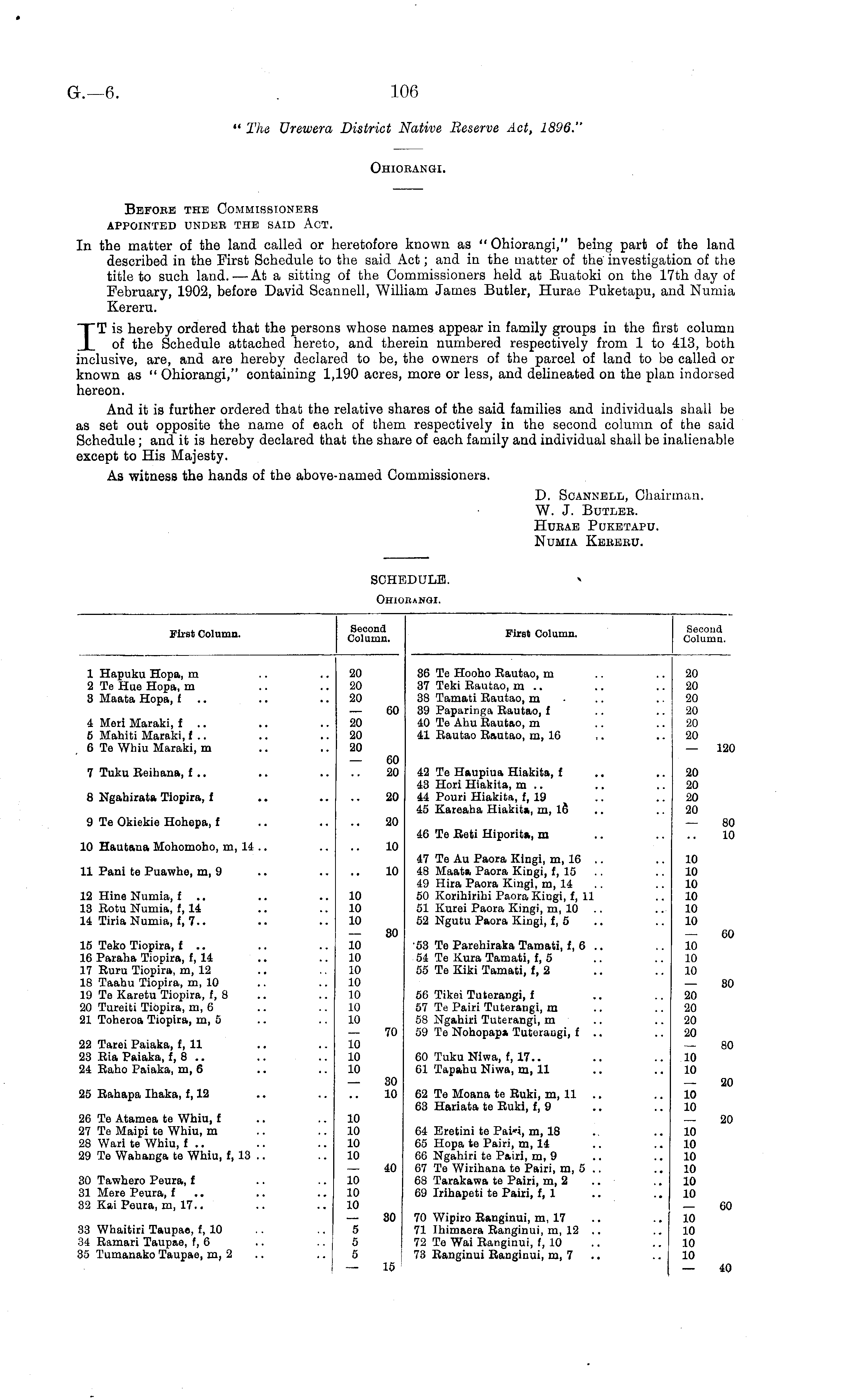 Befobb the Commissionbbs appointed dndbb the said act. In the matter of the land called or heretofore known as " Ohiorangi," being part of the land described in the First Schedule to the said Act; and in the matter of the investigation of the title to such land.—At a sitting of the Commissioners held at Euatoki on the 17th day of February, 1902, before David Scannell, William James Butler, Hurae Puketapu, and Numia Kereru. IT is hereby ordered that the persons whose names appear in family groups in the first column of the Schedule attached hereto, and therein numbered respectively from 1 to 413, both inclusive, are, and are hereby declared to be, the owners of the parcel of land to be called or known as " Ohiorangi," containing 1,190 acres, more or less, and delineated on the plan indorsed hereon. And it is further ordered that the relative shares of the said families and individuals shall be as set out opposite the name of each of them respectively in the second column of the said Schedule; and it is hereby declared that the share of each family and individual shall be inalienable except to His Majesty. As witness the hands of the above-named Commissioners. D. Scannbll, Chairman. W. J. Butlek. hubae poketapu. Numia Kebebu.
