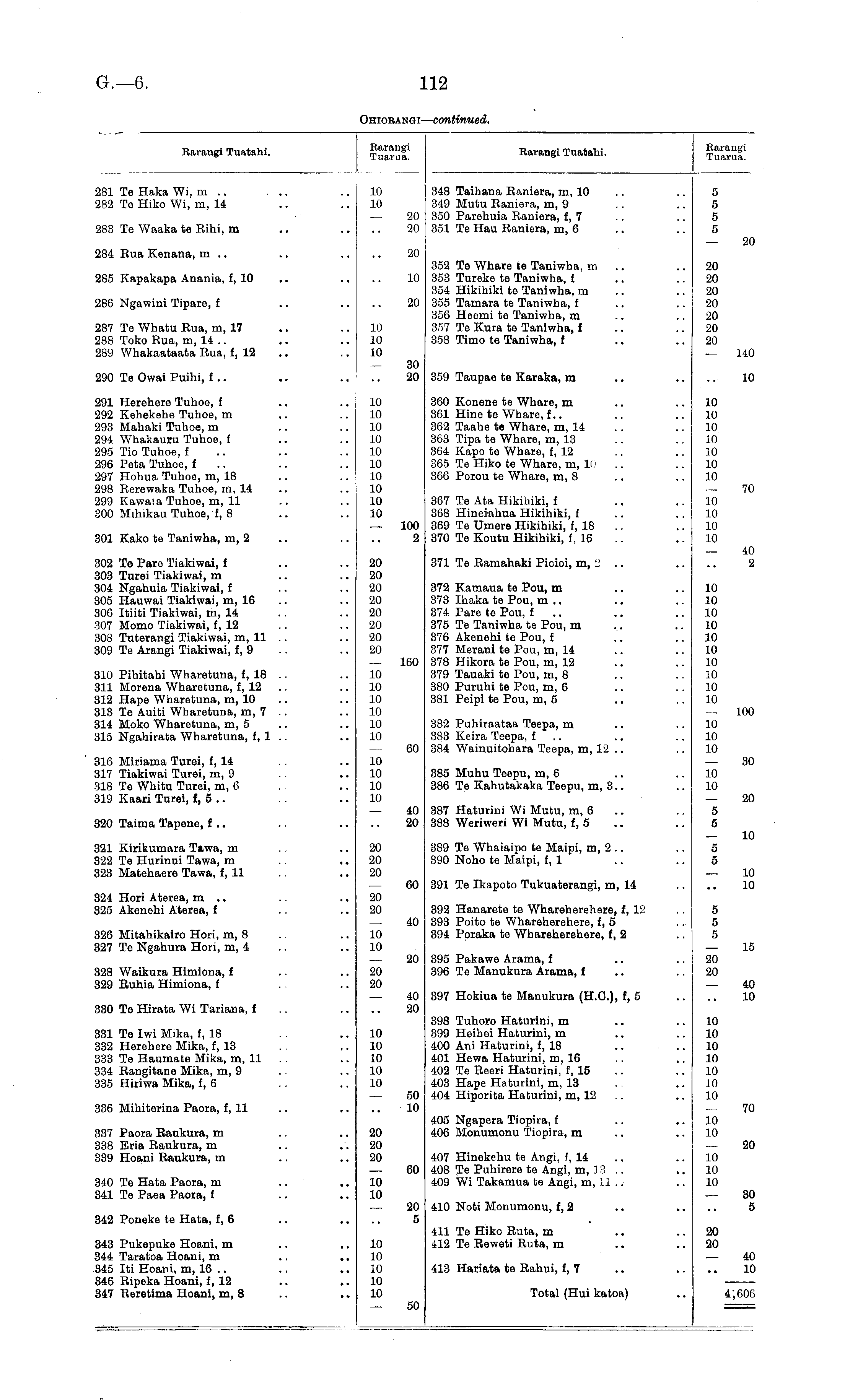 Rarangi Tuatahi. Karangi Tuaraa. Barangt Tuatahi. Karangi Tuarua. 281 Tβ Haka Wi, m .. ... 282 Tβ Hiko Wi, m, 14 10 10 348 Taihana Raniera, m, 10 349 Mutu Raniera, m, 9 350 Parehuia Raniera, f, 7 351 Te Hau Raniera, m, 6 5 5 5 5 283 Tβ Waaka te Kihi, m 20 20 284 Rua Kenaua, m .. 20 — 20 285 Kapakapa Anania, f, 10 286 Ngawini Tipare, £ 10 20 352 Te Whare te Taniwha, m .. 353 Tureke te Taniwha, f 354 Hikihiki te Taniwha, m 355 Tamara te Taniwha, f 356 Heemi te Taniwha, m 357 Te Kura te Taniwha, £ 358 Timo te Taniwha, £ 20 20 20 20 20 20 20 287 Tβ Whatu Rua, m, 17 288 Toko Rua, m, 14 .. 289 Whakaataata Rua, f, 12 10 10 10 — 140 290 Tβ Owai Puihi, £ .. 30 20 359 Taupae te Karaka, m 10 291 Herehere Tuhoe, f 292 Kehekebe Tuhoe, m 293 Mahaki Tuhoe, m 294 Whakauru Tuhoe, t 295 Tio Tuhoe, f 296 Peta Tuhoe, £ 297 Hohua Tuhoe, m, 18 298 Rerewaka Tuhoe, m, 14 299 Kawaia Tuhoe, m, 11 300 Mihikau Tuhoe, £, 8 10 10 10 10 10 10 10 10 10 10 360 Konene te Whare, m 361 Hinete Whare, f.. 362 Taahe te Whare, m, 14 363 Tipa te Whare, m, 13 364 Kapo te Whare, f, 12 365 Te Hiko te Whare, m, 10 366 Porou te Whare, m, 8 10 10 10 10 10 10 10 — 70 100 2 367 Te Ata Hikihiki, f 368 Hineiahua Hikihiki, f 369 Te Umere Hikihiki, f, 18 370 Te Koutu Hikihiki, f, 16 10 10 10 10 301 Kako te Taniwha, m, 2 302 Tβ Pare Tiakiwai, f 303 Turei Tiakiwai, m 304 Ngahuia Tiakiwai, f 305 Hauwai Tiakiwai, m, 16 306 Itiiti Tiakiwai, m, 14 307 Momo Tiakiwai, f, 12 308 Tuterangi Tiakiwai, m, 11 309 Te Arangi Tiakiwai, f, 9 20 20 20 20 20 20 20 20 371 Tβ Ramahaki Pioioi, m, 2 — 40 2 372 Kamaua te Pou, m 373 Ihaka te Pou, m .. 374 Pare te Pou, £ .. 375 Te Taniwha te Pou, m 376 Akenehi te Pou, f 377 Merani te Pou, m, 14 378 Hikora te Pou, m, 12 379 Tauaki te Pou, m, 8 380 Puruhi te Pou, m, 6 381 Peipi te Pou, m, 5 10 10 10 10 10 10 10 10 10 10 310 Pihitahi Wharetuna, f, 18 311 Morena Wharetuna, f, 12 312 Hape Wharetuna, m, 10 313 Tβ Auiti Wharetuna, m, 7 314 Moko Wharetuna, m, 5 315 Ngahirata Wharetuna, f, 1 .. 10 10 10 10 10 10 160 382 Puhiraataa Teepa, m 383 Keira Teepa, f .. 384 Wainuitohara Teepa, m, 12 — 100 10 10 10 60 316 Miriama Turei, f, 14 317 Tiakiwai Turei, m, 9 318 Te Whitu Turei, m, 6 319 Kaari Turei, f, 5 .. 10 10 10 10 385 Muhu Teepu, m, 6 386 Tβ Kahutakaka Teepu, m, 3.. — 30 10 10 40 20 387 Haturini Wi Mutu, m, 6 388 Weriweri Wi Mutu, f, 5 — 20 5 5 320 Taima Tapene, f .. 321 Kirikumara T*wa, m 322 Te Hurinui Tawa, m 323 Matehaere Tawa, f, 11 20 20 20 389 Te Whaiaipo te Maipi, m, 2 .. 390 Noho te Maipi, £,1 — 10 5 5 60 391 Te Ikapoto Tukuaterangi, m, 14 — 10 10 324 Hori Aterea, m .. 325 Akenehi Aterea, f 20 20 392 Hanarete te Whareherehere, f, 12 393 Poito te Whareherehere, £, 5 394 Poraka te Whareherehere, £, 2 5 5 5 326 Mitahikairo Hori, m, 8 327 Te Ngahura Hori, m, 4 10 10 40 20 20 20 395 Pakawe Arama, £ 396 Te Manukura Arama, £ — 15 20 20 328 Waikura Himiona, i 329 Ruhia Himiona, f — 40 10 40 20 397 Hokiua te Manukura (H.C.), f, 5 330 Te Hirata Wi Tariana, f 10 10 10 10 10 10 10 331 Tβ Iwi Mika, f, 18 332 Herehere Mika, f, 13 333 Te Haumate Mika, m, 11 334 Rangitane Mika, m, 9 335 Hiriwa Mika, f, 6 10 10 10 10 10 398 Tuhoro Haturini, m 399 Heihei Haturini, m 400 Ani Haturini, f, 18 401 Hewa Haturini, m, 16 402 Te Reeri Haturini, f, 15 403 Hape Haturini, m, 13 404 Hiporita Haturini, m, 12 336 Mihiterina Paora, f, 11 50 10 — 70 10 10 337 Paora Raukura, m 338 Eria Raukura, m 339 Hoani Raukura, m 20 20 20 405 Ngapera Tiopira, f 406 Monumonu Tiopira, m — 20 10 10 60 407 Hinekehu te Angi, f, 14 408 Te Puhirere te Angi, m, 1 3 409 Wi Takamua te Angi, m, 1.1 .. 10 10 10 340 Te Hata Paora, m 341 Te Paea Paora, f — 30 5 20 5 410 Noti Monumonu, f, 2 342 Poneke te Hata, f, 6 20 20 343 Pukepuke Hoani, m 344 Taratoa Hoani, m 345 Iti Eoani, m, 16 .. 346 Ripeka Hoani, f, 12 347 Reretima Hoani, m, 8 10 10 10 10 10 411 Te Hiko Ruta, m 412 Te Reweti Ruta, m 413 Hariata te Rahui, £,7 — 40 10 Total (Hui kafcoa) 4; 606 50