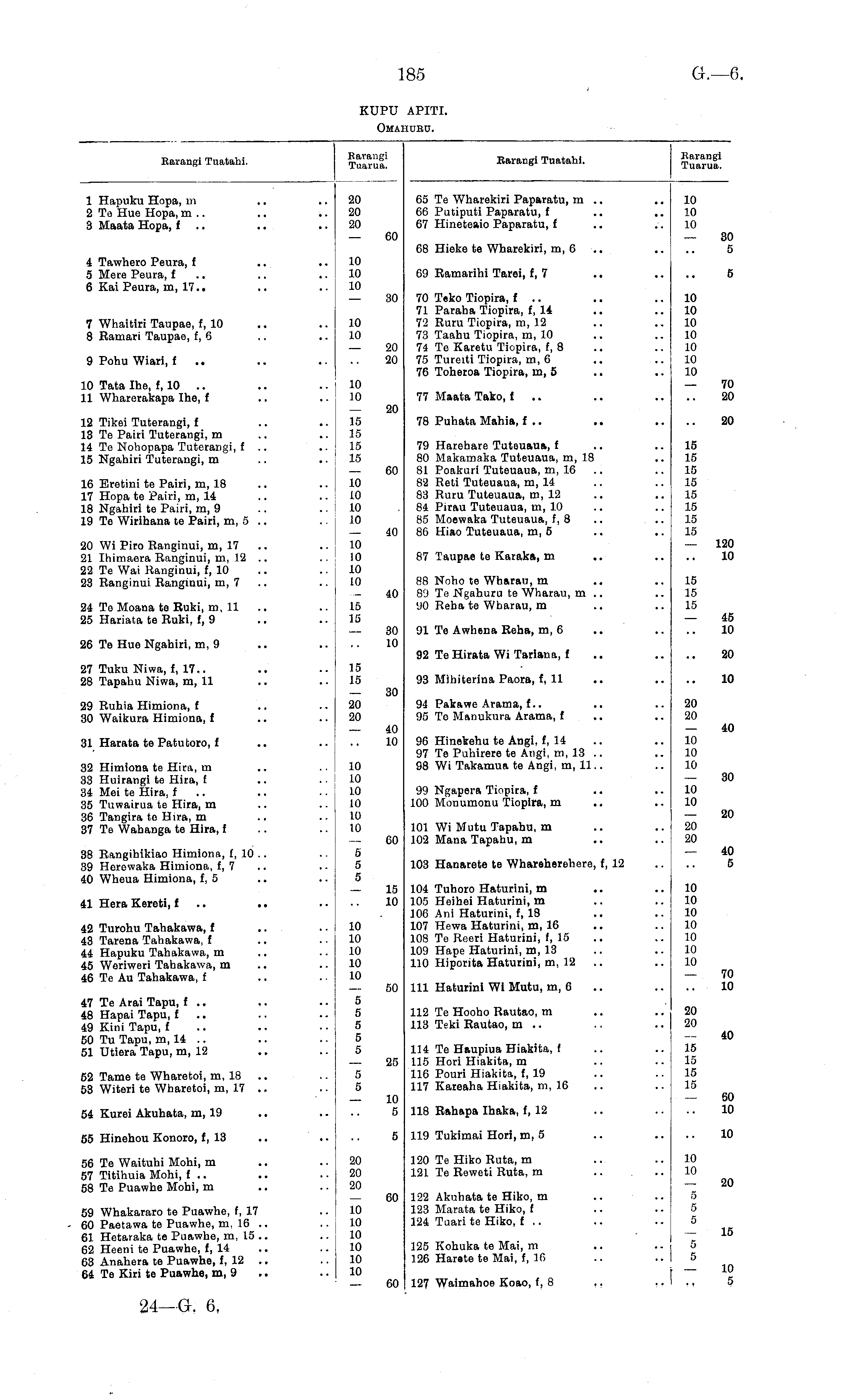 Earangl Tuatahi. Eavangi Tuarua. Barangi Tuatahi. Barangi Tuarua. 1 Hapuku Hopa, m 2 Te Hue Hopa, m .. 3 Maata Hopa, £ .. 20 20 20 65 Te Wharekiri Paparatu, m .. 66 Putiputi Paparatu, £ 67 Hineteaio Paparatu, t 10 10 10 4 Tawhero Peura, £ .. 5 Mere Peura, f 6 Kai Peura, m, 17.. 60 68 Hieke te Wharekiri, m, 6 .. 80 5 10 10 10 69 Ramarihi Tarei, f, 7 5 7 Whaitiri Taupae, £,10 8 Ramari Taupae, f, 6 10 10 30 70 Teko Tiopira, f .. 71 Paraha Tiopira, f, 14 72 Ruru Tiopira, m, 12 73 Taahu Tiopira, m, 10 74 Te Karetu Tiopira, f, 8 75 Tureiti Tiopira, m, 6 76 Toheroa Tiopira, m, 5 10 10 10 10 10 10 10 9 Pohu Wiari, £ 20 20 10 Tata Ihe, f, 10 .. 11 Wharerakapa Ihe, f 10 10 77 Maata Tako, f 70 20 12 Tikei Tuterangi, f 13 Te Pairi Tuterangi, m 14 Te Nohopapa Tuterangi, £ .. 15 Ngahiri Tuterangi, m 15 15 15 15 20 78 Puhata Mahia, f .. 15 15 15 15 15 15 15 15 20 16 Eretini te Pairi, m, 18 17 Hopa te Pairi, m, 14 18 Ngahiri te Pairi, m, 9 19 Te Wirihana te Pairi, m, 5 .. 10 10 10 10 60 79 Harehare Tuteuaua, £ 80 Makamaka Tuteuaua, m, 18 81 Poakuri Tuteuaua, m, 16 8'2 Reti Tuteuaua, m, 14 83 Ruru Tuteuaua, m, 12 81 Pirau Tuteuaua, m, 10 85 Moewaka Tuteuaua, f, 8 86 Hiao Tuteuaua, m, 5 40 20 Wi Piro Ranginui, m, 17 21 Ihimaera Ranginui, m, 12 22 Te Wai Ranginui, f, 10 23 Ranginui Ranginui, m, 7 10 10 10 10 87 Taupae te Karaka, m 120 10 15 15 40 88 Noho te Wharau, m 89 Tβ Ngahuru te Wharau, m .. UO Reba te Wharau, m 15 15 15 24 Te Moana te Ruki, m, 11 25 Hariata te Ruki, £,9 45 10 30 10 91 Te Awhena Reha, m, 6 26 Te Hue Ngahiri, m, 9 92 Te Hirata Wi Tariana, £ 20 27 Tuku Niwa, £,17.. 28 Tapahu Niwa, m, 11 15 15 93 Mihiterina Paora, f, 11 10 29 Ruhia Himiona, f 30 Waikura Himiona, t 20 20 30 94 Pakawe Arama, f.. 95 Te Manukura Arama, f 20 20 40 10 40 31 Harata te Patutoro, £ 96 Hinekehu te Angi, f, 14 97 Te Puhirere te Angi, m, 13 98 Wi Takamua te Angi, m, 11.. 10 10 10 32 Himiona te Hira, m 33 Huirangi te Hira, £ 34 Mei te Hira, f .. 35 Tuwairua te Hira, m 36 Tangira to Hira, m 37 Te Wahanga te Hira, £ 10 10 10 10 10 10 99 Ngapera Tiopira, f 100 Monumonu Tiopira, m 10 10 30 101 Wi Mutu Tapahu, m 102 Mana Tapahu, m 20 20 20 38 Rangihikiao Himiona, f, 10 .. 39 Herewaka Himiona, f, 7 40 Wheua Himiona, £,5 5 5 5 60 103 Hanarete te Whareherehere, f, 12 40 5 41 Hera Kereti, £ .. .. 42 Turohu Tahakawa, f 43 Tarena Tahakawa, f 44 Hapuku Tahakawa, m 45 Weriweri Tahakawa, m 46 Te Au Tahakawa, £ 10 10 10 10 10 15 10 104 Tuhoro Haturini, m 105 Heihei Haturini, m 106 Ani Haturini, f, 18 107 Hewa Haturini, m, 16 108 Tβ Reeri Haturini, f, 15 109 Hape Haturini, m, 13 110 Hiporita Haturini, m, 12 10 10 10 10 10 10 10 50 111 Haturini Wi Mutu, m, 6 70 10 47 Te Arai Tapu, £ .. 48 Hapai Tapu, £ .. 49 Kini Tapu, £ 50 Tu Tapu, m, 14 .. 51 Utiera Tapu, m, 12 5 5 5 5 5 112 Te Hooho Rautao, m 113 Teki Rautao, m .. 20 20 5 5 25 114 Te Haupiua Hiakita, t 115 Hori Hiakita, m 116 Pouri Hiakita, f, 19 117 Kareaha Hiakita, m, 16 15 15 15 15 40 52 Tame te Wharetoi, m, 18 53 Witeri te Wharetoi, m, 17 54 Kurei Akuhata, m, 19 10 5 118 Rahapa Ihaka, £,12 60 10 55 Hinehou Konoro, f, 13 5 119 Tukimai Hori, m, 5 10 56 Te Waituhi Mohi, m 57 Titihuia Mohi, £ .. 58 Te Puawhe Mohi, m 20 20 20 120 Te Hiko Ruta, m 121 Te Reweti Ruta, m 10 10 59 Whakararo te Puawhe, f, 17 60 Paetawa te Puawhe, m, 16 61 Hetaraka te Puawhe, m, 15 .. 62 Heeni te Puawhe, f, 14 63 Anahera te Puawhe, £,12 64 Te Kiri te Puawhe, m, 9 60 122 Akuhata te Hiko, m 123 Marata te Hiko, £ 124 Tuari te Hiko, I .. 5 5 5 20 10 10 10 10 10 10 125 Kohuka te Mai, m 126 Harete te Mai, f, 16 5 5 15 127 Waimahoe Koao, f, 8 ., 10 5 60