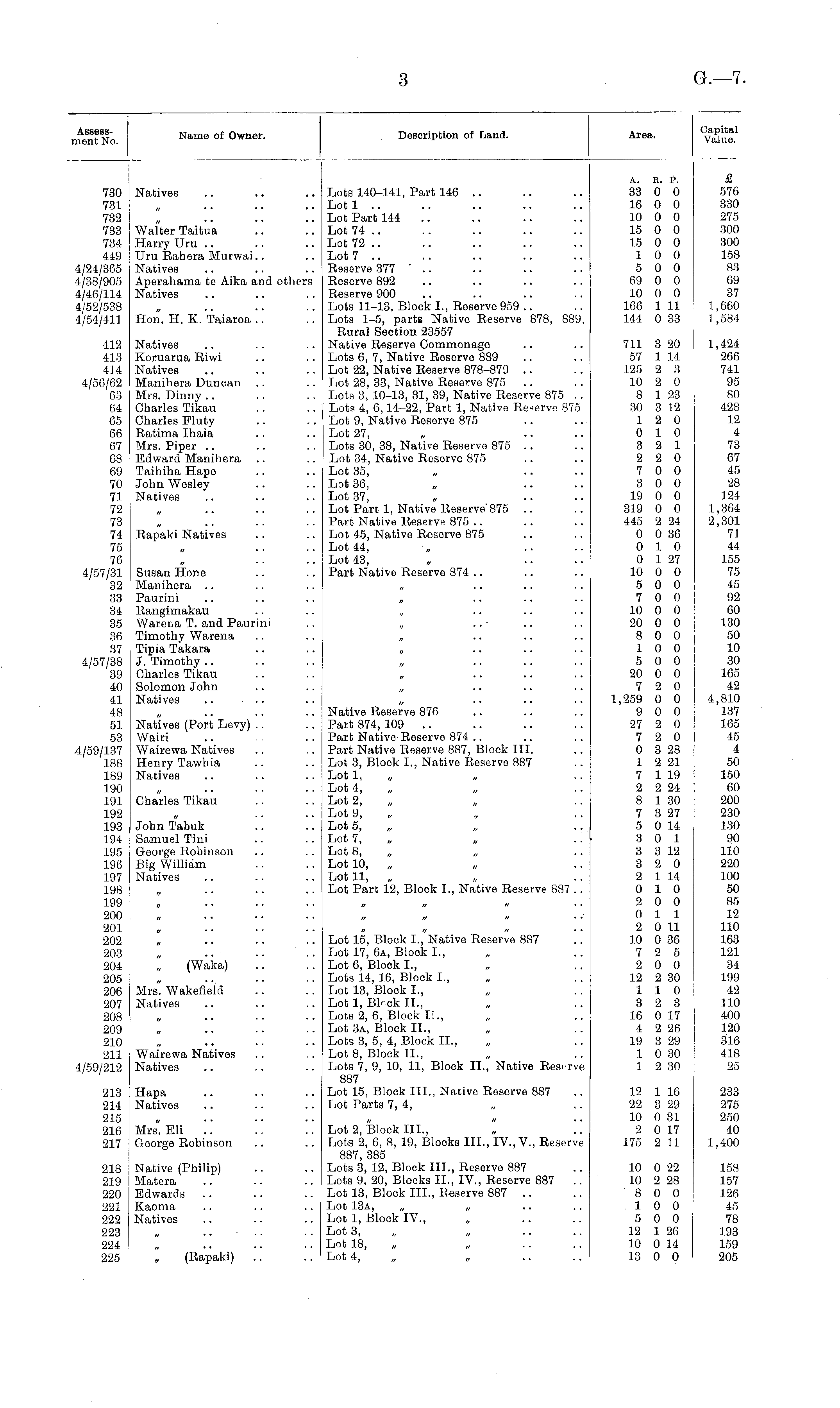 Assessment No. Name of Owner. Description of Land. Area. Capital Value. 730 731 732 733 734 449 4/24/365 4/38/905 4/46/114 4/52/538 4/54/411 Natives Walter Taitua Harry Uru Uru Rahera Murwai.. Natives Aperahama te Aika and others Natives Lots 140-141, Part 146 .. Lot 1 .. Lot Part 144 Lot 74 .. Lot 72 .. Lot 7 .. Reserve 377 '.. Reserve 892 Reserve 900 Lots 11-13, Block I., Reserve 959 Lots 1-5, parts Native Reserve 878, 889, Rural Section 23557 Native Reserve Commonage Lots 6, 7, Native Reserve 889 Lot 22, Native Reserve 878-879 Lot 28, 33, Native Reserve 875 .. Lots 3, 10-13, 31, 39, Native Reserve 875 .. Lots 4, 6,14-22, Part 1, Native Reserve 875 Lot 9, Native Reserve 875 Lot 27, „ .... Lots 30, 38, Native Reserve 875 .. Lot 34, Native Reserve 875 Lot 35, „ .... Lot 36, Lot 37, „ .... Lot Part 1, Native Reserve'875 Part Native Reserve 875 Lot 45, Native Reserve 875 Lot 44, „ .... Lot 43, „ .... Part Native Reserve 874 A. B. P. 33 0 0 16 0 0 10 0 0 15 0 0 15 0 0 10 0 5 0 0 69 0 0 10 0 0 166 1 11 144 0 33 £ 576 330 275 300 300 158 83 69 37 1,660 1,584 Hon. H. K. Taiaroa 412 413 414 4/56/62 63 64 65 66 67 68 69 70 71 72 73 74 75 76 4/57/31 32 33 34 35 36 37 4/57/38 39 40 41 48 51 53 4/59/137 188 189 190 191 192 193 194 195 196 197 198 199 200 201 202 203 204 205 206 207 208 209 210 211 4/59/212 Natives Koruarua Riwi Natives Manihera Duncan Mrs. Dinny Charles Tikau Charles Fluty Ratima Ihaia .. Mrs. Piper Edward Manihera Taihiha Hape John Wesley Natives Rapaki Natives Susan Hone Manihera Paurini Rangimakau W arena T. and Paurini Timothy Warena Tipia Takara J. Timothy Charles Tikau Solomon John Natives .. Native Reserve 876 Part 874, 109 .. Part Native Reserve 874 .. Part Native Reserve 887, Block III. Lot 3, Block I., Native Reserve 887 Lot 1, Lot 4, Lot 2, Lot 9, Lot 5, Lot 7, Lot 8, Lot 10, „ Lot 11, „ Lot Part 12, Block I., Native Reserve 887 .. 711 3 20 57 1 14 125 2 3 10 2 0 8 1 23 30 3 12 1 2 0 0 10 3 2 1 2 2 0 7 0 0 3 0 0 19 0 0 319 0 0 445 2 24 0 0 36 0 10 0 1 27 10 0 0 5 0 0 7 0 0 10 0 0 20 0 0 8 0 0 10 0 5 0 0 20 0 0 7 2 0 1,259 0 0 9 0 0 27 2 0 7 2 0 0 3 28 1 2 21 7 1 19 2 2 24 8 1 30 7 3 27 5 0 14 3 0 1 3 3 12 3 2 0 2 1 14 0 10 2 0 0 0 11 2 0 11 10 0 36 7 2 5 2 0 0 12 2 30 110 3 2 3 16 0 17 4 2 26 19 3 29 1 0 30 1 2 30 1,424 266 741 95 80 428 12 4 73 67 45 28 124 1,364 2,301 71 44 155 75 45 92 60 130 50 10 30 165 42 4,810 137 165 45 4 50 150 60 200 230 130 90 110 220 100 50 85 12 110 163 121 34 199 42 110 400 120 316 418 25 Natives (Port Levy) Wairi Wairewa Natives Henry Tawhia Natives Charles Tikau John Tabuk Samuel Tini George Robinson Big William Natives "„ (Waka) '.'. '.'. Mrs. Wakefield Natives Lot 15, Block I., Native Reserve 887 Lot 17, 6a, Block I., Lot 6, Block I., Lots 14, 16, Block I., Lot 13, Block I., Lot 1, Blr.ok II., Lots 2, 6, Block I:., Lot 3a, Block II., Lots 3, 5, 4, Block II., Lot 8, Block II., Lots 7, 9, 10, 11, Block II., Native Reserve 887 Lot 15, Block III., Native Reserve 887 Lot Parts 7, 4, Wairewa Natives Natives 213 214 215 216 217 Hapa Natives Mrs". Eli George Robinson Lot 2, Block III., Lots 2, 6, 8, 19, Blocks III., IV., V., Reserve 887, 385 Lots 3, 12, Block III., Reserve 887 Lots 9, 20, Blocks II., IV., Reserve 887 .. Lot 13, Block III., Reserve 887 .. Lot 13a, Lot 1, Block IV., Lot 3, Lot 18, Lot 4, 12 1 16 22 3 29 10 0 31 2 0 17 175 2 11 233 275 250 40 1,400 218 219 220 221 222 223 224 225 Native (Philip) Matera Edwards Kaoma Natives 10 0 22 10 2 28 8 0 0 10 0 5 0 0 12 1 26 10 0 14 13 0 0 158 157 126 45 78 193 159 205 „ (Rapaki)