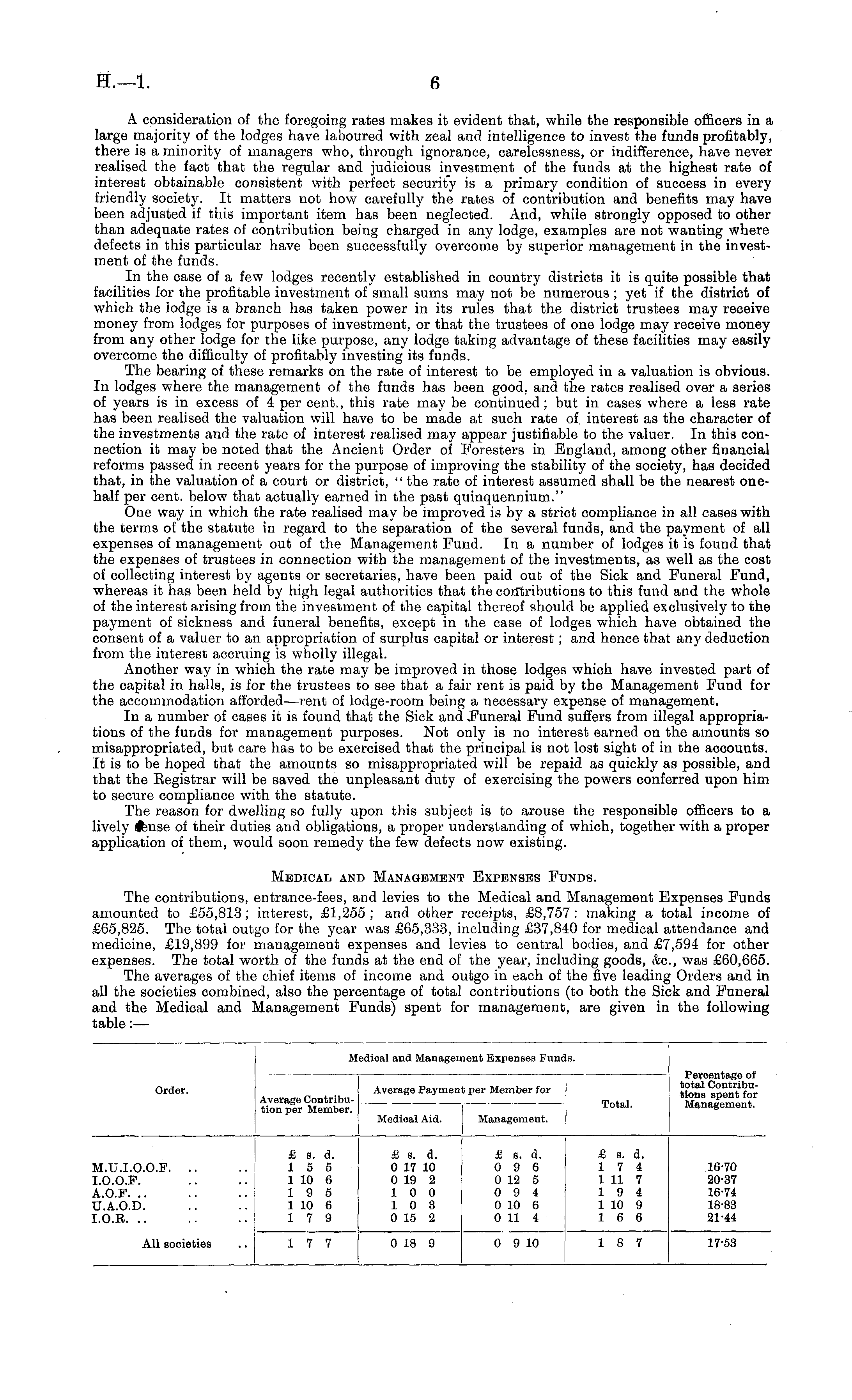A consideration of the foregoing rates makes it evident that, while the responsible officers in a large majority of the lodges have laboured with zeal and intelligence to invest the funds profitably, there is a minority of managers who, through ignorance, carelessness, or indifference, have never realised the fact that the regular and judicious investment of the funds at the highest rate of interest obtainable consistent with perfect security is a primary condition of success in every friendly society. It matters not how carefully the rates of contribution and benefits may have been adjusted if this important item has been neglected. And, while strongly opposed to other than adequate rates of contribution being charged in any lodge, examples are not wanting where defects in this particular have been successfully overcome by superior management in the investment of the funds. In the case of a few lodges recently established in country districts it is quite possible that facilities for the profitable investment of small sums may not be numerous ; yet if the district of which the lodge is a branch has taken power in its rules that the district trustees may receive money from lodges for purposes of investment, or that the trustees of one lodge may receive money from any other lodge for the like purpose, any lodge taking advantage of these facilities may easily overcome the difficulty of profitably investing its funds. The bearing of these remarks on the rate of interest to be employed in a valuation is obvious. In lodges where the management of the funds has been good, and the rates realised over a series of years is in excess of 4 per cent., this rate may be continued; but in cases where a less rate has been realised the valuation will have to be made at such rate of interest as the character of the investments and the rate of interest realised may appear justifiable to the valuer. In this connection it may be noted that the Ancient Order of Foresters in England, among other financial reforms passed in recent years for the purpose of improving the stability of the society, has decided that, in the valuation of a court or district, " the rate of interest assumed shall be the nearest onehalf per cent, below that actually earned in the past quinquennium." One way in which the rate realised may be improved is by a strict compliance in all cases with the terms of the statute in regard to the separation of the several funds, and the payment of all expenses of management out of the Management Fund. In a number of lodges it is found that the expenses of trustees in connection with the management of the investments, as well as the cost of collecting interest by agents or secretaries, have been paid out of the Sick and Funeral Fund, whereas it has been held by high legal authorities that the contributions to this fund and the whole of the interest arising from the investment of the capital thereof should be applied exclusively to the payment of sickness and funeral benefits, except in the case of lodges which have obtained the consent of a valuer to an appropriation of surplus capital or interest; and hence that any deduction from the interest accruing is wholly illegal. Another way in which the rate may be improved in those lodges which have invested part of the capital in halls, is for the trustees to see that a fair rent is paid by the Management Fund for the accommodation afforded—rent of lodge-room being a necessary expense of management. In a number of cases it is found that the Sick and Funeral Fund suffers from illegal appropriations of the funds for management purposes. Not only is no interest earned on the amounts so misappropriated, but care has to be exercised that the principal is not lost sight of in the accounts. It is to be hoped that the amounts so misappropriated will be repaid as quickly as possible, and that the Eegistrar will be saved the unpleasant duty of exercising the powers conferred upon him to secure compliance with the statute. The reason for dwelling so fully upon this subject is to arouse the responsible officers to a lively Jense of their duties and obligations, a proper understanding of which, together with a proper application of them, would soon remedy the few defects now existing. Medical and Management Expenses Funds. The contributions, entrance-fees, and levies to the Medical and Management Expenses Funds amounted to £55,813; interest, £1,255; and other receipts, £8,757: making a total income of £65,825. The total outgo for the year was £65,333, including £37,840 for medical attendance and medicine, £19,899 for management expenses and levies to central bodies, and £7,594 for other expenses. The total worth of the funds at the end of the year, including goods, &c, was £60,665. The averages of the chief items of income and outgo in each of the five leading Orders and in all the societies combined, also the percentage of total contributions (to both the Sick and Funeral and the Medical and Management Funds) spent for management, are given in the following table:—