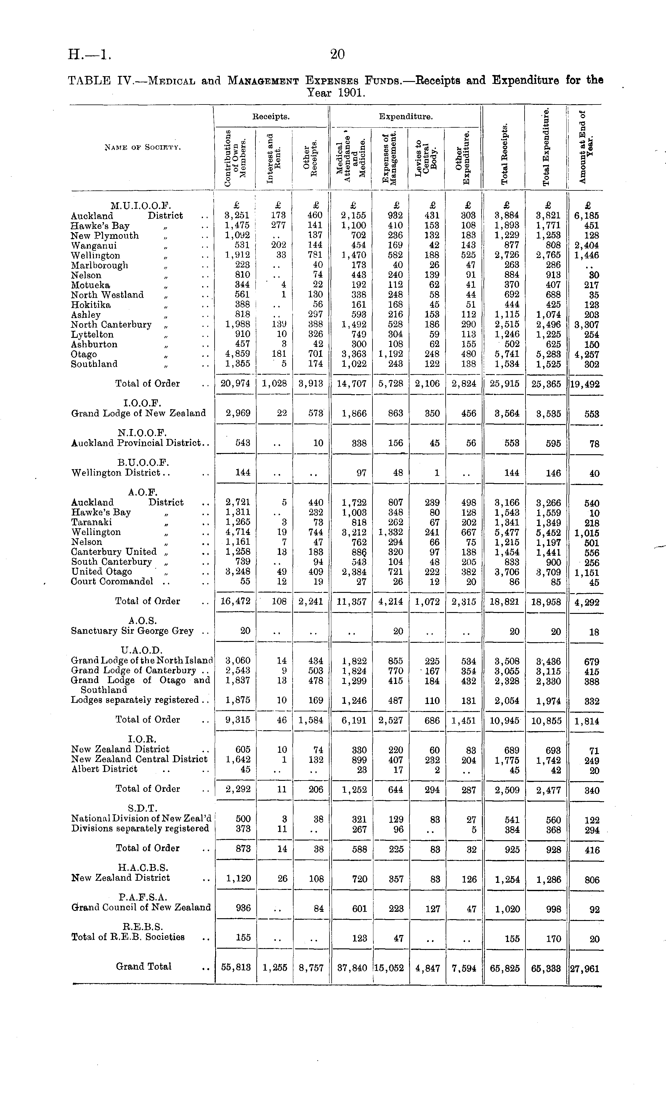 TABLE IV.—Medical and Management Expenses Funds.—Receipts and Expenditure for the Year 1901.