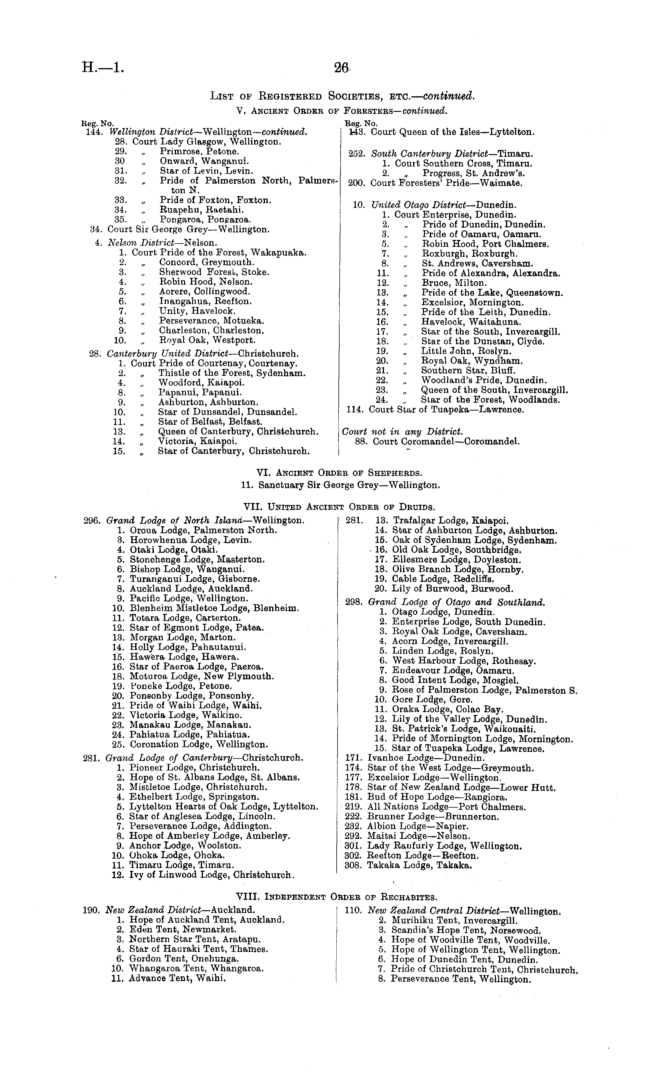 List of Registered Societies, etc. — continued. V. Ancient Order of Foresters— continued. Reg. No. Reg. No. 144. Wellington District —Wellington— continued. 143. Court Queen of the Isles—Lyttelton. 28. Court Lady Glasgow, Wellington. 29. „ Primrose, Petone. 252. South Canterbury District— Timaru. 30. „ Onward, Wanganui. 1. Court Southern Cross, Timaru. 31. „ Star of Levin, Levin. 2. „ Progress, St. Andrew's. 32. „ Pride of Palmerston North, Palmers- 2 00. Court Foresters' Pride—Waimate. ton N. 33. „ Pride of Foxton, Foxton. m n.aj/ii r>- *_• * t. j- „,„,„.',. 10. United Otago District —Dunedin. 34. „ Ruapehu, Raetahi. . n ,%, . ■ t> jo- t>. I t> 1- Court Enterprise, Dunedin. 35. „ Pongaroa, Pongaroa. ,, ... r , „' ,. j-. ,. oa n i o- n n \i7 n- t 2. „ Pride of Dunedin, Dunedin. 34. Court Sir George Grey—Wellington. „ -r, ■ -, , „ V> _ n J ° 3. „ Pride of Oamaru, Oamaru. 4. Nelson District— Nelson. 5. „ Robin Hood, Port Chalmers. 1. Court Pride of the Forest, Wakapuaka. 7. „ Roxburgh, Roxburgh. 2. „ Concord, Greymouth. 8. „ St. Andrews, Caversham. 3. „ Sherwood Forest, Stoke. 11. „ Pride of Alexandra, Alexandra. 4. „ Robin Hood, Nelson. 12. „ Bruce, Milton. 5. „ Aorere, Collingwood. 13. , Pride of the Lake, Queenstown. 6. „ Inangahua, Reefton. 14. „ Excelsior, Mornington. 7. „ Unity, Havelock. 15. „ Pride of the Leith, Dunedin. 8. „ Perseverance, Motueka. 16. „ Havelock, Waitahuna. 9. „ Charleston, Charleston. 17. „ Star of the South, Invercargill. 10. „ Royal Oak, Westport. 18. „ Star of the Dunstan, Clyde. 28. Canterbury United District— Christchurch. 19 - » Little John > Eoslyn. 1. Court Pride of Courtenay, Courtenay. 20 - » R °y al 0ak . Wyndham. 2. „ Thistle of the Forest, Sydenham. 21 - » Southern Star, Bluff. 4. „ Woodford, Kaiapoi. 22 - . Woodland's Pride, Dunedin. 8. , Papanui, Papanui. 23 - » Queen of the South, Invercargill. 9. „ Ashburton, Ashburton. 2i - » Star of the Forest, Woodlands. 10. » Star of Dunsandel, Dunsandel. ni - Court; Ster of Tuapeka—Lawrence. 11. „ Star of Belfast, Belfast. 13. „ Queen of Canterbury, Christchurch. Court not in any District. 14. „ Victoria, Kaiapoi. 88. Court Coromandel—Coromandel. 15. „ Star of Canterbury, Christchurch. VI. Ancient Order of Shepherds. 11. Sanctuary Sir George Grey—Wellington. VII. United Ancient Order of Druids. 296. Grand Lodge of North Island —Wellington. 281. 13. Trafalgar Lodge, Kaiapoi. 1. Oroua Lodge, Palmerston North, 14. Star of Ashburton Lodge, Ashburton. 3. Horowhenua Lodge, Levin. 15. Oak of Sydenham Lodge, Sydenham. 4. Otaki Lodge, Otaki. 16. Old Oak Lodge, Southbridge. 5. Stonehenge Lodge, Masterton. 17. Ellesmere Lodge, Doyleston. 6. Bishop Lodge, Wanganui. 18, Olive Branch Lodge, Hornby. 7. Turanganui Lodge, Gisborne. 19. Cable Lodge, Redcliffs. 8. Auckland Lodge, Auckland. 20. Lily of Burwood, Burwood. 9. Pacific Lodge, Wellington. 298. Grand Lodge of Otago and Southland. 10. Blenheim Mistletoe Lodge, Blenheim. L Otago Lodge, Dunedin. 11. Totara Lodge, Carterton 2 . Enterprise Lodge, South Dunedin. 12. Star of Egmont Lodge, Patea. 3 R al 0ak Lodg Caversham. 13. Morgan Lodge Marton. 4 Aco J m Lod In V eroargill . 14. Holly Lodge, Pahautanui. 5 Linden Lod Roslyn 5 15. Hawera Lodge, Hawera. 6 West Harbour Lodf / e Rotnesay . 16. Star of Paeroa Lodge, Paeroa. 7 Endeavour Lodge, Oamaru. 18. Moturoa Lodge, New Plymouth. 8 Good Intent L< £ Mosgiel. 19. Poneke Lodge, Petone. 9 Rose of p a , merston Lod | e p aImersto n S. 20. Ponsonby Lodge, Ponsonby. 10 Gore Lod „ e Gore 21. Pride of Waihi Lodge, Waihi. n 0raka Colao B 22. Victoria Lodge, Waikino. 12 . Lil 0 , the Valley Lodge, Dunedin. 23. Manakau Lodge, Manakau. 13 _ st p atriok . s W e aikouaiti . 24. Pahiatua Lodge, Pahiatua u _ Pride of Mornington Lodge, Mornington. 25. Coronation Lodge, Wellington. 15 8tar ot Tuapeka Lodge, Lawrence. 281. Grand Lodge of Canterbury —Christchurch. 171. Ivanhoe Lodge—Dunedin. 1. Pioneer Lodge, Christchurch. 174. Star of the West Lodge—Greymouth. 2. Hope of St. Albans Lodge, St. Albans. 177. Excelsior Lodge—Wellington. 3. Mistletoe Lodge, Christchurch. 178. Star of New Zealand Lodge—Lower Hutt. 4. Ethelbert Lodge, Springston. 181. Bud of Hope Lodge—Rangiora. 5. Lyttelton Hearts of Oak Lodge, Lyttelton. 219. All Nations Lodge—Port Chalmers. 6. Star of Anglesea Lodge, Lincoln. 222. Brunner Lodge—Brunnerton. 7. Perseverance Lodge, Addington. 232. Albion Lodge—Napier. 8. Hope of Amberley Lodge, Amberley. 292. Maitai Lodge—Nelson. 9. Anchor Lodge, Woolston. 301. Lady Ranfurly Lodge, Wellington. 10. Ohoka Lodge, Ohoka. 302. Reefton Lodge—Reefton. 11. Timaru Lodge, Timaru. 308. Takaka Lodge, Takaka. 12. Ivy of Linwood Lodge, Christchurch. VIII. Independent Order of Rechabites. 190. New Zealand District —Auckland. 110. New Zealand Central District —Wellington. 1. Hope of Auckland Tent, Auckland. 2. Murihiku Tent, Invercargill. 2. Eden Tent, Newmarket. 3. Scandia's Hope Tent, Norsewood. 3. Northern Star Tent, Aratapu. 4. Hope of Woodville Tent, Woodville. 4. Star of Hauraki Tent, Thames. 5. Hope of Wellington Tent, Wellington. 6. Gordon Tent, Onehunga. 6. Hope of Dunedin Tent, Dunedin. 10. Whangaroa Tent, Whangaroa. 7. Pride of Christchurch Tent, Christchurch, 11. Advance Tent, Waihi. 8. Perseverance Tent, Wellington.