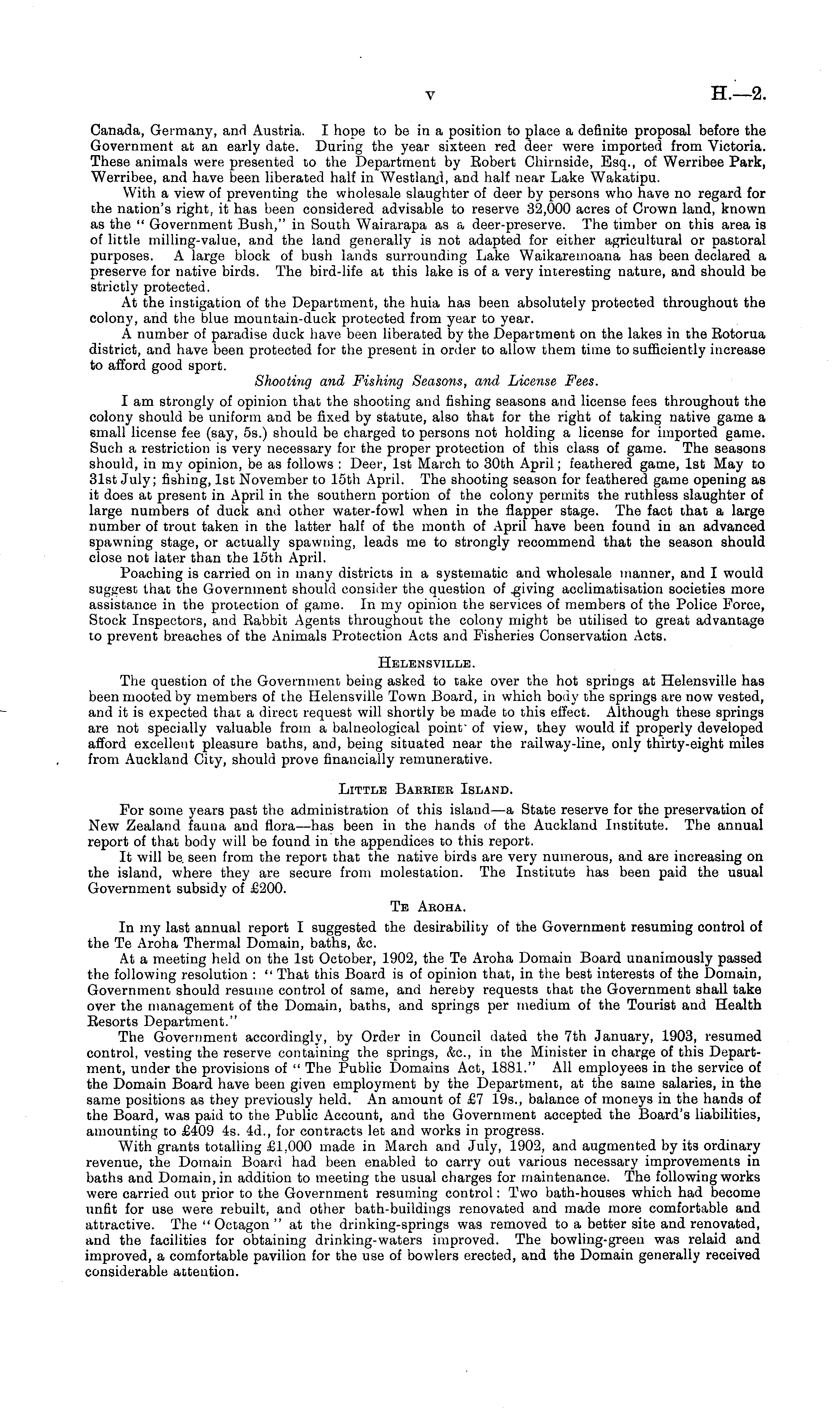 Canada, Germany, and Austria. I hope to be in a position to place a definite proposal before the Government at an early date. During the year sixteen red deer were imported from Victoria. These animals were presented to the Department by Eobert Chirnside, Esq., of Werribee Park, Werribee, and have been liberated half in Westland, and half near Lake Wakatipu. With a view of preventing the wholesale slaughter of deer by persons who have no regard for the nation's right, it has been considered advisable to reserve 32,000 acres of Crown land, known as the " Government Bush," in South Wairarapa as a deer-preserve. The timber on this area is of little milling-value, and the land generally is not adapted for either agricultural or pastoral purposes. A large block of bush lands surrounding Lake Waikareinoana has been declared a preserve for native birds. The bird-life at this lake is of a very interesting nature, and should be strictly protected. At the instigation of the Department, the huia has been absolutely protected throughout the colony, and the blue mountain-duck protected from year to year. A number of paradise duck have been liberated by the Department on the lakes in the Rotorua district, and have been protected for the present in order to allow them time to sufficiently increase to afford good sport. Shooting and Fishing Seasons, and License Fees. I am strongly of opinion that the shooting and fishing seasons and license fees throughout the colony should be uniform and be fixed by statute, also that for the right of taking native game a small license fee (say, 55.) should be charged to persons not holding a license for imported game. Such a restriction is very necessary for the proper protection of this class of game. The seasons should, in my opinion, be as follows : Deer, Ist March to 30th April; feathered game, Ist May to 31st July; fishing, Ist November to 15th April. The shooting season for feathered game opening as it does at present in April in the southern portion of the colony permits the ruthless slaughter of large numbers of duck and other water-fowl when in the flapper stage. The fact that a large number of trout taken in the latter half of the month of April have been found in an advanced spawning stage, or actually spawning, leads me to strongly recommend that the season should close not later than the 15th April. Poaching is carried on in many districts in a systematic and wholesale manner, and I would suggest that the Government should consider the question of .giving acclimatisation societies more assistance in the protection of game. In my opinion the services of members of the Police Force, Stock Inspectors, and Rabbit Agents throughout the colony might be utilised to great advantage to prevent breaches of the Animals Protection Acts and Fisheries Conservation Acts. Helen sviLLE. The question of the Government being asked to take over the hot springs at Helensville has been mooted by members of the Helensville Town Board, in which body the springs are now vested, and it is expected that a direct request will shortly be made to this effect. Although these springs are not specially valuable from a balneological poinf of view, they would if properly developed afford excellent pleasure baths, and, being situated near the railway-line, only thirty-eight miles from Auckland City, should prove financially remunerative. Little Baeriek Island. For some years past the administration of this island —a State reserve for the preservation of New Zealand fauna and flora—has been in the hands of the Auckland Institute. The annual report of that body will be found in the appendices to this report. It will be. seen from the report that the native birds are very numerous, and are increasing on the island, where they are secure from molestation. The Institute has been paid the usual Government subsidy of £200. Te Aeoha. In my last annual report I suggested the desirability of the Government resuming control of the Te Aroha Thermal Domain, baths, &o. At a meeting held on the Ist October, 1902, the Te Aroha Domain Board unanimously passed the following resolution : " That this Board is of opinion that, in the best interests of the Domain, Government should resume control of same, and hereby requests that the Government shall take over the management of the Domain, baths, and springs per medium of the Tourist and Health Resorts Department." The Government accordingly, by Order in Council dated the 7th January, 1903, resumed control, vesting the reserve containing the springs, &c, in the Minister in charge of this Department, under the provisions of " The Public Domains Act, 1881." All employees in the service of the Domain Board have been given employment by the Department, at the same salaries, in the same positions as they previously held. An amount of £7 195., balance of moneys in the hands of the Board, was paid to the Public Account, and the Government accepted the Board's liabilities, amounting to £409 4s. 4d., for contracts let and works in progress. With grants totalling £1.000 made in March and July, 1902, and augmented by its ordinary revenue, the Domain Board had been enabled to carry out various necessary improvements in baths and Domain, in addition to meeting the usual charges for maintenance. The following works were carried out prior to the Government resuming control: Two bath-houses which had become unfit for use were rebuilt, and other bath-buildings renovated and made more comfortable and attractive. The " Octagon " at the drinking-springs was removed to a better site and renovated, and the facilities for obtaining drinking-waters improved. The bowling-green was relaid and improved, a comfortable pavilion for the use of bowlers erected, and the Domain generally received considerable attention.
