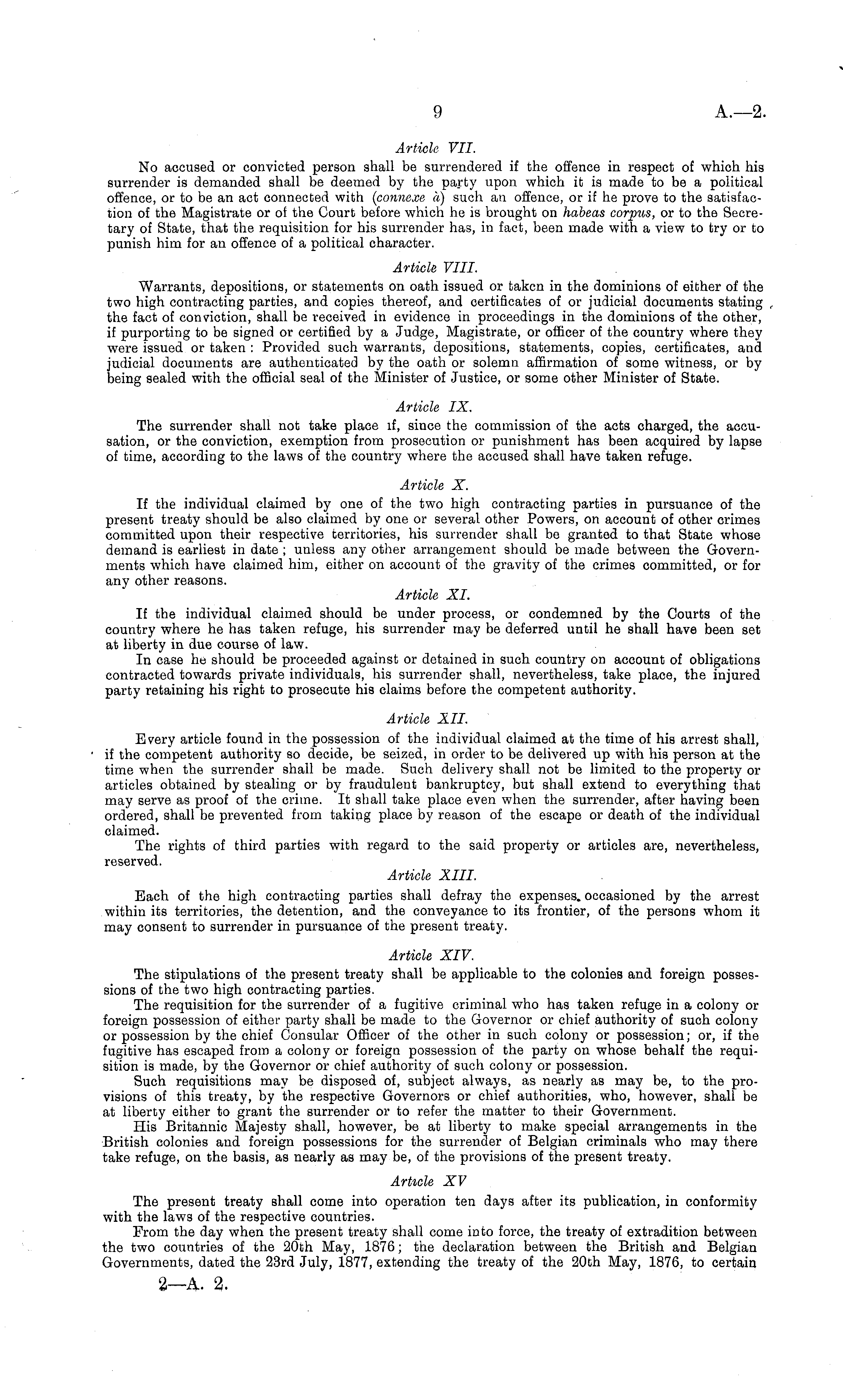 Article VII. No accused or convicted person shall be surrendered if the offence in respect of which his surrender is demanded shall be deemed by the party upon which it is made to be a political offence, or to be an act connected with (connexe a) such an offence, or if he prove to the satisfaction of the Magistrate or of the Court before which he is brought on habeas corpus, or to the Secretary of State, that the requisition for his surrender has, in fact, been made with a view to try or to punish him for an offence of a political character. Article VIII. Warrants, depositions, or statements on oath issued or taken in the dominions of either of the two high contracting parties, and copies thereof, and certificates of or judicial documents stating the fact of conviction, shall be received in evidence in proceedings in the dominions of the other, if purporting to be signed or certified by a Judge, Magistrate, or officer of the country where they were issued or taken : Provided such warrants, depositions, statements, copies, certificates, and judicial documents are authenticated by the oath or solemn affirmation of some witness, or by being sealed with the official seal of the Minister of Justice, or some other Minister of State. Article IX. The surrender shall not take place if, since the commission of the acts charged, the accusation, or the conviction, exemption from prosecution or punishment has been acquired by lapse of time, according to the laws of the country where the accused shall have taken refuge. Article X. If the individual claimed by one of the two high contracting parties in pursuance of the present treaty should be also claimed by one or several other Powers, on account of other crimes committed upon their respective territories, his surrender shall be granted to that State whose demand is earliest in date ; unless any other arrangement should be made between the Governments which have claimed him, either on account of the gravity of the crimes committed, or for any other reasons. Article XI. If the individual claimed should be under process, or condemned by the Courts of the country where he has taken refuge, his surrender may be deferred until he shall have been set at liberty in due course of law. In case he should be proceeded against or detained in such country on account of obligations contracted towards private individuals, his surrender shall, nevertheless, take place, the injured party retaining his right to prosecute his claims before the competent authority. Article XII. Every article found in the possession of the individual claimed at the time of his arrest shall, if the competent authority so decide, be seized, in order to be delivered up with his person at the time when the surrender shall be made. Such delivery shall not be limited to the property or articles obtained by stealing or by fraudulent bankruptcy, but shall extend to everything that may serve as proof of the crime. It shall take place even when the surrender, after having been ordered, shall be prevented from taking place by reason of the escape or death of the individual claimed. The rights of third parties with regard to the said property or articles are, nevertheless, reserved. Article XIII. Each of the high contracting parties shall defray the expenses, occasioned by the arrest within its territories, the detention, and the conveyance to its frontier, of the persons whom it may consent to surrender in pursuance of the present treaty. Article XIV. The stipulations of the present treaty shall be applicable to the colonies and foreign possessions of the two high contracting parties. The requisition for the surrender of a fugitive criminal who has taken refuge in a colony or foreign possession of either party shall be made to the Governor or chief authority of such colony or possession by the chief Consular Officer of the other in such colony or possession; or, if the fugitive has escaped from a colony or foreign possession of the party on whose behalf the requisition is made, by the Governor or chief authority of such colony or possession. Such requisitions may be disposed of, subject always, as nearly as may be, to the provisions of this treaty, by the respective Governors or chief authorities, who, however, shall be at liberty either to grant the surrender or to refer the matter to their Government. His Britannic Majesty shall, however, be at liberty to make special arrangements in the British colonies and foreign possessions for the surrender of Belgian criminals who may there take refuge, on the basis, as nearly as may be, of the provisions of the present treaty. Article XV The present treaty shall come into operation ten days after its publication, in conformity with the laws of the respective countries. From the day when the present treaty shall come into force, the treaty of extradition between the two countries of the 20th May, 1876; the declaration between the British and Belgian Governments, dated the 23rd July, 1877, extending the treaty of the 20th May, 1876, to certain 2—A. 2.
