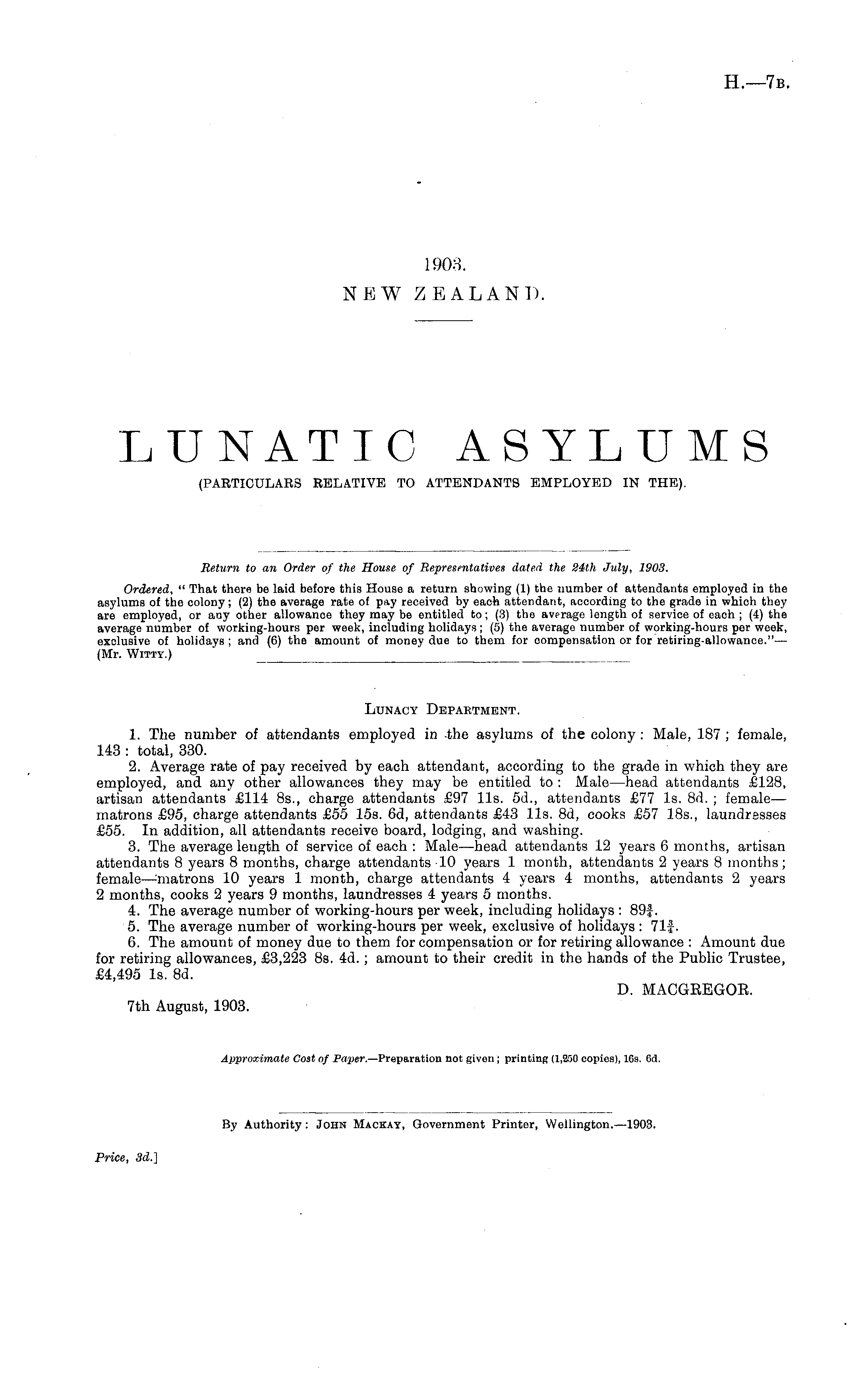 Lunacy Depaktment. 1. The number of attendants employed in the asylums of the colony : Male, 187 ; female, 143 : total, 330. 2. Average rate of pay received by each attendant, according to the grade in which they are employed, and any other allowances they may be entitled to : Male—head attendants £128, artisan attendants £114 Bs., charge attendants £97 lis. 5d., attendants £77 Is. Bd. ; female— matrons £95, charge attendants £55 15s. 6d, attendants £43 lis. Bd, cooks £57 18s., laundresses £55. In addition, all attendants receive board, lodging, and washing. 3. The average leugth of service of each : Male —head attendants 12 years 6 months, artisan attendants 8 years 8 months, charge attendants 10 years 1 month, attendants 2 years 8 months; female—Matrons 10 years 1 month, charge attendants 4 years 4 months, attendants 2 years 2 months, cooks 2 years 9 months, laundresses 4 years 5 months. 4. The average number of working-hours per week, including holidays : 89f. 5. The average number of working-hours per week, exclusive of holidays : 71|. 6. The amount of money due to them for compensation or for retiring allowance : Amount due for retiring allowances, £3,223 Bs. 4d.; amount to their credit in the hands of the Public Trustee, £4,495 Is. Bd. D. MACGEEGOE. 7th August, 1903. Approximate Cost of Paper.— Preparation not given ; printing (1,830 copies), lGs. 63.