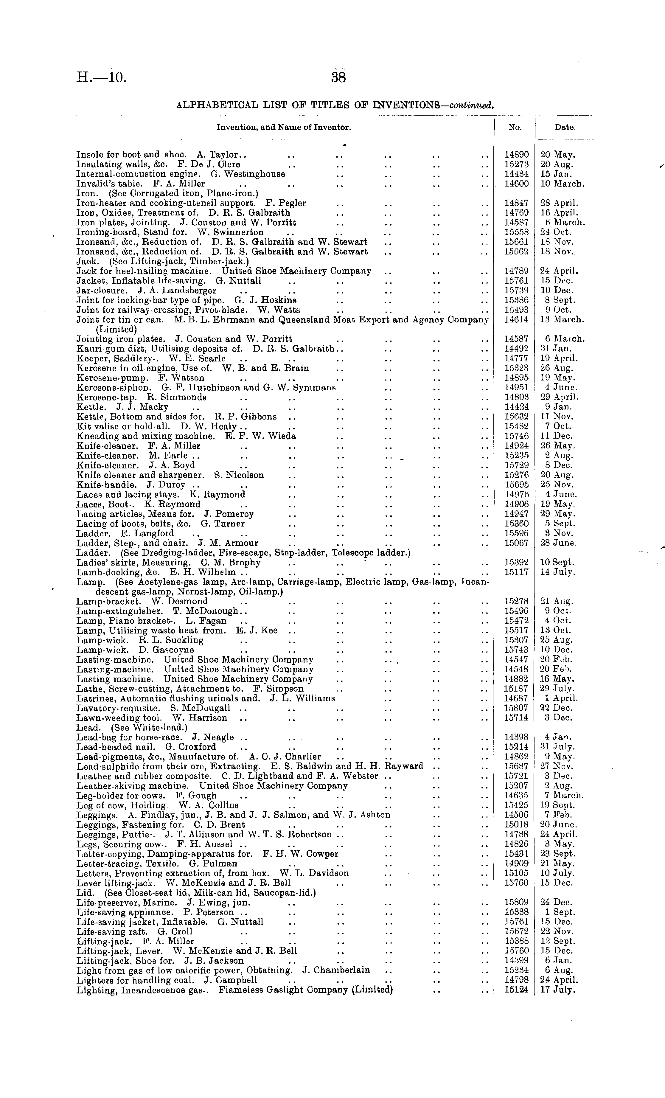 Invention, and Name of Inventor. No. Date. [nsole for boot and shoe. A.Taylor.. insulating walls, &c. F. Dβ J. Clere internal-combustion engine. G. Westinghouse invalid's table. F. A. Miller iron. (See Corrugated iron, Plane-iron.) iron-heater and cooking-utensil support. F. Pegler iron, Oxidee, Treatment of. D. R. S. Galbraith tron plates, Jointing. J. Coustou and W. Porritt ironing-board, Stand for. W. Swinnerton ironsand, &c, Reduction of. D. R. S. Galbraith and W. Stewart ironsand, &c, Reduction of. D. R. S. Galbraith and W. Stewart Fack. (See Lifting-jack, Timber-jack.) (ack for heel-nailing machine. United Shoe Machinery Company racket, Inflatable life-saving. G. Nuttall Far-closure. J. A. Landsberger Foint for locking-bar type of pipe. G. J. Hoskina Foint for railway-crossing, Pivot-blade. W. Watts Foint for tin or can. M. B. L. Ehrmann and Queensland Meat Export and Agency Company (Limited) rointing iron plates. J. Couston and W. Porritt Kauri-gum dirt, Utilising deposits of. D. R. S. Galbraitb.. deeper, Saddlery-. W. E. Searle Kerosene in oil-engine, Use of. W. B. and E. Brain Kerosene-pump. F.Watson Kerosene-siphon. G. F. Hutchinson and G. W. Symmans Kerosene-tap. R. Simmonds Kettle. J. J. Macky Kettle, Bottom and sides for. R. P. Gibbons Kit valise or hold-all. D. W. Healy Kneading and mixing machine. E. F. W. Wieda Knife-cleaner. F. A. Miller Knife-cleaner. M. Earle .. .. .. .. Knife-cleaner. J. A. Boyd Knife cleaner and sharpener. S. Nicolson Knife-handle. J. Durey .. Laces and lacing stays. K. Raymond jaces, Boot-. K. Raymond Lacing articles, Means for. J. Pomeroy facing of boots, belts, &c. G. Turner Ladder. E. Langford .. .. ■ .. Ladder, Step-, and chair. J. M. Armour Ladder. (See Dredging-ladder, Fire-escape, Step-ladder, Telesoope ladder.) Ladies' skirta, Measuring. C. M. Brophy Lamb-docking, &c. E. H. Wilhelm Lamp. (See Acetylene-gas lamp, Aro-lamp, Carriage-lamp, Electric lamp, Gas-lamp, Inoandescent gas-lamp, Nernst-lamp, Oil-lamp.) Lamp-bracket. W. Desmond Lamp-extinguisher. T. McDonough.. Lamp, Piano bracket-. L. Fagan Lamp, Utilising waste heat from. E. J. Kee Lamp-wick. R. L. Suckling liamp-wick. D. Gaecoyne Lasting-machine. United Shoe Machinery Company .. ... Lasting-machine. United Shoe Machinery Company Lasting-machine. United Shoe Machinery Company Lathe, Screw-cutting, Attachment to. F. Simpson Latrines, Automatic flushing urinals and. J. L. Williams Lavatory-requisite. S. MoDougall Lawn-weeding tool. W. Harrison liead. (See White-lead.) Lead-bag for horse-race. J. Neagle .. Lead-headed nail. G. Croxford jead-pigments, &c, Manufacture of. A. C. J. Charlier Lead-sulphide from their ore, Extracting. E. S. Baldwin and H. H. Rayward Leather and rubber composite. C. D. Lightband and F. A. Webster Leather-skiving machine. United Shoe Machinery Company Leg-holder for cows. F. Gough Leg of cow, Holding. W. A. Collins Leggings. A. Findlay, jun., J. B. and J. J. Salmon, and W. J. Ashton Leggings, Fastening for. 0. D. Brent Leggings, Puttie-. J. T. Allinson and W. T. S. Robertson Legs, Securing cow-. F. H. Aussel .. Letter-copying, Damping-apparatus for. F. H. W. Cowper Letter-tracing, Textile. G. Pulman Letters, Preventing extraction of, from box. W. L. Davidson Lever lifting-jack. W. McKenzie and J. R. Bell Lid. (See Closet-seat lid, Milk-can lid, Saucepan-lid.) Life-preserver, Marine. J. Ewicg, jun. Life-saving appliance. P. Peterson .. Life-saving jacket, Inflatable. G. Nuttall Life-saving raft. G. Croll Liifting-jack. F. A. Miller Lifting-jack, Lever. W. McKenzie and J. R. Bell Lifting-jack, Shoe for. J. B. Jaokson Light from gas of low calorific power, Obtaining. J. Chamberlain Lighters for handling coal. J.Campbell Lighting, Incandescence gas-. Flameless Gaslight Company (Limited) 14890 15273 14434 14600 20 May. 20 Aug. 15 Jan. 10 March 14847 14769 14587 15558 15661 15662 28 April. 16 April. 6 March 24 Oct. 18 Nov. 18 Nov. 14789 15761 15739 15386 15493 14614 24 April. 15 Dec. 10 Dec. 8 Sept. 9 Oct. 13 March. 14587 14492 14777 15323 14895 14951 14803 14424 15632 15482 15746 14924 15235 15729 15276 15695 14976 14906 14947 15360 15596 15067 6 Maroh 81 Jan. 19 April. 26 Aug. 1!) May. 4 June. 29 April. 9 Jan. 11 Nov. 7 Oct. 11 Dec. 2G May. 2 Aug. 8 Dec. 20 Aug. 25 Nov. 4 June. 19 May. 29 May. 5 Sept. 3 Nov. 28 June. 15392 15117 10 Sept. 14 July. 15278 15496 15472 15517 15307 15743 14547 14548 14882 15187 14687 15807 15714 21 Aug. 9 Oct. 4 Oct. 13 Oct. 25 Aug. 10 Doc. ,20 Feb. 20 Fβ , ). 16 May. 29 July. 1 April. 22 Dec. 3 Dec. 14398 15214 14862 15687 15721 15207 14635 15425 14506 15018 14788 14826 15431 14909 15105 15760 4 Jan. 31 July. 9 May. 27 Nov. 3 Dec. 2 Aug. 7 March. 19 Sept. 7 Feb. 20 June. 24 April. 8 May. 23 Sept. 21 May. 10 July. 15 Dec. 15809 15338 15761 15672 15388 15760 14399 15234 14798 15124 24 Dec. 1 Sept. 15 Dec. 22 Nov. 12 Sept. 15 Dec. 6 Jan. 6 Aug. 24 April. 17 July.