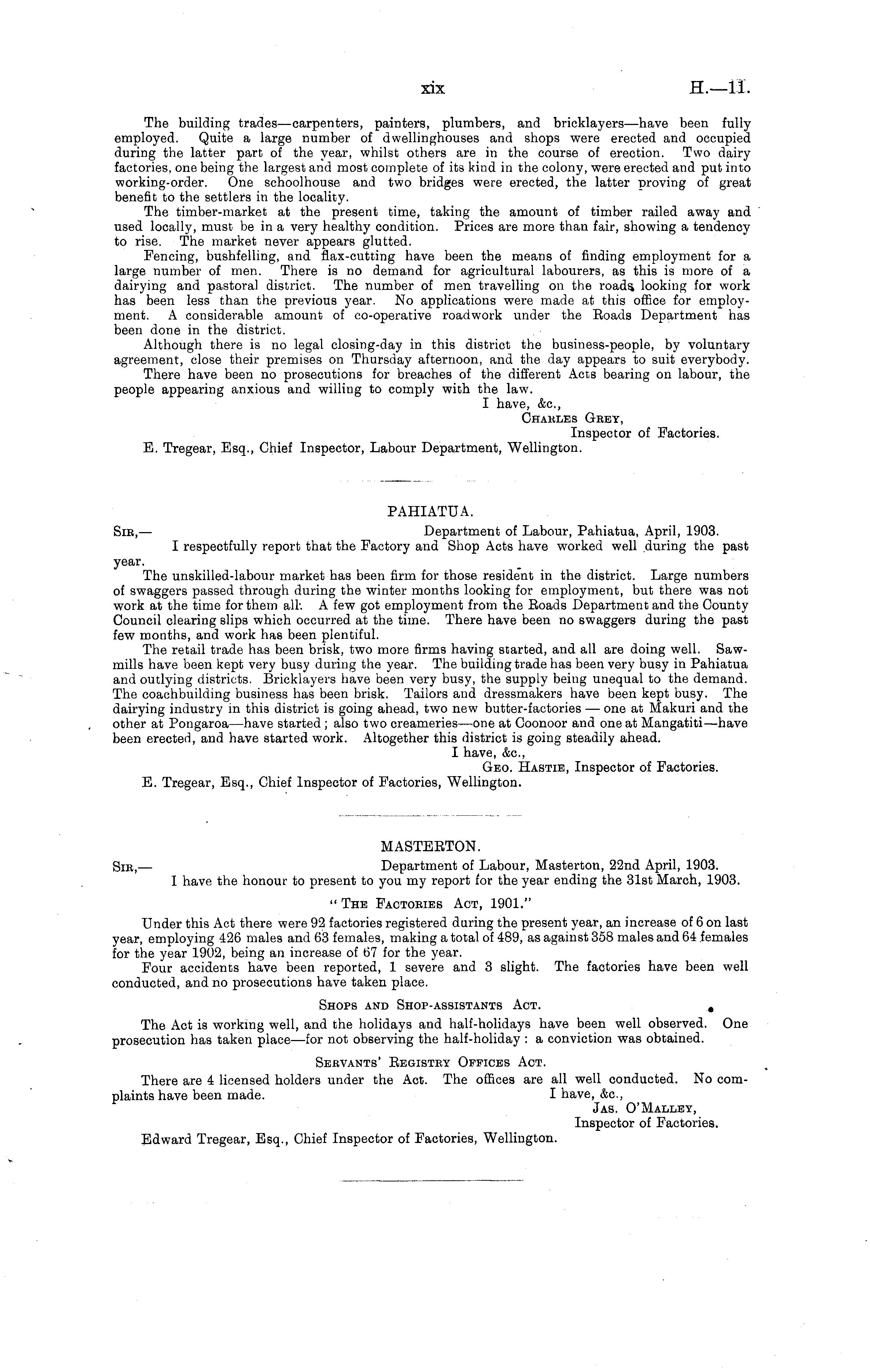MASTERTON. Sir, — Department of Labour, Masterton, 22nd April, 1903. I have the honour to present to you my report for the year ending the 31st March, 1903. " The Factories Act, 1901." Under this Act there were 92 factories registered daring the present year, an increase of 6 on last year, employing 426 males and 63 females, making a total of 489, as against 358 males and 64 females for the year 1902, being an increase of 67 for the year. Four accidents have been reported, 1 severe and 3 slight. The factories have been well conducted, and no prosecutions have taken place. Shops and Shop-assistants Act. . The Act is working well, and the holidays and half-holidays have been well observed. One prosecution has taken place —for not observing the half-holiday : a conviction was obtained. Servants' Registry Offices Act. There are 4 licensed holders under the Act. The offices are all well conducted. No complaints have been made. I have, &c, Jas. O'Malley, Inspector of Factories. Edward Tregear, Esq., Chief Inspector of Factories, Wellington.