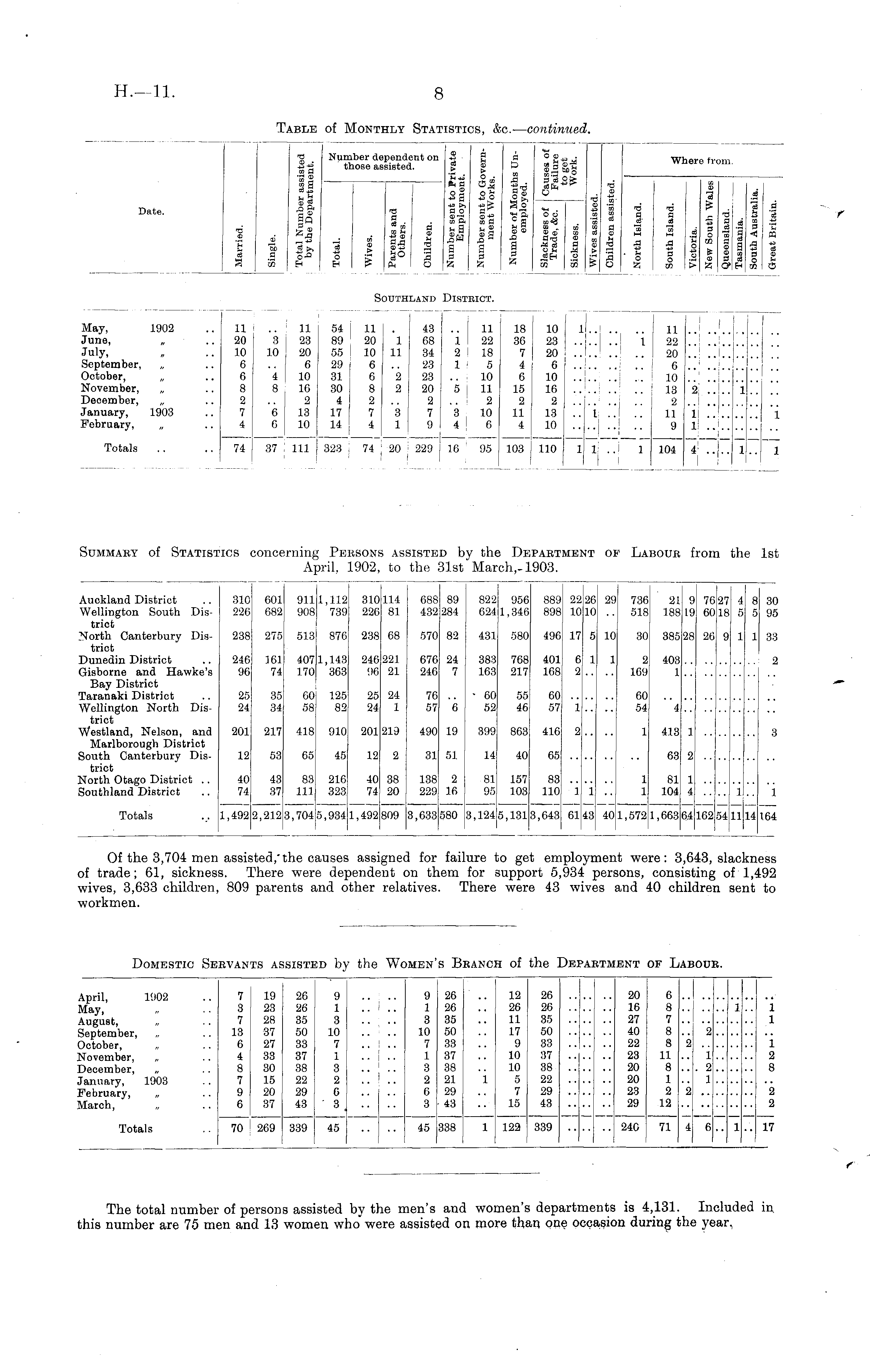 .ble of Mont: [ly Stat: :sti< IS, :. — Ct mtinued. Date. •a • a 1! t\ II 5 o-° Number de; those asi aber de hose as > ependent on -2 g ssisted. § g li S$ T3 GO S^ a a>~ Q-ts II 1 I" I 1 >ende jisted. it on P a "S ® „ . Ss L tfa* Ii |f !l . g§ ss s o - s a a -8B 5 >5 55 m DD '3 s 0 > IS c 3 5 t3 fd d a 3 ' 3 5° o i .s y, 03 i > Wher. s c X £? fri >m. .5 e B Si S ! -= 3 d I I o> n ale a. d at a QQ Si s< Southland District. 'BICT. May, 1902 June, July, September, October, November, December, „ January, 1903 February, 11 20 10 6 6 8 2 7 4 3 10 4 8 6 6 3 10 4 8 6 6 11 23 20 6 10 16 2 13 10 54 11 89 20 55 ! 10 29 I 6 31 6 30 8 4 2 17 J 7 14 4 323 74 54 89 55 ! 29 31 30 4 17 14 ii 20 10 6 0 8 i 43 .. 11 1 68 1 22 11 34 2 18 23 1 5 2 23 .. 10 2 20 5 i 11 2 I .. 2 3 7 3 10 1 9 4 J 6 18 i 10 1 11 36 23 1 1 22 ..:... 7 I 20 ' .. 20 4 j 6 6 6 10 • 10 .. 15 10 18 2 ..!.. 2 2 2 11 VS .. I .. .. 11 1 .... 4 j 10 .. .. j .. j .. 9 1 .... 103 110 11.. 1 104 4 .... 1 ll 1 1 i 1 Totals 74 37 37 111 323 74 20 229 16 95 1 1 Summary of Statisi ics c conci irning g Pe: pril, RSONS 1902, s assisted by the , to the 31st Marc 3 Department of Labouk from t •ch,-1903. tin 1st Auckland District Wellington South District .North Canterbury District Dunedin District Gisborne and Hawke's Bay District Taranaki District Wellington North District Westland, Nelson, and Marlborough District South Canterbury District North Otago District .. Southland District 310 226 001 682 911 908 1,112 739 310 220 114 81 688 432 89 284 822 624 956 1,346 889 898 10 2( L< 29 I 736 518 i 21 I 188 j 1! 76 80 27 18 4 8 5 80 95 238| j 275 518 i ; 876 238 68 570 82 431 580 496 17 10 30 385 ■28 26 33 246 96 161 74 407 170 1,143 363 246 96 221 21 676 246 24 7 383 103 768 217 401 108 6 2 1 1 2 109 403 1 2 25! 24 35 34 60 58 125 82 25 24 24 1 76 57 6 ■ 00 52 55 46 CO 57 1 60 54 4 201 217 418 910 201 219 490 19 399 863 416 1 413 3 12 53 65 45 12 2 31 51 14 40 65 63 40 74 43 37 83 111 216 323 40 74 38 20 138 229 2 16 81 95 157 103 83 110 i 1 1 1 81 104 1 4 1 1 Totals 1,492 2,212 3,704 5,934 1,492 809 3,033 580 3,124 5,131 3,643 61 13 40 1,572 1,663 >4 102 54 11 1-1 164 Of the 3,704 men assisted,'the Ci if trade; 61, sickness. There wen vives, 3,633 children, 809 parents a vorkmen. auses e dep tnd o ass: iende ther igne snt rek i for fai! Dn them ,tives. '. ure for Dhen io get emplt support 5,93 were 43 \\ 101 >eri it were : 3,643, si sons, consisting o and 40 children ackness >f 1,492 sent to ivi !S Domestic Servants assiste pa: 1TM :ent of Labour. id by the Wi imen's B: ,anc: of the April, 1902 May, August, „ September, October, November, December, „ January, 1903 February, March, „ 7 3 7 13 6 4 8 7 9 6 19 23 28 37 27 33 30 15 20 37 26 26 35 50 33 37 38 22 29 43 9 1 3 10 7 1 3 2 6 ' 3 9 1 8 10 7 1 3 2 6 3 26 26 35 50 33 37 38 21 29 • 43 12 26 11 17 9 10 10 5 7 15 26 26 35 50 33 37 38 22 29 43 20 16 27 40 22 23 20 20 23 29 6 8 7 8 8 11 8 1 2 12 2 I 2 1 . 2 1 1 i i i 2 8 I 1 2 *2 2 Totals 70 269 339 45 45 338 1 122 339 240 71 4 6 1 17 The total number of persons assisted by the men's and women's departments is 4,131. Included in ihis number are 75 men and 13 women who were assisted on more than one occasion during the year.