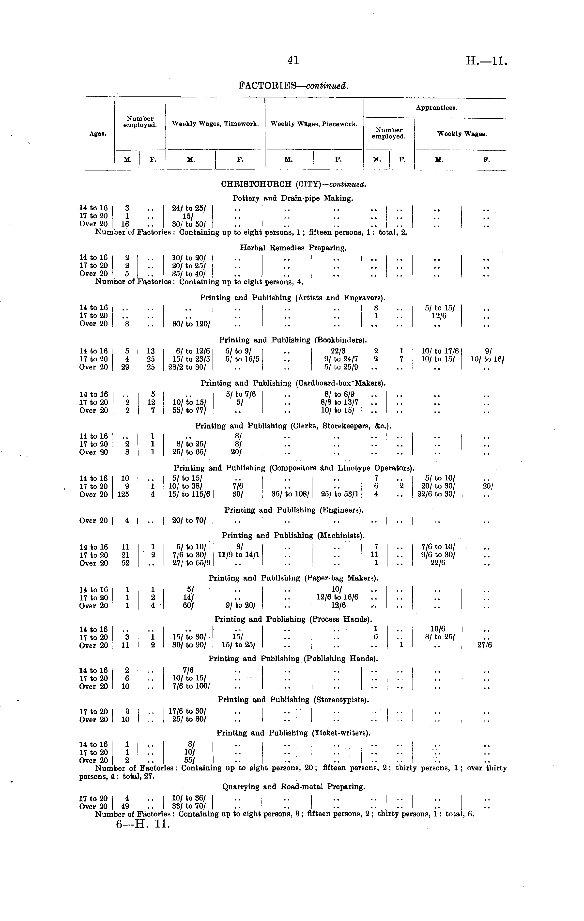 FACTOElBS— continued. Apprentices. Number employed. Weekly Wages, Timework. Weekly Wages, Piecework. Agee. eSpl&ytd. Weekl y w »8«»M. F. M. P. M. P. M. P. M. P. CHRISTOHUROH (OlTY)— continued. Pottery and Drain-pipe Making. 14t016 3 .. 24/t025/ .. .. .. .. I .. 17 to 20 1 15/ .. .. .. .... Over 20 16 .. 30/ to 50/ .. .. .. .. | .. Number of Faotories : Containing up to eight persons, 1 ; fifteen persons, 1: total, 2. Herbal Remedies Preparing. 14 to 16 2 .. I 10/ to 20/ ! 17 to 20 2 .. ! 20/ to 25/ Over 20 ! 5 .. ' 35/ to 40/ Number of Faotories : Containing up to eight persons, 4. Printing and Publishing (Artists and Engravers). 14 to 16 .. .. .. .. .. .. 3 .. 5/ to 15/ 17 to 20 .. .. .. .. .. .. 1 .. 12/6 Over 20 8 .. 30/ to 120/ Printing and Publishing (Bookbinders). 14 to 16 5 13 16/ to 12/6 5/ to 9/ | .. 22/3 | 2 1 j 10/ to 17/6 9/ 17 to 20 4 25 15/ to 23/5 5/ to 16/5 i.. 9/ to 24/71 2 7 j 10/ to 15/ 10/ to 16/ Over 20 29 |25 28/2 to 80/ .. .. 5/ to 25/91 .. Printing and Publishing (Cardboard-box Makers). 14 to 16 .. 5 .. 5/ to 7/6 .. 8/ to 8/9 .. .. .. I 17 to 20 2 12 10/ to 15/ 5/ .. 8/8 to 13/7 Over 20 2 7 55/ to 77/ .. .. I 10/ to 15/ Printing and Publishing (Clerks, Storekeepers, &c). 14 to 16 1 .. 8/ .. .. 17 to 20 2 1 8/ to 25/ 8/ Over 20 8 1 25/ to 65/ 20/ .. .. .. i .. Printing and Publishing (Compositors and Linotype Operators). 14 to 16 10 ' 5/ to 15/ j .. .. .. 7 .. 5/ to 10/ l 17 to 20 9 1 10/ to 38/ 7/6 .. .. 6 2 20/ to 30/ ! 20/ Over 20 125 4 15/ to 115/6 30/ 35/ to 108/ 25/ to 53/1 4 .. i 22/6 to 30/ ; Printing and Publishing (Engineers). Over 20 I 4 I .. I 20/ to 70/ I .. | .. .. .. | .. .. j Printing and Publishing (Machinists). 14 to 16 11 1 5/ to 10/ 8/ .. .. j 7 .. 7/6 to 10/ 17 to 20 21 2 7/6 to 30/ 11/9 to 14/1 .. .. 11 .. 9/6 to 30/ Over 20 52 .. 27/ to 65/9 .. .. .. 1 .. 22/6 Printing and Publishing (Paper-bag Makers). 14 to 16 1 1 5/ .. .. j 10/ .. 1.. 17 to 20 1 2 14/ .. .. 12/6 to 16/6 Over 20 1 4 [ 60/ 9/to 20/ .. 12/6 .-. 1.. Printing and Publishing (Process Hands). 14 to 16 .. .. .. .- .. .. 1 .. 10/6 I 17 to 20 3 1 15/ to 30/ 15/ .. .. 6 .. 8/ to 25/ ! Over 20 11 2 30/ to 90/ : 15/ to 25/ .. .. .. 1 .. | 27/6 Printing and Publishing (Publishing Hands). 14 to 16 2 7/6 .. .. .. .. ! .. 17 to 20 6 .. 10/ to 15/ Over 20 10 .. 7/6 to 100/ Printing and Publishing (Stereotypists). 17 to 20 3 .. 17/6 to 30/ .. .. .. .. .. I Over 20 10 .. 25/ to 80/ ■ Printing and Publishing (Tioket-writers). 14 to 16 1 .. 8/ 17 to 20 1 .. 10/ .. .. .. .... Over 20 2 55/ .. .. .. .. I .. Number of Faotories: Containing up to eight persons, 20; fifteen persons, 2; thirty persons, 1 ; over thirty persons, 4 : total, 27. Quarrying and Road-metal Preparing. 17 to 20 4 I .. 10/ to 36/ Over 20 49 1.. 33/ to 70/ Number of Factories : Containing up to eight persons, 3 ; fifteen persons, 2 ; thirty persons, 1 : total, 6. 6—H. 11.