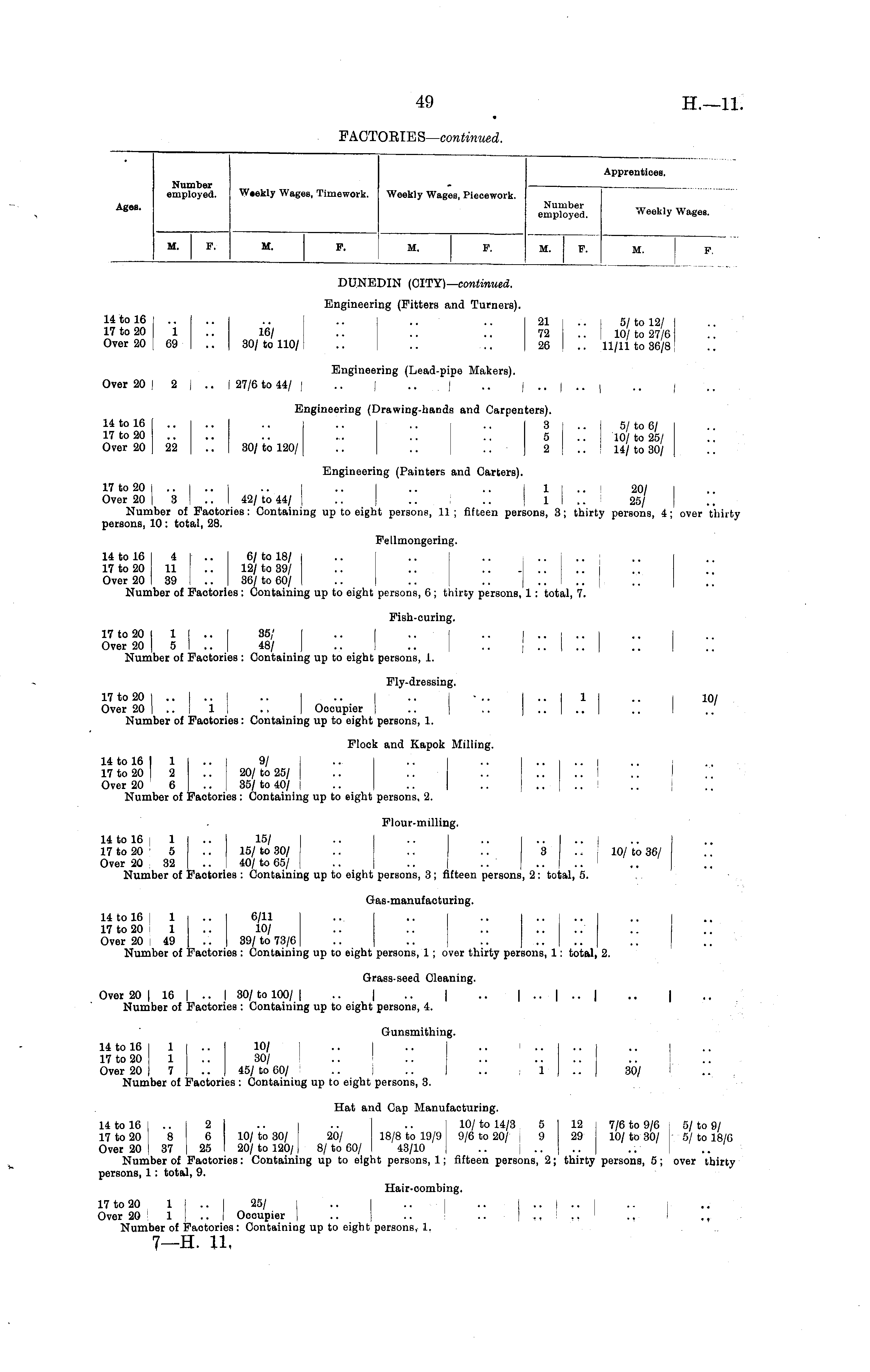 FACTORlES— continued. Apprentices. Number - _ employed. W«ekly Wages, Timework. Weekly Wages, Piecework. Ages. Number ... , , B employed. Weekly Wages. M. F. M. p. M. P. M. F. M. F. DUNEDIN (ClTY)—continued. Engineering (Fitters and Turners). 14 to 16 .. .. .. .. .. .. 21 :.• I B/ to 12/ I 17 to 20 1 16/ .. .. .. 72 .. i 10/ to 27/6 Over 20 69 .. 30/ to 110/ .. .. .. 26 11/11 to 36/8' Engineering (Lead-pipe Makers). Over 20 I 8 | ... I 27/6 to 44/ | .. | .. .. | .. | ... |.. | Engineering (Drawing-hands and Carpenters). 14 to 16 .. .. .. .. .. .. 3 .. 5/ to 6/ 17 to 20 .. .. .. ... .. .. 5 .. 10/ to 25/ Over 20 22 .. 30/ to 120/ .. .. .. 2.. ! 14/ to 30/ Engineering (Painters and Carters). 17 to 20 .... .. .. .. .. 1 .. 20/ Over 20 3 .. 42/ to 44/ .. .. .. 1 .. 25/ Number of Faotories: Containing up to eight persons, 11 ; fifteen persons, 3; thirty persons, 4; over thirty persons, 10 : total, 28. Fellmongering. 14 to 16 4 .. 6/ to 18/ .. .. [ .. .. I .. I 17 to 20 11 .. 12/ to 39/ .. .. .. I .. Over 20 39 .. 36/ to 60/ Number of Faotories : Containing up to eight persons, 6; thirty persons, 1: total, 7. Fish-curing. 17 to 20 1 I .. 35/ .. .. .. I .. I .. Over 20 5I .. 48/ .. .. .. | .. 1.. Number of Faotories : Containing up to eight persons, 1. Fly-dressing. 17 to 20 .. .. .. .. .. •.. .. II .. I 10/ Over 20 1 .. I Ooeupier .. .. .. Number of Faotories: Containing up to eight persons, 1. Flock and Kapok Milling. 14 to 16 I 1 I .. 9/ 17 to 20 I 2 .. 20/ to 25/ Over 20 6I .. 35/ to 40/ Number of Faotories : Containing up to eight persons, 2. Flour-milling. 14 to 16 i 1 I .. 15/ .. .. .. .. .. i 17 to 20 5 .. 15/ to 30/ .. .. .. 3 .. 10/ to 36/ Over 20 32 1.. 40/ to 65/ Number of Faotories : Containing up to eight persons, 3; fifteen persons, 2: total, 5. Gas-manufacturing. 14 to 16 i 1 I .. 6/11 .. .. .. .... 17 to 20 1 .. 10/ Over 20 49 |.. 39/ to 73/6 .. .. .. .... Number of Factories : Containing up to eight persons, 1 ; over thirty persons, 1: total, 2. Grass-seed Cleaning. Over 20 1161 .. j 30/ to 100/ I .. | .. | .. |.. |.. |.. | Number of Factories : Containing up to eight persons, 4. Gunsmithing. 14 to 16 1 .. 10/ .. .. .. 17 to 20 1 .. 30/ .. .. .. .... Over 20 7 .. 45/ to 60/ .. .. .. 1 .. 30/ Number of Factories : Containing up to eight persons, 3. Hat and Cap Manufacturing. 14 to 16 1.. 2 .. .. .. 10/ to 14/3 5 12 7/6 to 9/6 5/ to 9/ 17 to 20 I 8 6 10/ to 30/ 20/ 18/8 to 19/9 9/6 to 20/ 9 29 10/ to 30/ ;5/ to 18/fi Over 20 |37 25 20/ to 120/ 8/to 60/ 43/10 Number of Faotories: Containing up to eight persons, 1; fifteen persons, 2; thirty persons, 5; over thirty persons, 1 : total, 9. Hair-combing. 17 to 20 1 25/ .. .. .. .. I ... I Over 20 1 .. Ooeupier .. .. .. ~ .. .. I Number of Faotories: Containing up to eight persons, 1. 7—H. XL