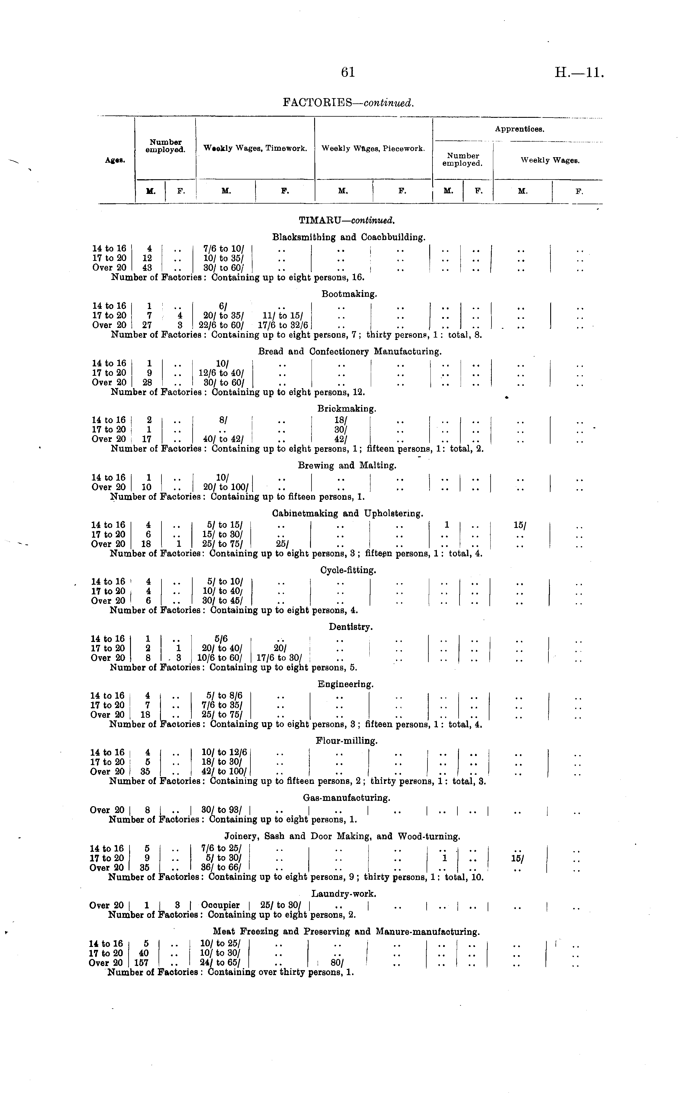 FACToElEB— oontinued. Apprentices. Number employed. Weekly Wages, Timework. Weekly Wages, Piecework. AgM. employed. Weekl y Wa « ee - M. F. M. F. M. F. M. F. M. F. TlMARU— continued. Blaoksmithing and Coacbbuilding. 14 to 16 4 : .. 7/6 to 10/ 17 to 20 12 .. 10/ to 35/ Over 20 43 .. 30/ to 60/ Number of Faotories: Containing up to eight persons, 16. Bootmaking. 14 to 16 1 .. 6/ .. I 17 to 20 7 4 20/ to 35/ 11/ to 15/ I Over 20 27 3 22/6 to 60/ 17/6 to 32/61 .. .. Number of Factories : Containing up to eight persons, 7 ; thirty peraonc, 1 : total, 8. Bread and Confectionery Manufacturing. 14 to 16 I 1 .. 10/ 17 to 20 I 9 .. 12/6 to 40/ .. .. .. .... Over 20 128 .. 30/ to 60/ Number of Factories : Containing up to eight persons, 12. Brickmaking. 14 to 16 i 2 8/ .. 18/ 17 to 20 1 .. .. .. 30/ .. .. .. .. .. " Over 20 17 .. 40/ to 42/ .. 42/ Number of Factories : Containing up to eight persons, 1; fifteen persons, 1: total, 2. Brewing and Malting. 14 to 16 ! 1 .. 10/ .. .. .. I .. Over 20 ilO .. 20/ to 100/ .. .. .. | .. Number of Factories : Containing up to fifteen persons, 1. Cabinetmaking and Upholstering. 14 to 16 4 5/ to 15/ .. .. .. 1 I .. 15/ 17 to 20 6 .. 15/ to 30/ Over 20 18 1 25/ to 75/ 25/ Number of Factories: Containing up to eight persons, 3 ; fifteen persons, 1: total, 4. Cycle-fitting. 14 to 16 4 .. 5/ to 10/ 17 to 20 4 .. 10/ to 40/ Over 20 6 .. 30/ to 45/ Number of Factories : Containing up to eight persons, 4. Dentistry. 14 to 16 1 5/6 .. .. .. .... 17 to 20 2 1 20/ to 40/ 20/ Over 20 8.3 10/6 to 60/ 17/6 to 30/ Number of Factories : Containing up to eight persons, 5. Engineering. 14 to 16 4 .. 5/ to 8/6 17 to 20 : 7 .. 7/6 to 35/ Over 20 !18 .. 25/ to 75/ Number of Faotories : Containing up to eight persons, 3 ; fifteen persons, 1: total, 4. Flour-milling. 14 to 16 I 4 .. 10/ to 12/6 .. .. .. .. .. j 17 to 20 5 .. 18/ to 30/ Over 20 35 .. 42/ to 100/ .. .. .. .... Number of Factories: Containing up to fifteen persons, 2 ; thirty persons, 1: total, 3. Gas-manufacturing. Over 20 181 .. I 30/ to 98/ I .. | .. | .. | .. |.. | .. | Number of Faotories : Containing up to eight persons, 1. Joinery, Sash and Door Making, and Wood-turning. 14 to 16 5 .. 7/6 to 25/ .. .. .. 17 to 20 9 5/ to 30/ .. .. .. 1 .. 15/ Over 20 35 .. 36/ to 66/ Number of Factories: Containing up to eight persons, 9 ; thirty persons, 1: total, 10. Laundry-work. Over 20 Il| 3 | Oooupier j 25/ to 30/ | .. | .. | .. ].. j .. | Number of Faotories : Containing up to eight persons, 2. Meat Freezing and Preserving and Manure-manufacturing. 14 to 16 5 .. 10/ to 25/ .. .. .. .. .. .. I* .. 17 to 20 40 .. 10/ to 30/ Over 20 157 .. i 24/ to 65/ .. 80/ > Number of Faotories : Containing over thirty persons, 1.