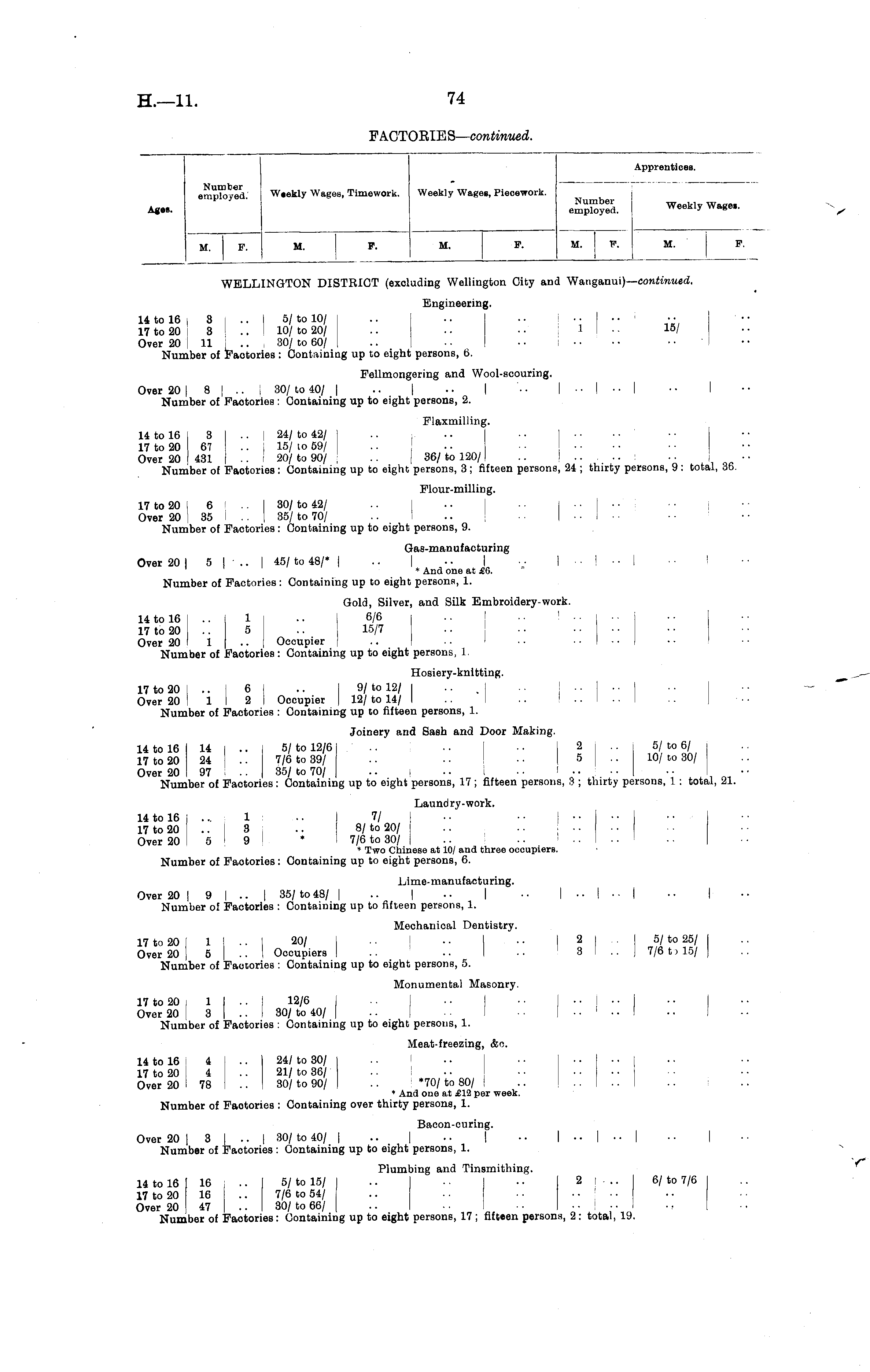 FACTORIES-—continued. Apprentices. emuk>Ted Weekly Wages, Timework. Weekly Wages, Piecework. Aβ... ■ .5335. j WeeU lyWage .. M. P. M. P. M. P. M. F. M. P. WELLINGTON DISTRICT (excluding Wellington City and Wanganui)— continued. Engineering. U to 16 i 3 .. 5/ to 10/ 17 to 20 3 .. 10/ to 20/ .. .. • • 1 • ■ 15 / Over 20 11 ~. 30/ to 60/ .. .. • ■ •• ■ • Number of Factories : Containing up to eight persons, b. Pellmongering and Wool-scouring. Over 20 1. 8 I .. I 30/ to 40/ I .. | • • I • • I ■ ■ I ■ ■ I • • I Number of Factories : Containing up to eight persons, 2. Flaxmilling. 14 to 16 3 .. ' 24/ to 42/ > 17 to 20 67 .. j 15/ io 59/ Over 20 431 .. I 20/ to 90/ .. | 36/ to 120/ .. .. .. .. Number of Faotories: Containing up to eight persons, 3; fifteen persons, 24 ; thirty persons, 9: total, db. Flour-milling. 17 to 20 ! 6 .. 30/ to 42/ .. I Over 20 : 35 .. 35/ to 70/ Number of Factories : Containing up to eight persons, 9. Gas-manufacturing Over 20 Is| .. | 45/ to 48/* | .. | .. |.■ | .. |.. | * And one at £8. Number of Factories: Containing up to eight persona, 1. Gold, Silver, and Silk Embroidery-work. Utoie .. I 1 I •• I 6/6 •• • ! •■ 17 to 20 .. 5 .. 15/7 .. .. .... Over 20 1| .. Occupier I Number of Factories: Containing up to eight persons, 1. Hosiery-knitting. 17 to 20 I .. 6 .. 9/ to 12/ I ... Over 20 ! 1 2 Occupier 12/ to 14/ I Number of Factories : Containing up to fifteen persons, 1. Joinery and Saeh and Door Making. 14 to 16 14 .. 5/ to 12/6 .. ■. ■ ■ 2 , .. 5/ to 6/ 17 to 20 24 J.. 7/6 to 39/ .. •. • ■ 5| .. 10/ to 30/ j Over 20 97 .. 35/ to 70/ .. | .. I • • I .. •■■ • i Number of Faotories : Containing up to eight persons, 17 ; fifteen persons, 3 ; thirty persons, I : total, 21. Laundry-work. 14 to 16 ... 1 .. I 7/ 17 to 20 ! .. 3 .. 8/ to 20/ Over 20 ! 5 9 * 7/6 to 30/ | ♦ Two Chinese at 10/ and three occupiers. Number of Factories: Containing up to eight persons, 6. Lime-manufacturing. Over 20 I 9 I .. I 35/ to 48/ I .. | .. | • • I ■ ■ I • ■ i ■ • I Number of Factories : Containing up to fifteen pereons, 1. Mechanical Dentistry. 17 to 20 1 20/ .. .. • • 2 5/ to 25/ Over 20 5 .. Occupiers .. .. • • 3 .. 7/6 t > 15/ Number of Faotories : Containing up to eight persons, 5. Monumental Masonry. 17 to 20 1 .. I 12/6 I ■ • ■ • .... Over 20 3 .. I 30/ to 40/ j Number of Factories : Containing up to eight persons, 1. Meat-freezing, &c. 14 to 16 4 .. 24/ to 30/ .. .. ■ • •. •■ j 17 to 20 4 .. 21/ to 36/ Over 20 78 .. 30/ to 90/ .. '70/ to 80/ ! • And one at £12 per week. Number of Faotories : Containing over thirty persons, 1. Bacon-curing. Over 20 131 .. I 30/ to 40/ I .. | .. | ••| .. |.. | .. | Number of Factories : Containing up to eight persons, 1. Plumbing and Tinsmithing. 14 to 16 16 .. 5/ to 15/ .. .. .. 2I- .. 6/ to 7/6 17 to 20 16 i.. 7/6 to 54/ Over 20 47 i.. 30/ to 66/ .. ■. I ■ • • • • • I Number of Faotories: Containing up to eight persons, 17 ; fifteen persons, 2 : total, 19.