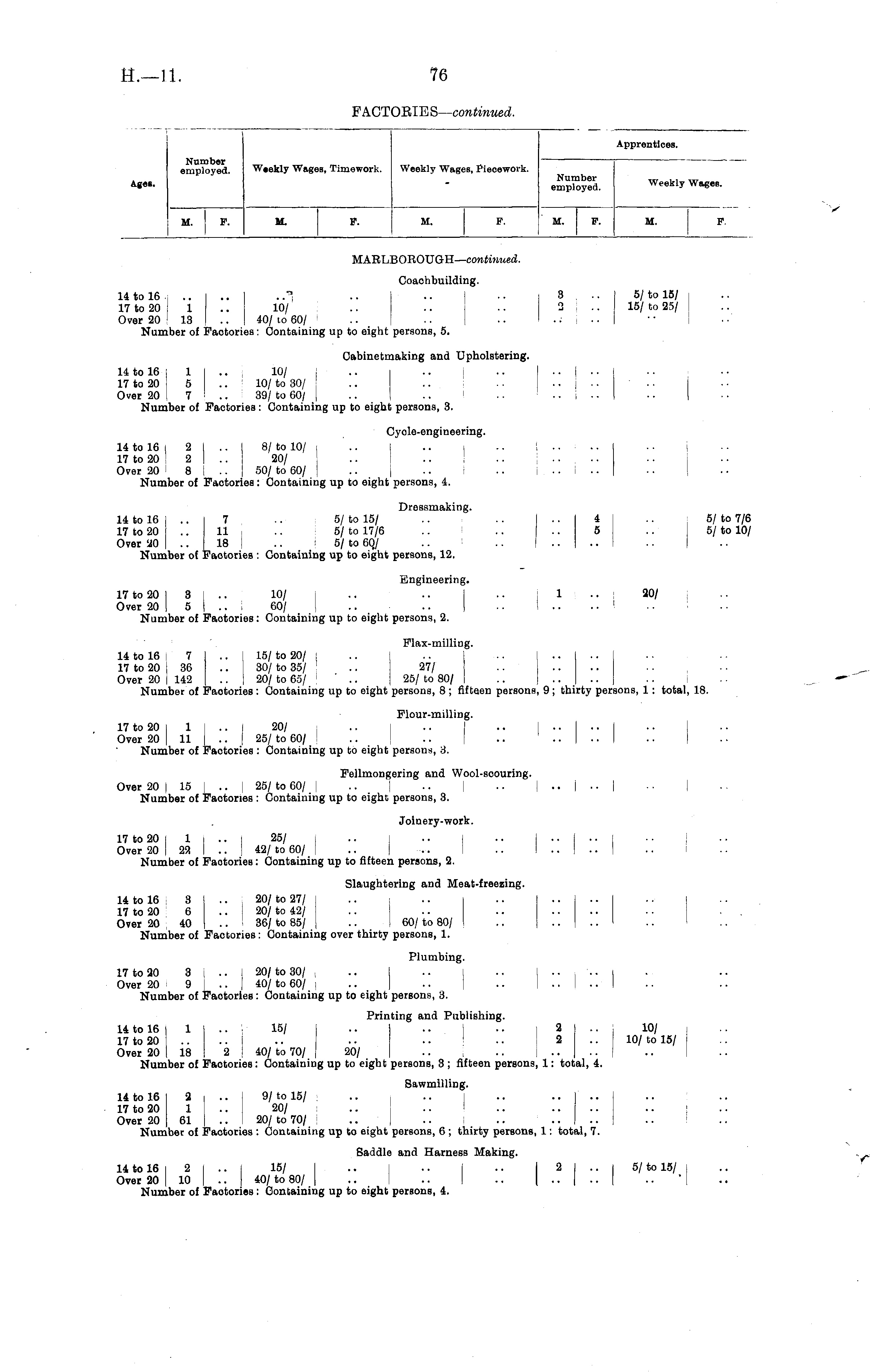 PAoToElBB— continued. Apprentices. Nutober employed Wtekly Wages, Timework. Weekly Wages, Piecework. *~ - eSp"yed. Weekly Wages. M. F. M. F. M. F. M. F. M. F. MARLBOROUGH— continued. Ooaohbuilding. 14 to 16. .. .. .."■ .. •• •• 3 .. 5/ to 15/ 17 to 20 • 1 .. 10/ .. .. .. 2 .. 15/ to 25/ Over 20 '13 .. 40/ io 60/ .. .. .. ..- •. ■ • I Number of Factories: Containing up to eight persons, 5. Oabinetmaking and Upholstering. 14 to 16 : 1 .. 10/ I .. .. .. .. ! .. 17 to 20 j 5 .. 10/ to 30/ ! Over 20 7 .. 39/ to 60/ Number of Factories : Containing up to eight persons, 3. Cyole-engineering. 14 to 16 i 2 .. 8/ to 10/ i 17 to 20 ' 2 .. 20/ Over 20 8 i .. 50/ to 60/ .. .. .. .. i .. Number of Faotories : Containing up to eight persons, 4. Dressmaking, 14 to 16 .. I 7 .. 5/ to 15/ .. .. .. 4 .. 5/ to 7/6 17 to 20 .. 11 .. 5/ to 17/6 .. .. .. 5 .. 5/ to 10/ Over 20 .. \lB .. 5/ to 6Q/ Number of Factories : Containing up to eight persons, 12. Engineering. 17 to 20 3! .. 10/ i .. .. .. 1 20/ Over 20 5 ! .. 60/ .. .. .. .... Number of Factories: Containing up to eight persons, 2. Flax-milling. 14 to 16 7 .. 15/ to 20/ 17 to 20 ;36 .. i 30/ to 35/ .. 27/ Over 20 i 142 .. ! 20/ to 65/ ' .. 25/ to 80/ Number of Faotories : Containing up to eight persons, 8 ; fifteen persons, 9; thirty persons, 1 : total, 18. Flour-milling. 17 to 20 1 .. 20/ .. .. .. .. .. j Over 20 11 .. 25/ to 60/ .. .. .. .. .. I Number of Faotories : Containing up to eight persons, 8. Fellmongering and Wool-scouring. Over 20 1151 .. I 25/ to 60/ I .. .. | .. .. | .. | ■ ■ | Number of Factories : Containing up to eight persons, 3. Joinery-work. 17 to 20 1 I .. 25/ [ Over 20 25! !.. 42/ to 60/ Number of Faotoriee : Containing up to fifteen persons, 2. Slaughtering and Heat-freezing. 14 to 16 3 .. 20/ to 27/ 17 to 20 6 .. I 20/ to 42/ .. .. .. .. .. .. . . Over 20 40 .. 36/ to 85/ .. 60/ to 80/ Number of Factories : Containing over thirty persons, 1. Plumbing. 17 to 20 3 .. i 20/ to 30/ .. .. .. .. .. I Over 20 9 ; .. ' 40/ to 60/ Number of Faotories: Containing up to eight persons, 3. Printing and Publishing. 14 to 16 ! 1 15/ .. .. .. 2 10/ 17 to 20 .. .. .. •• ■ • • • 2.. j 10/ to 15/ Over 20 18 I 2 ; 40/ to 70/ 20/ Number of Faotories: Containing up to eight persons, 3 ; fifteen persons, 1: total, 4. Sawmilling. 14 to 16 2 .. 9/ to 15/ 17 to 20 1 .. 20/ Over 20 61 .. 20/ to 70/ Number of Factories : Containing up to eight persons, 6 ; thirty persons, 1: total, 7. Saddle and Harness Making. 14 to 16 2 .. 15/ .. .. .. 2 .. I 5/ to 15/ Over 20 10 .. 40/ to 80/ .. .. .. .. Number of Faotories: Containing up to eight persons, 4.