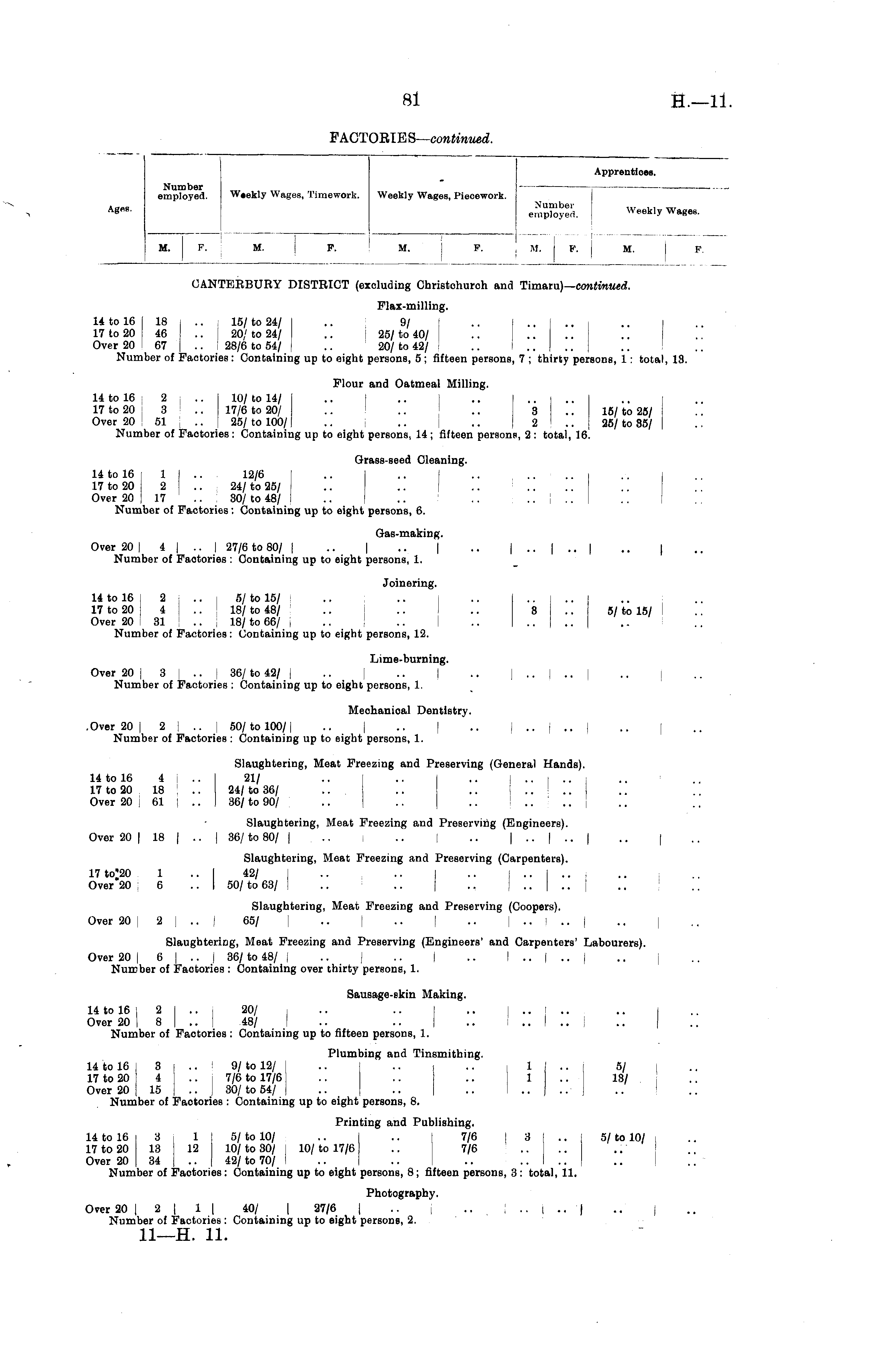 FACTOElES— continued. Apprentices. Number ■—■ employed. W«ekly Wages, Timework. Weekly Wages, Piecework. ■ „.. Number ... ~ _, 7 Ag«e. employed. Weekly Wagee. M. F. | M. F. M. P. i M. I R M. F. CANTERBURY DISTRICT (excluding Christohuroh and Timaru)— continued. Flax-milling. 14 to 16 18 .. 15/ to 24/ .. 9/ ] 17 to 20 46 .. J 20/ to 24/ .. i 25/ to 40/ Over 20 !67 .. I 28/6 to 54/ .. 20/ to 42/ .. i.. Number of Faotoriea : Containing up to eight persons, 5 ; fifteen persons, 7 ; thirty persons, 1 : total, 18. Flour and Oatmeal Milling. 14 to 16 2 .. 10/ to 14/ 17 to 20 3 .. 17/6 to 20/ .. .. .. 3 .. 16/ to 25/ Over 20 51 .. 25/ to 100/ .. .. .. 2 .. 25/ to 85/ Number of Paotories : Containing up to eight persons, 14 ; fifteen persons, 2 : total, 16. Grass-seed Cleaning. 14 to 16 1 .. 12/6 17 to 20 2 .. 24/ to 25/ Over 20 17 .. 30/ to 48/ ! Number of Factories: Containing up to eight persons, 6. Gas-making. Over 20 I4| .. | 27/6 to 80/ | .. | .. | .. | .. | .. | .. | Number of Faotories : Containing up to eight persons, 1. Joinering. 14 to 16 , 2 .. 5/ to 15/ 17 to 20 i 4 .. 18/ to 48/ .. .. .. 8 .. 5/ to 15/ Over 20 :31 .. ,18/ to 66/ , Number of Factories: Containing up to eight persons, 12. Lime-burning. Over 20 J 3 .. 36/ to 42/ i .. | .. .. ).. j.. | .. j Number of Factories : Containing up to eight persons, 1. Mechanical Dentistry. .Over 20 [ 2 .. | 50/ to 100/ .. | .. | .. .. j .. .. | Number of Factories : Containing up to eight persons, 1. Slaughtering, Meat Freezing and Preserving (General Hands). 14 to 16 4 .. 21/ .. .. .. 17 to 20 18 .. 24/ to 36/ Over 20 ; 61 l .. 36/ to 90/ Slaughtering, Meat Freezing and Preserving (Engineers). Over 20 1181 .. I 36/ to 80/ I .. .. | .. |.. |.. |.. | Slaughtering, Meat Freezing and Preserving (Carpenters). 17 to'2o 1 .. I 42/ .. .. .. I .. .. , Over 20 6.. I 50/ to 63/ I .. .. .. | .. Slaughtering, Meat Freezing and Preserving (Coopers). Over 20 i2I .. I 65/ I .. | .. .. [..!.. | .. | Slaughtering, Meat Freezing and Preserving (Engineers' and Carpenters' Labourers). Over 20 !6I .. j 36/ to 48/ I .. | .. | .. I .. |.. |.. ' | Number of Faotories : Containing over thirty persons, 1. Sausage-skin Making. 14 to 16 j 2 .. 20/ .. .. i .. .. 1.. Over 20 ! 8 .. 48/ .. .. .. .... Number of Faotories : Containing up to fifteen persons, 1. Plumbing and Tinsmithing. 14 to 16 3 : .. 9/ to 12/ .. .. .. I 1 .. 5/ 17 to 20 4 ! .. 7/6 to 17/6 .. .. .. 1 13/ Over 20 15 j .., 30/ to 54/ .. .. .. I .. Number of Faotories : Containing up to eight persons, 8. Printing and Publishing. 14 to 16 3 1 5/ to 10/ .. .. 7/6 18 1.. 5/ to 10/ 17 to 20 13 12 10/ to 30/ 10/ to 17/6 .. 7/6 Over 20 34 1.. 42/ to 70/ .. .. .. ..IV. Number of Faotories: Containing up to eight persons, 8; fifteen persons, 3 : total, 11. Photography. Over 20 I 2 I 1 I 40/ | 27/6 | .. .. \ .. \.. \ Number of Factories : Containing up to eight persons, 2. 11— H. 11.