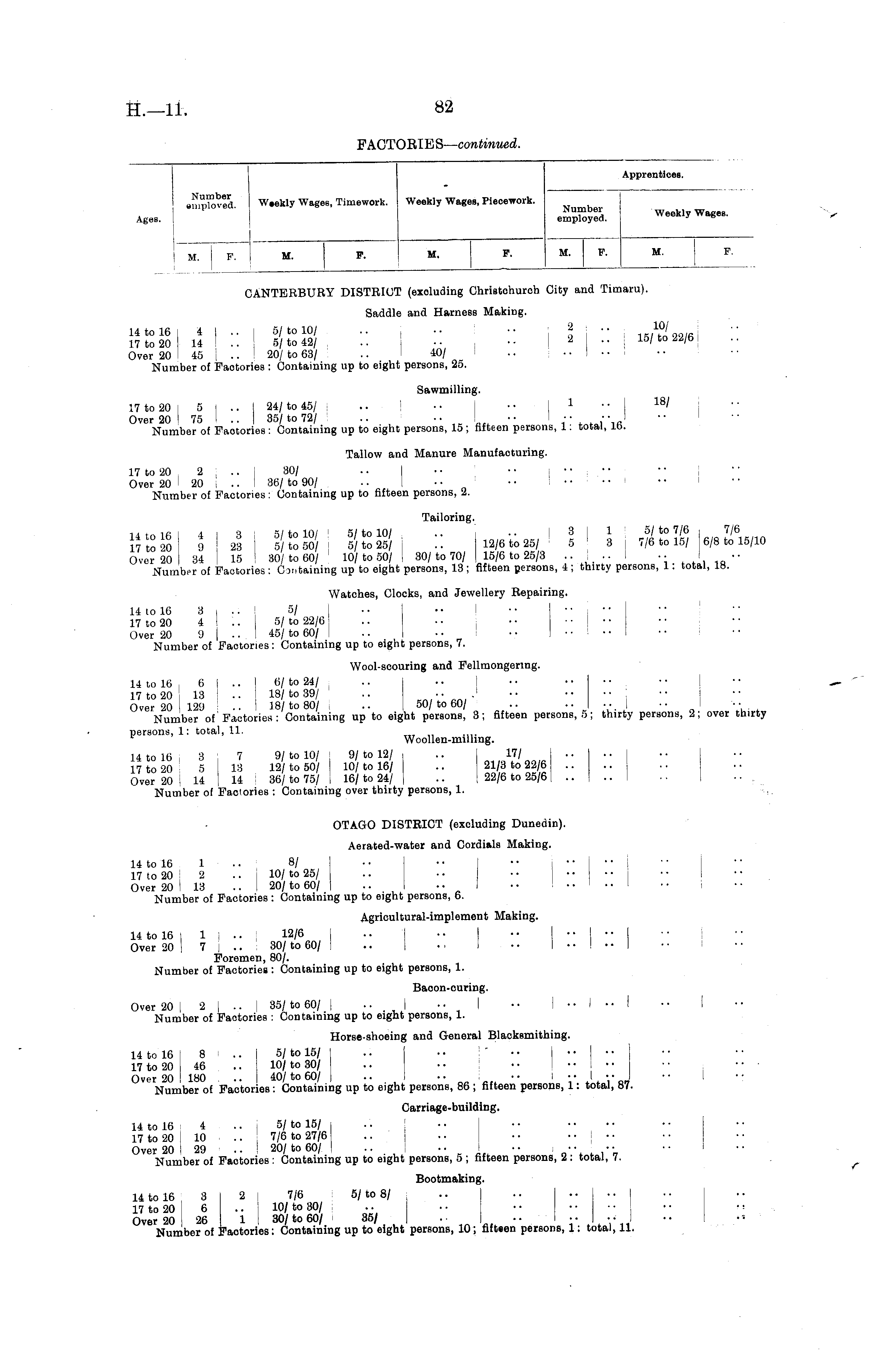 FACTOBIES— cmtwmd. Apprentices. empCfd. W.ekly Wages, Timework. Weekly Wages, Piecework. Ages. Weekly Wages. M. P. M. F. M. P. M. P. M. F. CANTERBURY DISTRICJT (exoluding Christohuroh City and Timaru). Saddle and Harness Making. 14 to 16 4 .. 5/to 10/ .. •• •• I ■■ 1(; A 0/ QO/fi^ 17 to 20 14 .. 5/to 42/ .. ■■ •- 2 •■ 15/ to 22/61 Over 20 45 I ..! 20/ to 63/ .. 40/ I .. .. |.. Number of Faotories : Containing up to eight persons, 25. Sawmilling. 17 to 20 i 5 .. 24/ to 45/ :.. • • • • I 1• ■ 18 ' Over 20! 75 •■ 35/ to 72/ .. •• I ■• I ■■ !•• J Number of Faotories : Containing up to eight persons, 15 ; fifteen persons, 1: total, 10. Tallow and Manure Manufacturing. 17 to '20 2; .. 30/ .. • ■ • • '•I .' • Over 20 I 20 i .. 36/ to 90/ .. Number of Factories: Containing up to fifteen persons, 2. Tailoring. SSS 9!£i K$ : I'ltll'i i:: an*** ! 5I S I riKSS! J^Vo Over 20 34 |15 30/ to 60/ 10/ to 50/ | 30/ to 70/ 15/6 to 25/3 •• 1•■ ■• , 1O " Uumber of Faotories : Containing up to eight persons, 13 ; fifteen persons, 4 ; thirty persons, l: total, is. Watches, Clocks, and Jewellery Repairing. 14i016 3 5/ .. •• •• .... 17 to 20 4 .. 5/ to 22/6 .. • • • • .... Over 20 9| .. 45/ to 60/ .. .. I Number of Faotories: Containing up to eight persons, 7. Wool-scouring and Fellmongenng. 14 to 16 , 6 .. 6/ to 24/ 17 to 20 il3 .. 18/ to 39/ .. Over 20 ' 12'J .. 58/ to 80/ .. 50/ to 60/ .. .. •. | Number of Factories : Containing up to eight persons, 3; fifteen persons, 5; thirty persons, 2; over thirty persons, 1: total, 11. Woollen-milling. 14 to 16 I 8 1 7 9/ to 10/ 9/ to 12/ .. 17/ I .. 17 to 20 5I 13 12/ to 50/ j 10/ to 16/ .. 21/3 to 22/6 Over 20 Il4| 14 36/ to 75/ \ 16/ to 24/ .. 22/6 to 25/6 .. .. .. Number of Factories : Containing over thirty persons, 1. OTAGO DISTRICT (excluding Dunedin). Aerated-water and Cordials Making. 14 to 16 1 .. 8/ .. •• i 17 to 20 2.. j 10/ to 25/ Over 20 il3 .. ! 20/ to 60/ .. Number of Factories : Containing up to eight persons, o. Agricultural-implement Making. 14 to 16 i 1 , .. 12/6 j Over 20 1 7 I ... 30/ to 60/ I .. ■ . i Foremen, 80/. Number of Factories : Containing up to eight persons, 1. Baoon-curing. Over 20 121 .. I 35/ to 60/ I .. I ••I••I• • I • • I • • I Number of Faotories : Containing up to eight persons, 1. Horse-shoeing and General Blackemithing. 14 to 16 I 8 .. 5/ to 15/ 17 to 20 146 .. 10/ to 30/ .. • • • • • • ■ ■ • • ■ • • Over 20 ! 180 .. 40/ to 60/ | .. •■ •• i •• I •• ■'■ I Number of Factories : Containing up to eight persons, 86 ; fifteen persons, 1: total, 87. Carriage-building. 14 to 16 4 .. I 5/ to 15/ 17 to 20 ! 10 .. 7/6 to 27/6 .. .. •• .... Over 20 129 .. i 20/ to 60/ .. | .. •■ B '\^," e Number of Factories : Containing up to eight persons, 5 ; fifteen persons, 2 : total, 7. Bootmaking. 14 to 16 3 2 ! 7/6 5/to 8/ , 17 to 20 I 6 .. j 10/ to 30/ Over 20 !26 1 | 30/ to 60/ 35/ . ■ .... .. | .. .■■ Number of Factories: Containing up to eight persons, 10; fifteen persons, 1: total, 11.