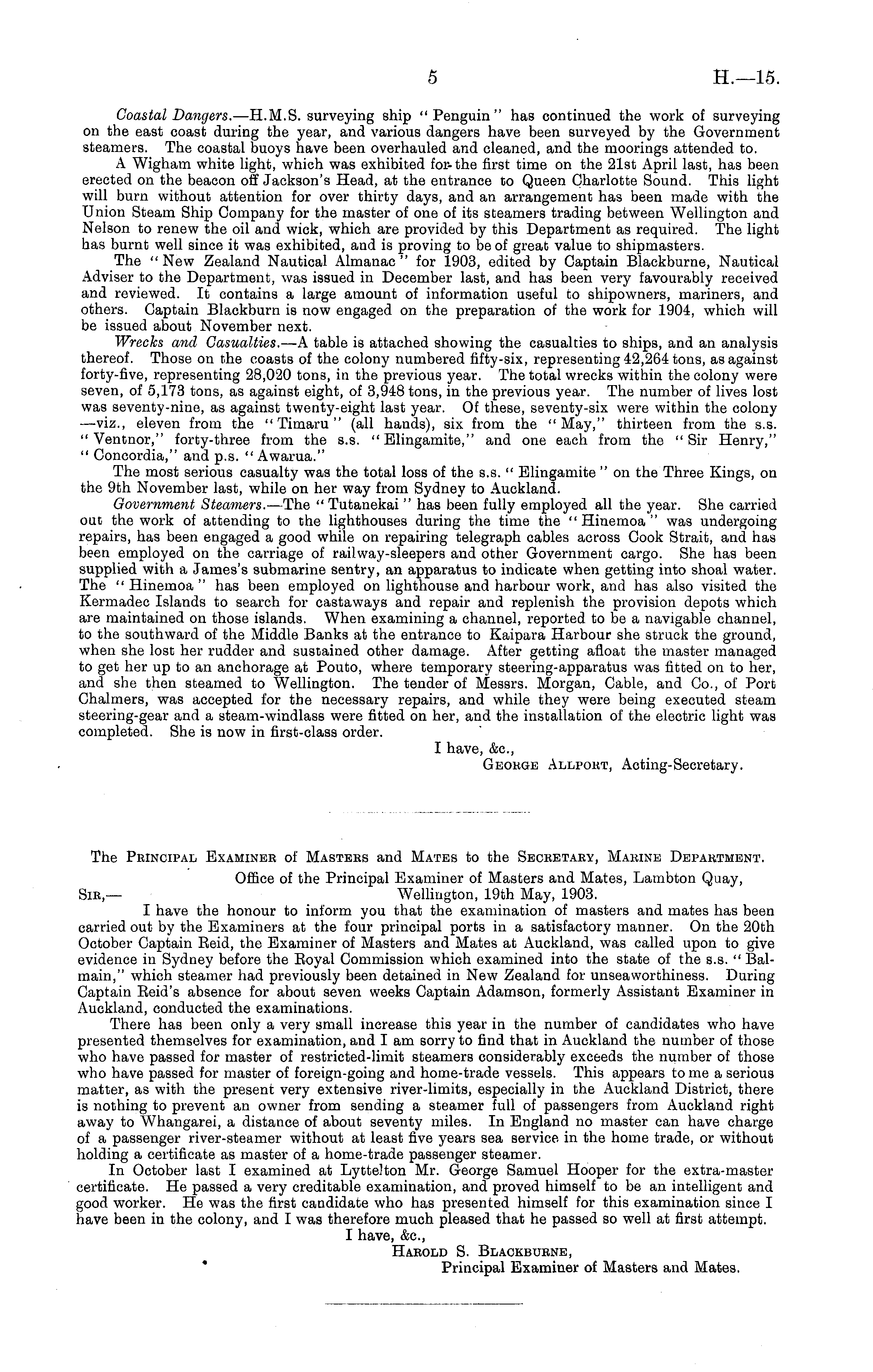 The Principal Examiner of Masters and Mates to the Secretary, Marine Department. Office of the Principal Examiner of Masters and Mates, Lambton Quay, Sir,— Wellington, 19th May, 1903. I have the honour to inform you that the examination of masters and mates has been carried out by the Examiners at the four principal ports in a satisfactory manner. On the 20th October Captain Reid, the Examiner of Masters and Mates at Auckland, was called upon to give evidence in Sydney before the Royal Commission which examined into the state of the s.s. " Balmain," which steamer had previously been detained in New Zealand for unseaworthiness. During Captain Reid's absence for about seven weeks Captain Adamson, formerly Assistant Examiner in Auckland, conducted the examinations. There has been only a very small increase this year in the number of candidates who have presented themselves for examination, and I am sorry to find that in Auckland the number of those who have passed for master of restricted-limit steamers considerably exceeds the number of those who have passed for master of foreign-going and home-trade vessels. This appears to me a serious matter, as with the present very extensive river-limits, especially in the Auckland District, there is nothing to prevent an owner from sending a steamer full of passengers from Auckland right away to Whangarei, a distance of about seventy miles. In England no master can have charge of a passenger river-steamer without at least five years sea service in the home trade, or without holding a certificate as master of a home-trade passenger steamer. In October last I examined at Lyttelton Mr. George Samuel Hooper for the extra-master certificate. He passed a very creditable examination, and proved himself to be an intelligent and good worker. He was the first candidate who has presented himself for this examination since I have been in the colony, and I was therefore much pleased that he passed so well at first attempt. I have, &c, Harold S. Blackburne, Principal Examiner of Masters and Mates.