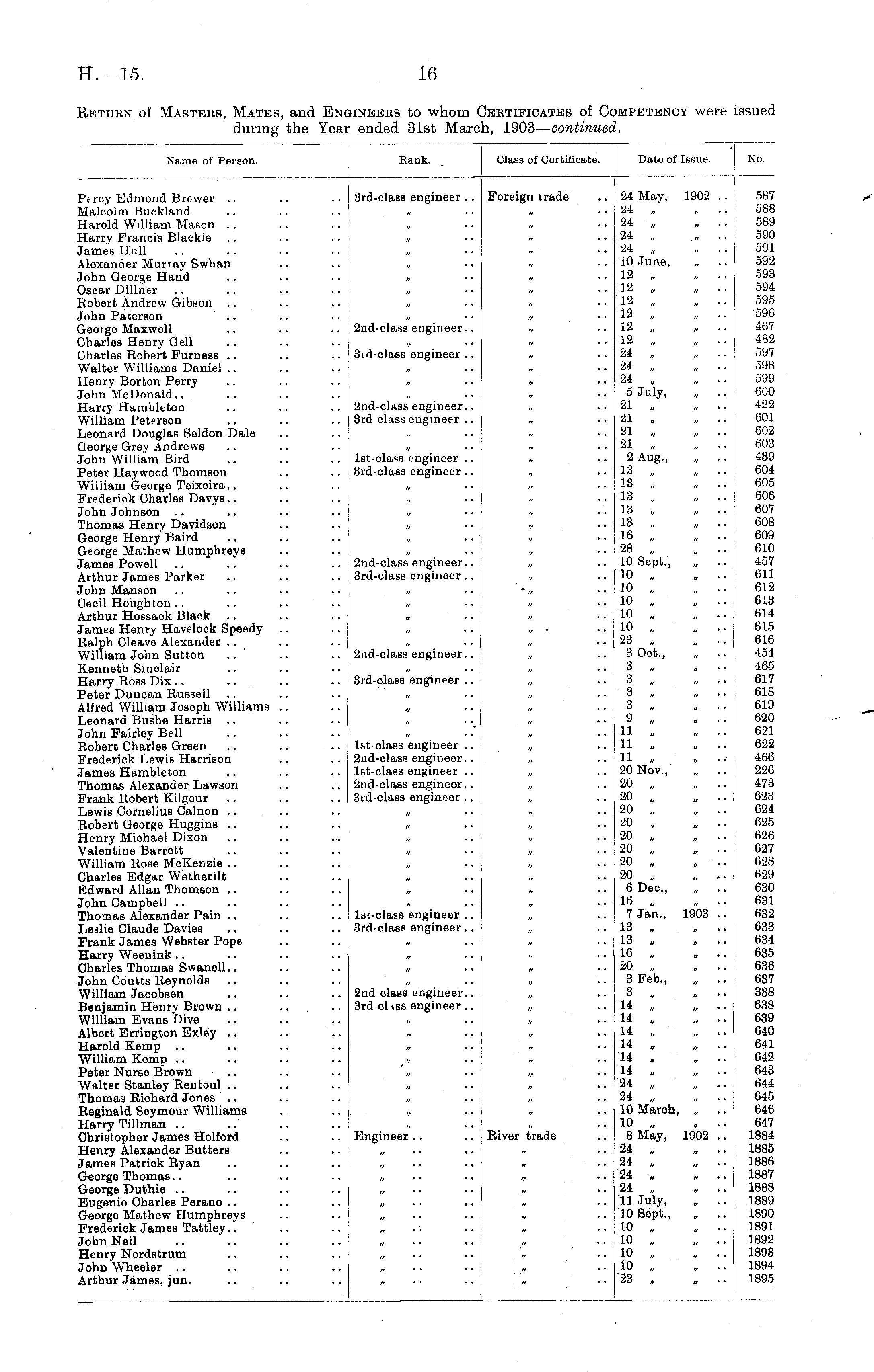 Name of Person. Rank. Class of Certificate. Date of Issue. No. Percy Edmond Brewer Malcolm Buckland Harold William Mason Harry Francis Blaokie James Hull Alexander Murray Swhan John George Hand Oscar Dillner Robert Andrew Gibson John Paterson Geoige Maxwell Charles Henry Gell Charles Robert Furness Walter Williams Daniel .. Henry Borton Perry John McDonald.. Harry Hambleton William Peterson Leonard Douglas Seldon Dale George Grey Andrews John William Bird Peter Haywood Thomson William George Teixeira.. Frederick Charles Davys.. John Johnson Thomas Henry Davidson George Henry Baird George Mathew Humphreys James Powell Arthur James Parker John Manson Cecil Houghton .. Arthur Hossack Black James Henry Havelock Speedy Ralph Cleave Alexander William John Sutton Kenneth Sinclair Harry Ross Dix Peter Duncan Russell Alfred William Joseph Williams .. Leonard Bushe Harris John Fairley Bell Robert Charles Green Frederick Lewis Harrison James Hambleton Thomas Alexander Lawson Frank Robert Kilgour Lewis Cornelius Calnon Robert George Huggins Henry Michael Dixon Valentine Barrett William Rose McKenzie Charles Edgar Wetherilt Edward Allan Thomson John Campbell Thomas Alexander Pain .. Leslie Claude Davies Frank James Webster Pope Harry Weenink Charies Thomas Swanell.. John Coutts Reynolds William Jacobsen Benjamin Henry Brown William Evans Dive Albert Errington Exley Harold Kemp William Kemp Peter Nurse Brown Walter Stanley Rentoul Thomas Richard Jones Reginald Seymour Williams Harry Tillman Christopher James Holford Henry Alexander Butters James Patriok Ryan George Thomas George Duthie Eugenio Charles Perano George Mathew Humphreys Frederick James Tattley.. John Neil Henry Nordstrum John Wheeler Arthur James, jun. 3rd-clas8 engineer .. 2nd-class engineer.. 3rd-class engineer .. 2nd-class engineer.. 3rd class engineer .. lst-class engineer . . 3rd-class engineer .. 2nd-class engineer.. 3rd-class engineer .. 2nd-olass engineer.. 3rd-claBs engineer .. 1st class engineer .. 2nd-class engineer.. lst-class engineer .. 2nd-class engineer.. 3i'd-class engineer .. Foreign irade 24 May, 1902 .. 24 „ „ 24 „ „ .. 24 „ „ .. 24 „ „ .. 10 June, 12 „ „ .. 12 „ „ .. 12 „ „ .. 12 . „ .. 12 „ „ .. 12 „ „ .. 24 „ , .. 24 „ , .. 24 „ „ .. 5 July, „ 21 „ „ .. 21 „ „ .. 21 „ „ .. 21 „ „ .. 2 Aug., „ .. 13 „ „ .. 13 „ „ .. 13 „ „ .. 13 13 „ , .. 16 „ „ .. 28 10 Sept., "„ .. 10 „ . .. 10 „ „ .. 10 „ „ .. 10 „ „ .. 10 „ „ .. 23 „ „ .. 3 Oct 3 „ „ .. 8 . „ .. 3 „ „ .. 3 9 „ „ .. 11 „ „ .. 11 „ „ ■■ 11 . . •• 20 Nov., „ .. 20 „ „ .. 20 „ „ .. 20 „ , .. 20 „ „ .. 20 , „ .. 20 „ „ .. 20 , „ .. 20 „ „ .. 6 Dec, „ .. 16 „ , .. 7 Jan., 1908 .. 13 . „ .. 13 „ „ .. 16 „ „ .. 20 „ „ .. 3 Feb., „ .. 3 „ „ .. 14 „ „ .. 14 „ „ .. 14 14 . „ .. 14 . „ .. 14 „ „ .. 24 „ „ .. 24 „ , .. 10 Maroh, „ .. 10 , , .. 8 May, 1902 .. 24 „ „ .. 24 . „ .. 24 „ . ... 24 „ , .. 11 July, , .. 10 Sept., „ .. 10 „ „ .. 10 „ „ .. 10 „ „ .. 10 23 „ „ .. 587 588 589 590 591 592 593 594 595 596 467 482 597 598 599 600 422 601 602 603 439 604 605 606 607 608 609 610 457 611 612 613 614 615 616 454 465 617 618 619 620 621 622 466 226 473 623 624 625 626 627 628 629 630 631 632 633 634 635 636 637 338 638 639 640 641 642 643 644 645 646 647 1884 1885 1886 1887 1888 1889 1890 1891 1892 1893 1894 1895 lst-class engineer .. 3rd-class engineer .. 2nd class engineer.. 3rd cl-iss engineer .. Engineer .. River trade
