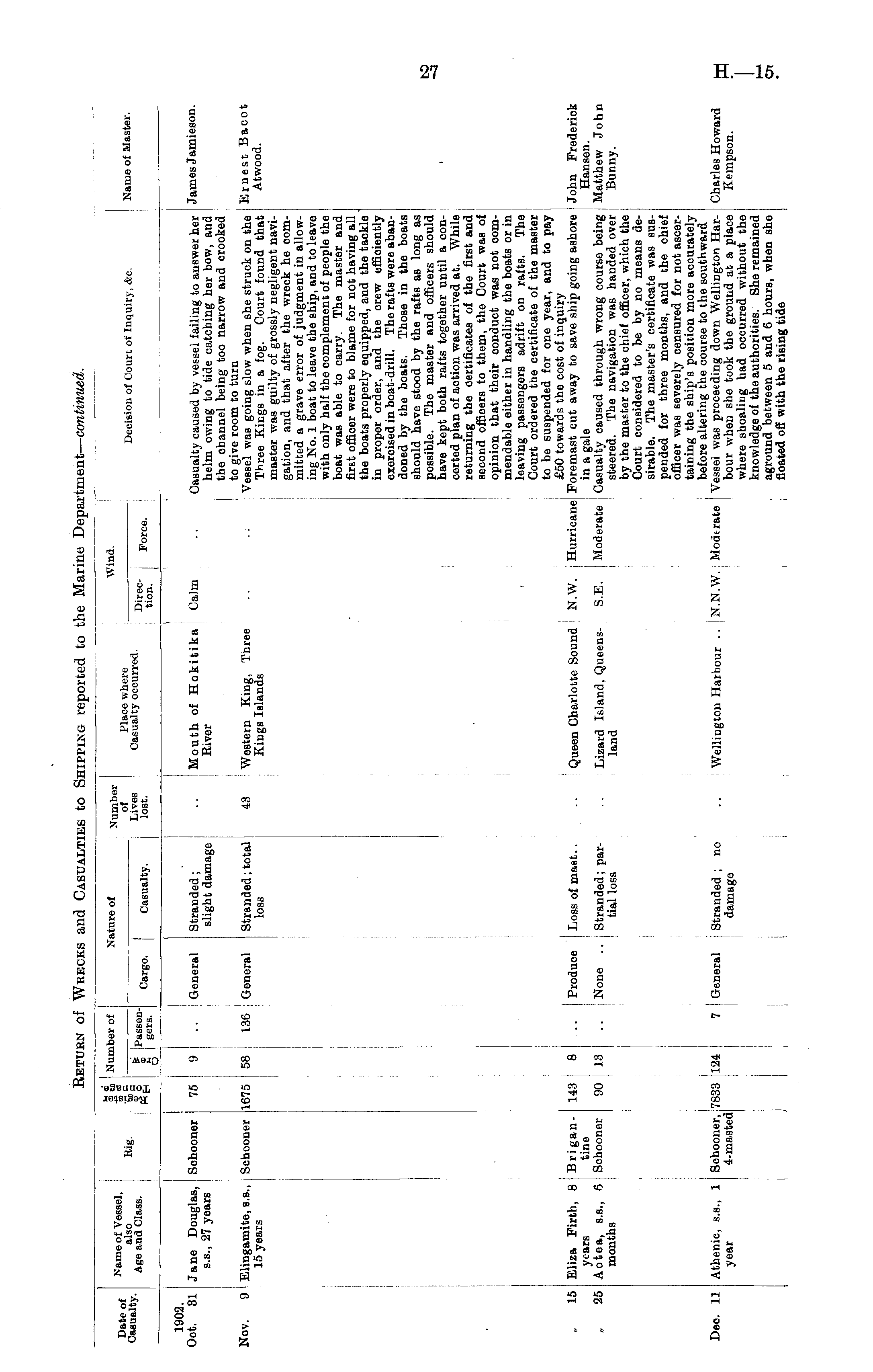Big. tH & » So ■a a M-h Number of j Nature of Number 1 of Lives lost. Place where Casualty occurred. Win Wind. nd. Decision of Court of Inquiry, &c. Name of Master. Date of Casualty. Name of Vessel, also Age and Class. | Passeng gers. Cargo. Casualty. Direction. Force. 1902. Oot. 31 Nov. 9 Jane Douglas, s.s., 27 years Elingamite, s.s., 15 years Jane Douglas, Sohooner 75 9 s.s., 27 years Elingamite, s.s., Schooner 1675 58 15 years Eliza Firth, 8 Brigan- 143 j 8 years tine Aotea, s.s., 6 Schooner 90 | 13 months Athenio, s.s., 1 Sohooner, 7833 124 year 4-masted Sohooner Schooner General Stranded; slight damage 136 General Stranded; total loss Produoe Loss of mast.. None .. Stranded; partial loss 7 General Stranded ; no damage Stranded; slight damage Stranded; total loss 48 Mouth of Hokitika Calm .. Casualty caused by vessel failing to answer her River helm owing to tide catching her bow, and the channel being too narrow and crooked to give room to turn Western King, Tnree .. .: Vessel was going slow when she struck on the Kings Islands Three Kings in a fog. Court found that master was guilty of grossly negligent navigation, and that after the wreck he committed a grave error of judgment in allowing No. 1 boat to leave the ship, and to leave with only half the complement of people the boat was able to oarry. The master and first officer were to blame for not having all the boats properly equipped, and the tackle in proper order, and the orew efficiently exercised in boat-drill. The rafts were abandoned by the boats. Those in the boats should have stood by the rafts as long as possible. The master and officers should have kept both rafts together until a concerted plan of action was arrived at. While returning the certificates of the first and second officers to them, the Court was of opinion that their oonduct was not commendable either in handling the boats or in i leaving passengers adrift on rafts. The Court ordered the certificate of the master to be suspended for one year, and to pay £50 towards the cost of inquiry Queen Charlotte Sound N.W. Hurricane Foremast cut away to save ship going ashore in a gale Lizard Island, Queens- S.E. Moderate Casualty caused through wrong course being land steered. The navigation was handed over by the master to the chief officer, which the Court considered to be by no means desirable. The master's certificate was suspended for three months, and the ohief officer was severely censured for not ascertaining the ship's position more accurately before altering the course to the southward Wellington Harbour .. N.N.W. Moderate j Vessel was proceeding down Wellington Harbour when she took the ground at a place where shoaling had occurred without the knowledge of the authorities. She remained aground between 5 and 6 hours, when she floated off with the rising tide James Jamieson. Ernest Bacot Atwood. 15 25 John Frederick Hansen. Matthew John Bunny. Deo. 11 Charles Howard Kempson.