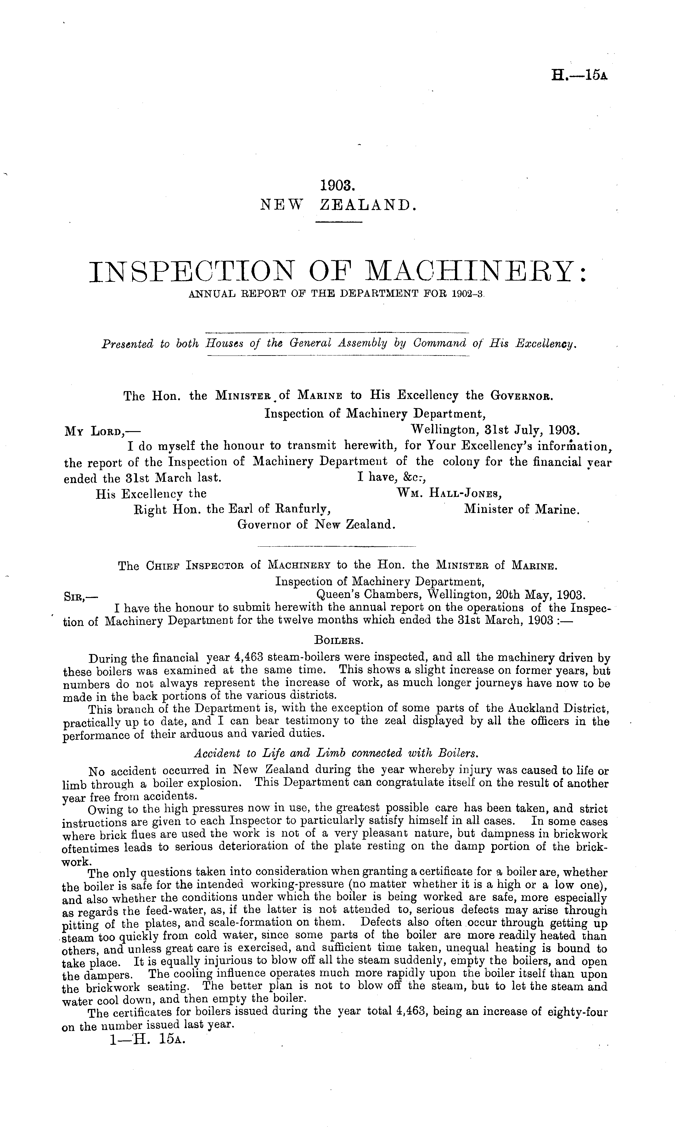 The Hon. the Minister, of Marine to His Excellency the Governor. Inspection of Machinery Department, My Lord, — Wellington, 31st July, 1903. I do myself the honour to transmit herewith, for Your Excellency's information, the report of the Inspection of Machinery Department of the colony for the financial year ended the 31st March last. I have, &c, His Excellency the Wμ. Hall-Jones, Right Hon. the Earl of Ranfurly, Minister of Marine. Governor of New Zealand.