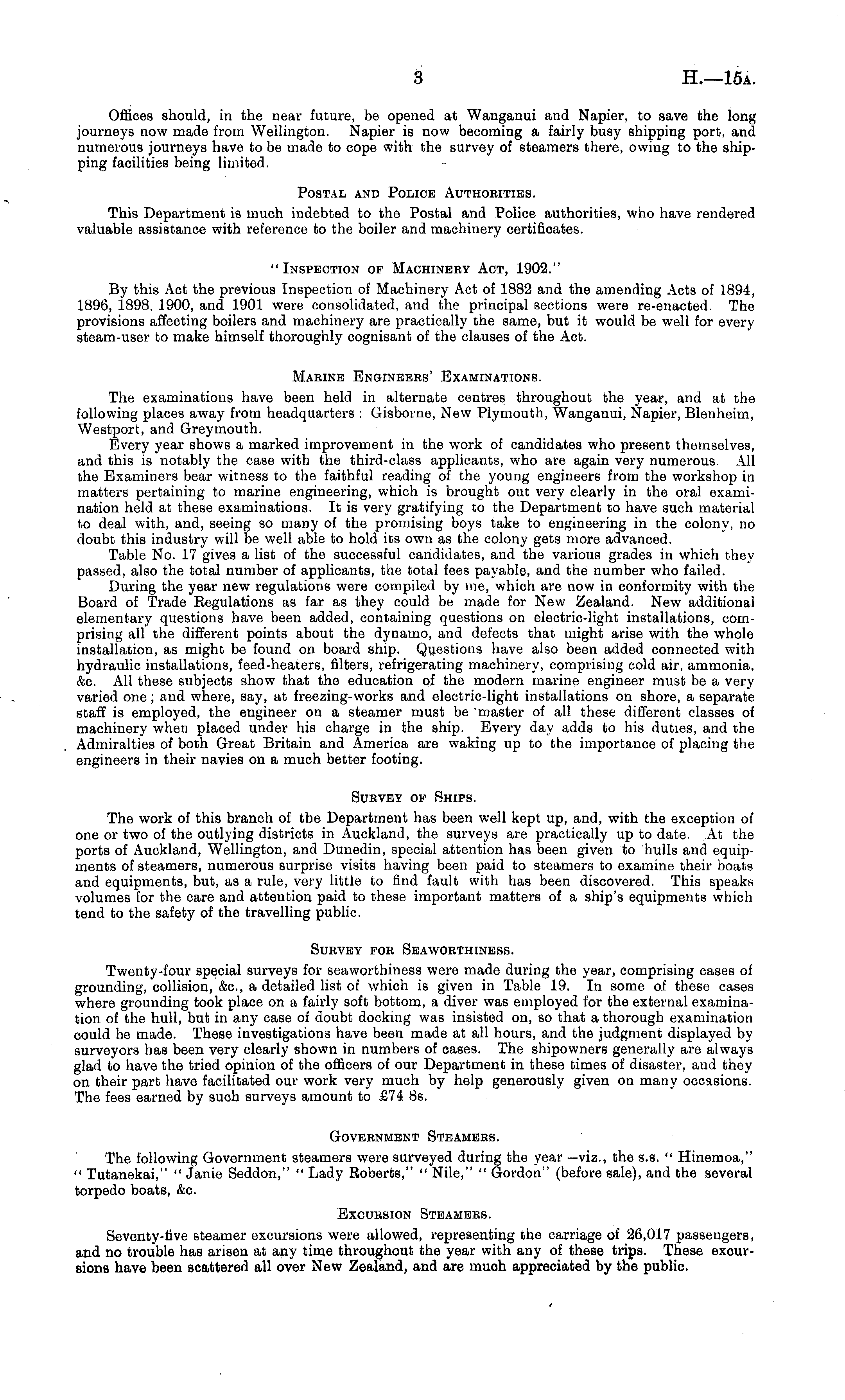 Offices should, in the near future, be opened at Wanganui and Napier, to save the long journeys now made from Wellington. Napier is now becoming a fairly busy shipping port, and numerous journeys have to be made to cope with the survey of steamers there, owing to the shipping facilities being limited. Postal and Police Authokities. This Department is much indebted to the Postal and Police authorities, who have rendered valuable assistance with reference to the boiler and machinery certificates. "Inspection of Machinery Act, 1902." By this Act the previous Inspection of Machinery Act of 1882 and the amending Acts of 1894, 1896, 1898. 1900, and 1901 were consolidated, and the principal sections were re-enacted. The provisions affecting boilers and machinery are practically the same, but it would be well for every steam-user to make himself thoroughly cognisant of the clauses of the Act. Maeine Engineers' Examinations. The examinations have been held in alternate centres throughout the year, and at the following places away from headquarters : Gisborne, New Plymouth, Wanganui, Napier, Blenheim, Westport, and Greymouth. Every year shows a marked improvement in the work of candidates who present themselves, and this is notably the case with the third-class applicants, who are again very numerous All the Examiners bear witness to the faithful reading of the young engineers from the workshop in matters pertaining to marine engineering, which is brought out very clearly in the oral examination held at these examinations. It is very gratifying to the Department to have such material to deal with, and, seeing so many of the promising boys take to engineering in the colony, no doubt this industry will be well able to hold its own as the colony gets more advanced. Table No. 17 gives a list of the successful candidates, and the various grades in which they passed, also the total number of applicants, the total fees payable, and the number who failed. During the year new regulations were compiled by me, which are now in conformity with the Board of Trade Regulations as far as they could be made for New Zealand. New additional elementary questions have been added, containing questions on electric-light installations, comprising all the different points about the dynamo, and defects that might arise with the whole installation, as might be found on board ship. Questions have also been added connected with hydraulic installations, feed-heaters, filters, refrigerating machinery, comprising cold air, ammonia, &c. All these subjects show that the education of the modern marine engineer must be a very varied one; and where, say, at freezing-works and electric-light installations on shore, a separate staff is employed, the engineer on a steamer must be master of all these different classes of machinery when placed under his charge in the ship. Every day adds to his duties, and the Admiralties of both Great Britain and America are waking up to the importance of placing the engineers in their navies on a much better footing. Survey of Ships. The work of this branch of the Department has been well kept up, and, with the exception of one or two of the outlying districts in Auckland, the surveys are practically up to date. At the ports of Auckland, Wellington, and Dunedin, special attention has been given to hulls and equipments of steamers, numerous surprise visits having been paid to steamers to examine their boats and equipments, but, as a rule, very little to find fault with has been discovered. This speaks volumes for the care and attention paid to these important matters of a ship's equipments which tend to the safety of the travelling public. Survey for Seaworthiness. Twenty-four special surveys for seaworthiness were made during the year, comprising cases of grounding, collision, &c, a detailed list of which is given in Table 19. In some of these cases where grounding took place on a fairly soft bottom, a diver was employed for the external examination of the hull, but in any case of doubt docking was insisted on, so that a thorough examination could be made. These investigations have been made at all hours, and the judgment displayed by surveyors has been very clearly shown in numbers of cases. The shipowners generally are always glad to have the tried opinion of the officers of our Department in these times of disaster, and they on their part have facilitated our work very much by help generously given on many occasions. The fees earned by such surveys amount to £74 Bs. Government Steamers. The following Government steamers were surveyed during the year—viz., the s.s. " Hinemoa," " Tutanekai," " Janie Seddon," " Lady Roberts," " Nile," " Gordon" (before sale), and the several torpedo boats, &c. Excursion Steamers. Seventy-five steamer excursions were allowed, representing the carriage of 26,017 passengers, and no trouble has arisen at any time throughout the year with any of these trips. These excursions have been scattered all over New Zealand, and are much appreciated by the public.