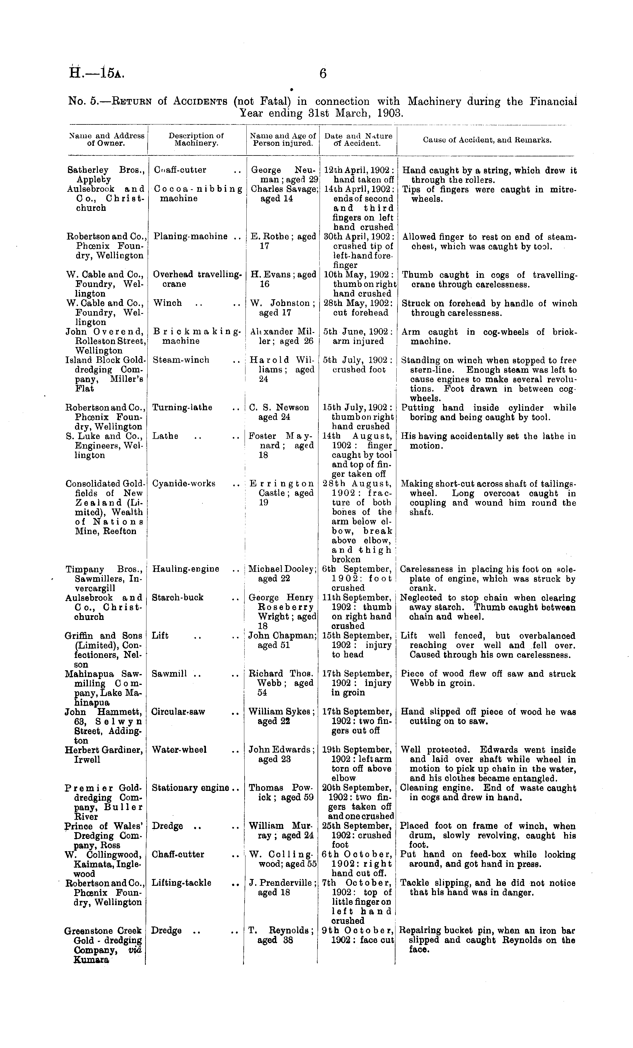 No. 5. —Return of Accidents (not Fatal) in connection with Machinery during the Financial Year ending 31st March, 1903.