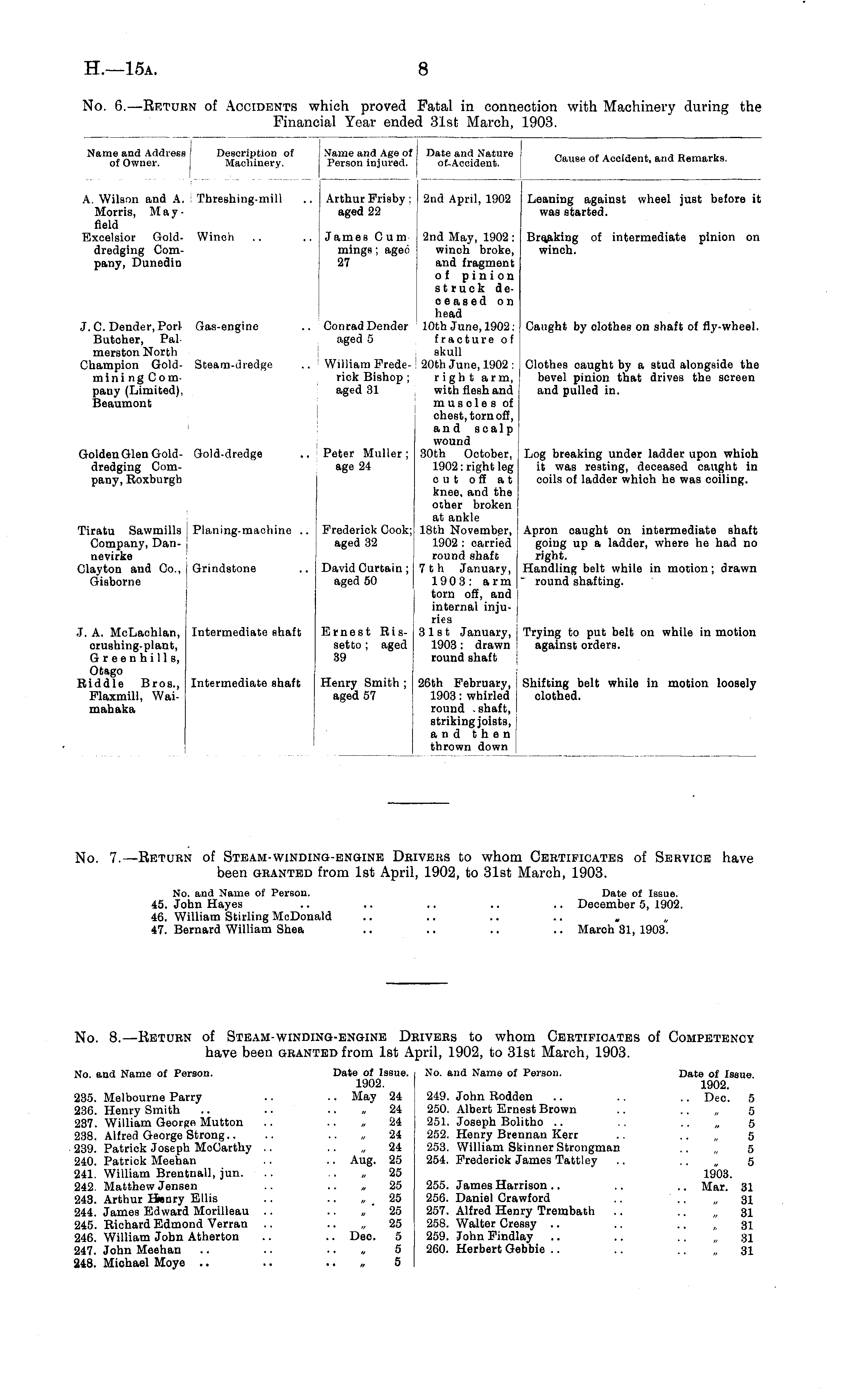 No. 7. —Beturn of Steam-winding-engine Drivers to whom Certificates of Service have been granted from Ist April, 1902, to 31st March, 1903. No. and Name of Person. Date of Issue. 45. John Hayes .. .. .. .. .. December 5, 1902. 46. William Stirling McDonald 47. Bernard William Shea .. .. .. .. March 31, 1903.