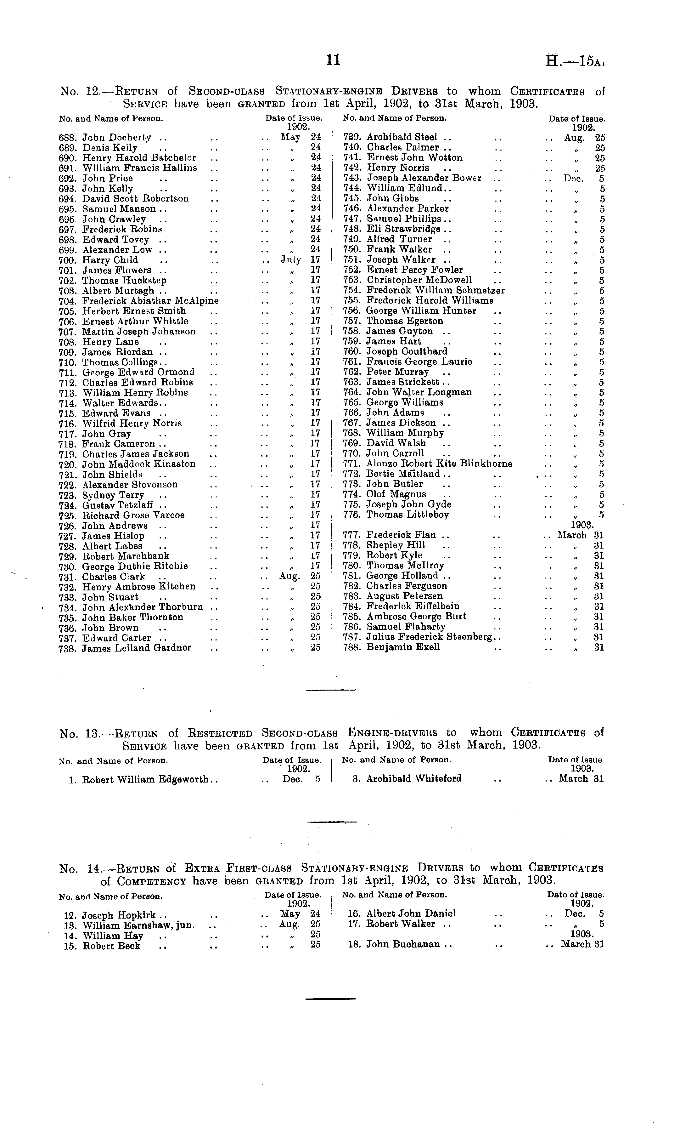 No. 14.—Return of Extra First-class Stationary-engine Drivers to whom Certificates of Competency have been granted from Ist April, 1902, to 31st March, 1903. No and Name of Person Date of Issue. No. and Name of Person. Date of Issue. 1902. 1902. 12. Joseph Hopkirk .. .. .. May 24 16. Albert John Daniel .. .. Dec. 5 13. William Earnshaw, jun. .. .. Aug. 25 17. Robert Walker .. .. 5 14. William Hay .. .. .. „ 25 1903. 15. Robert Beok .. .. 25 18. John Buchanan .. .. .. March 31