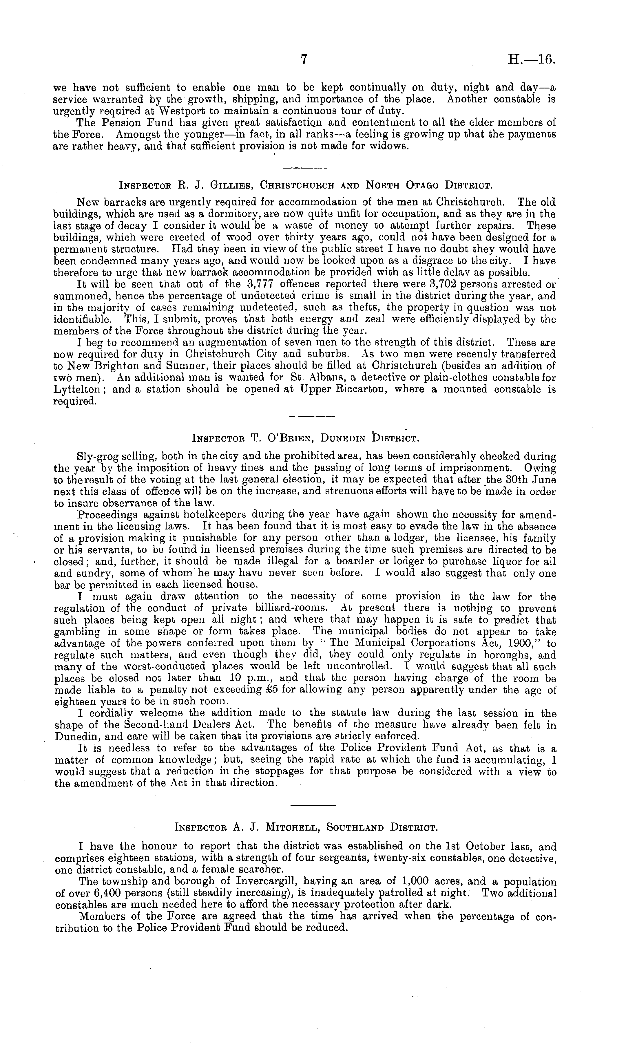 Inspectok E. J. Gillies, Cheistchukch and North Otago District. New barracks are urgently required for accommodation of the men at Ghristchurch. The old buildings, which are used as a dormitory, are now quite unfit for occupation, and as they are in the last stage of decay I consider it would be a waste of money to attempt further repairs. These buildings, which were erected of wood over thirty years ago, could not have been designed for a permanent structure. Had they been in view of the public street I have no doubt they would have been condemned many years ago, and would now be looked upon as a disgrace to the city. I have therefore to urge that new barrack accommodation be provided with as little delay as possible. It will be seen that out of the 3,777 offences reported there were 3,702 persons arrested or summoned, hence the percentage of undetected crime is small in the district during the year, and in the majority of cases remaining undetected, such as thefts, the property in question was not identifiable, this, I submit, proves that both energy and zeal were efficiently displayed by the members of the Force throughout the district during the year. I beg to recommend an augmentation of seven men to the strength of this district. These are now required for duty in Christchurch City and suburbs. As two men were recently transferred to New Brighton and Sumner, their places should be filled at Christchurch (besides an addition of two men). An additional man is wanted for St. Albans, a detective or plain-clothes constable for Lyttelton; and a station should be opened at Upper Riccarton, where a mounted constable is required.