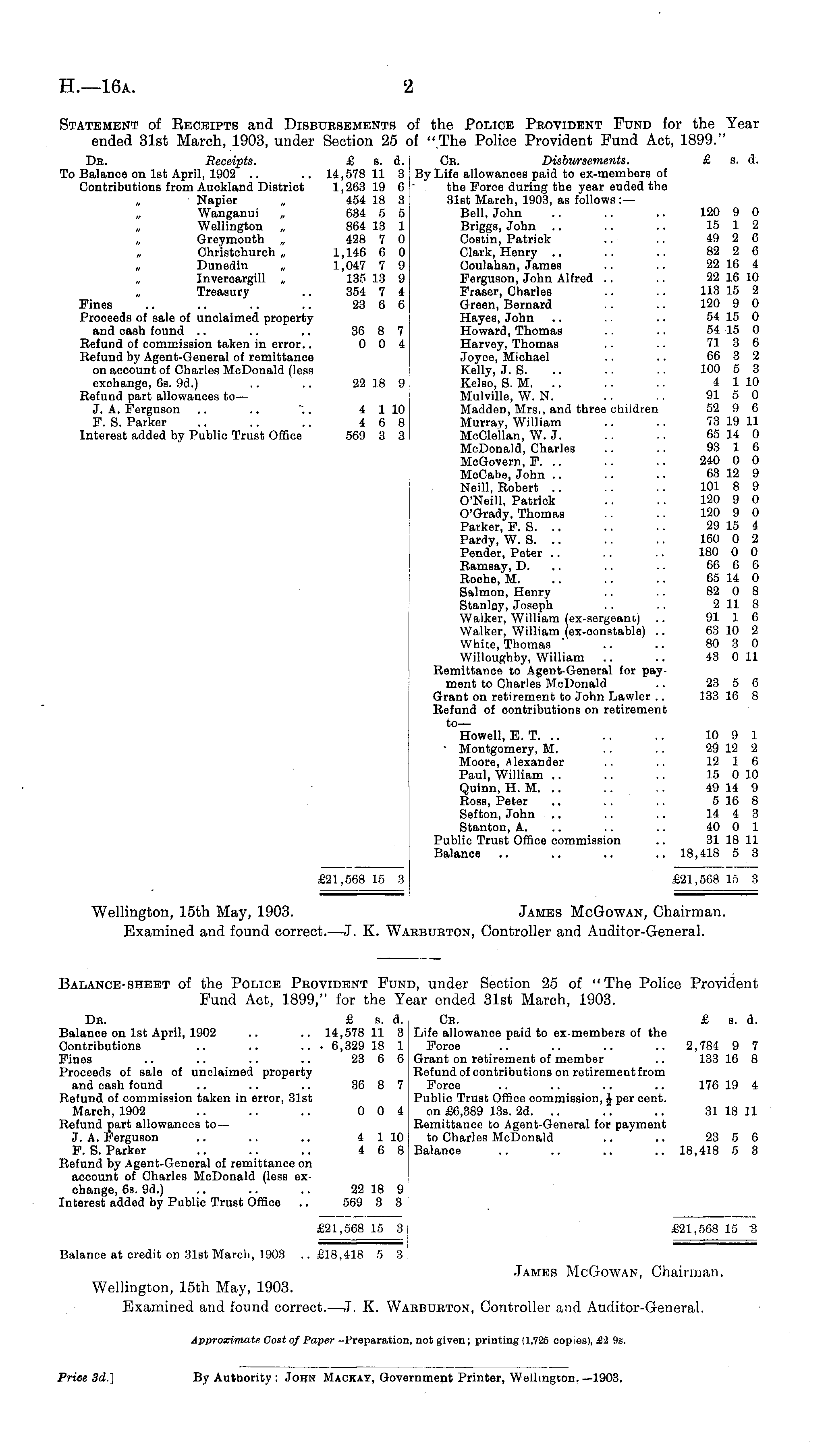 Balance-sheet of the Police Provident Fund, under Section 25 of "The Police Provident Fund Act, 1899," for the Year ended 31st March, 1903. Db. £ s. d. Cb. £ s. d. Balance on Ist April, 1902 .. .. 14,578 11 3 Life allowanoe paid to ex-members of the Contributions .. .. ... 6,329 18 1 Force .. .. .. .. 2,784 9 7 Fines .. .. .. .. 23 6 6 Grant on retirement of member .. 133 16 8 Proceeds of sale of unolaimed property Refund of contributions on retirement from and cash found .. .. .. 36 8 7 Force .. .. .. .. 176 19 4 Refund of commission taken in error, 31st Publio Trust Office commission, J per cent. March, 1902 .. .. .. 0 0 4 on £6,389 13s. 2d. .. .. .. 31 18 11 Refund part allowances to— Remittance to Agent-General for payment J. A. Ferguson .. .. .. 4 1 10 to Charles McDonald .. .. 23 5 6 F.S.Parker .. .. .. 4 6 8 Balance .. .. .. .. 18,418 5 3 Refund by Agent-General of remittance on account of Charles McDonald (less exchange, 6s. 9d.) .. .. .. 22 18 9 Interest added by Public Trust Office .. 569 3 3 £21,568 15 3 £21,568 15 "3 Balance at credit on 31st March, 1903 ..£18,418 5 3 James McGowan, Chairman. Wellington, 15th May, 1903. Examined and found correct.—J. K. Warburton, Controller and Auditor-General. Approximate Cost of Paper —Preparation, not given; printing (1,725 copies), £> 9s.