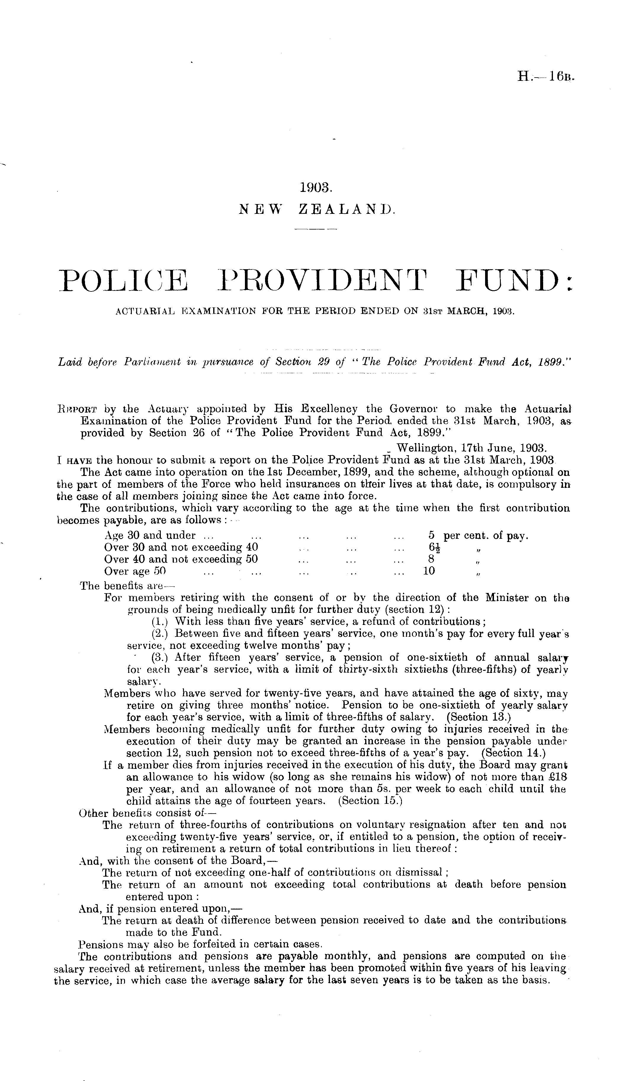 Ki'.pobt by the Actuary appointed by His Excellency the Governor to make the Actuarial Examination of the Police Provident Fund for the Period, ended the 31st March, 1903, a* provided by Section 26 of "The Police Provident Fund Act, 1899." . Wellington, 17th June, 1903. I have the honour to submit a report on the Police Provident Fund as at the 31st March, 1903 The Act came into operation on the Ist December, 1899, and the scheme, although optional on the part of members of the Force who held insurances on their lives at that date, is compulsory in the case of all members joining since the Act came into force. The contributions, which vary according to the age at the time when the first contribution becomes payable, are as follows : Age 30 and under ... ... ... ... ... 5 per cent, of pay. Over 30 and not exceeding 40 ... ... ... „ Over 40 and not exceeding 50 ... ... ... 8 „ Over age 50 ... ... ... .. ... 10 The benefits are — For members retiring with the consent of or by the direction of the Minister on the grounds of being medically unfit for further duty (section 12) : (1.) With less than five years' service, a refund of contributions; (2.) Between five and fifteen years' service, one month's pay for every full year's service, not exceeding twelve months' pay; (3.) After fifteen years' service, a pension of one-sixtieth of annual salary for each year's service, with a limit of thirty-sixth sixtieths (three-fifths) of yearly salary. Members who have served for twenty-five years, and have attained the age of sixty, may retire on giving three months' notice. Pension to be one-sixtieth of yearly salary for each year's service, with a limit of three-fifths of salary. (Section 13.) Members becoming medically unfit for further duty owing to injuries received in the execution of their duty may be granted an increase in the pension payable under section 12, such pension not to exceed three-fifths of a year's pay. (Section 14.) If a member dies from injuries received in the execution of his duty, the Board may grant an allowance to his widow (so long as she remains his widow) of not more than £18 per year, and an allowance of not more than ss. per week to each child until the child attains the age of fourteen years. (Section 15.) Other benefits consist of — The return of three-fourths of contributions on voluntary resignation after ten and not exceeding twenty-five years' service, or, if entitled to a pension, the option of receiving on retirement a return of total contributions in lieu thereof: And, with the consent of the Board, — The return of not exceeding one-half of contributions on dismissal; The return of an amount not exceeding total contributions at death before pension entered upon : And, if pension entered upon,— The return at death of difference between pension received to date and the contributions made to the Fund. Pensions may also be forfeited in certain cases. The contributions and pensions are payable monthly, and pensions are computed on the salary received at retirement, unless the member has been promoted within five years of his leaving the service, in which case the average salary for the last seven years is to be taken as the basis.