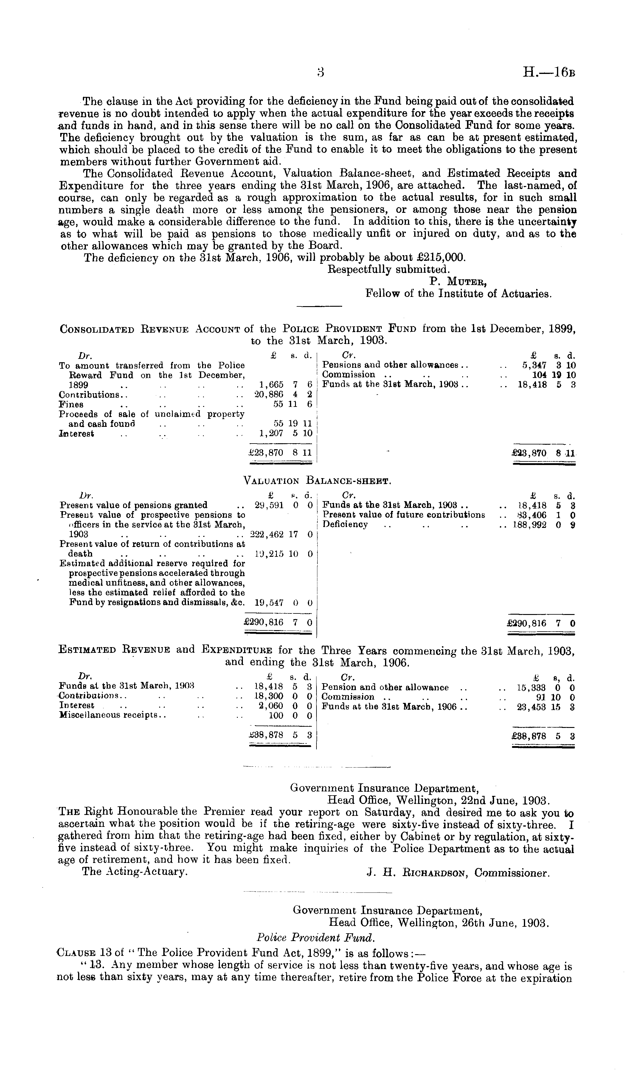 Government Insurance Department, Head Office, Wellington, 22nd June, 1903. The Right Honourable the Premier read your report on Saturday, and desired me to ask you to ascertain what the position would be if the retiring-age were sixty-five instead of sixty-three. I gathered from him that the retiring-age had been fixed, either by Cabinet or by regulation, at sixtyfive instead of sixty-three. You might make inquiries of the Police Department as to the actual age of retirement, and how it has been fixed. The Acting-Actuary. J. H. Richakdson, Commissioner.