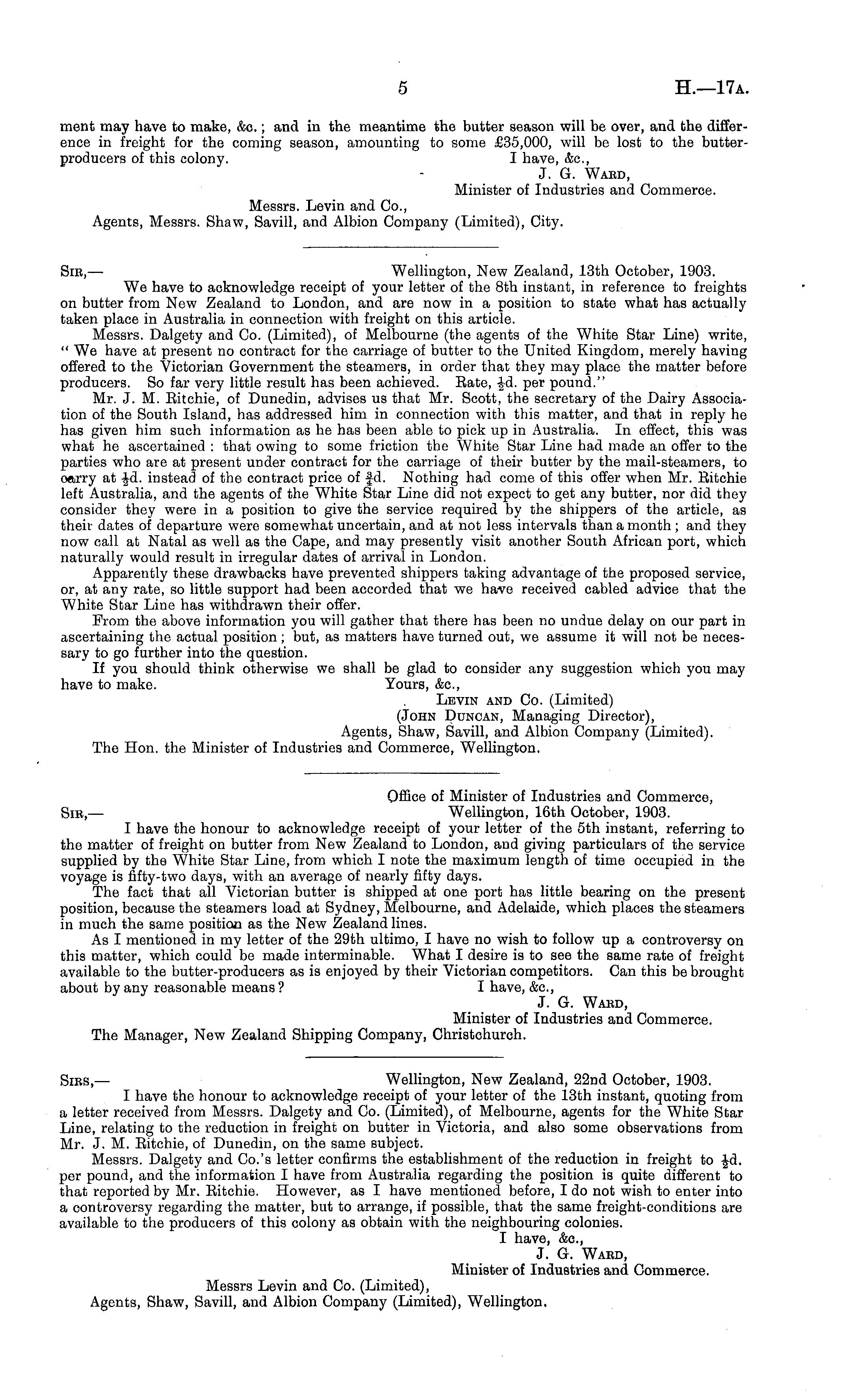 Sirs,— Wellington, New Zealand, 22nd October, 1903. I have the honour to acknowledge receipt of your letter of the 13th instant, quoting from a letter received from Messrs. Dalgety and Co. (Limited), of Melbourne, agents for the White Star Line, relating to the reduction in freight on butter in Victoria, and also some observations from Mr. J. M. Eitchie, of Dunedin, on the same subject. Messrs. Dalgety and Co.'s letter confirms the establishment of the reduction in freight to fd. per pound, and the information I have from Australia regarding the position is quite different to that reported by Mr. Eitchie. However, as I have mentioned before, Ido not wish to enter into a controversy regarding the matter, but to arrange, if possible, that the same freight-conditions are available to the producers of this colony as obtain with the neighbouring colonies. I have, &c, J. G. Ward, Minister of Industries and Commerce. Messrs Levin and Co. (Limited), Agents, Shaw, Savill, and Albion Company (Limited), Wellington.