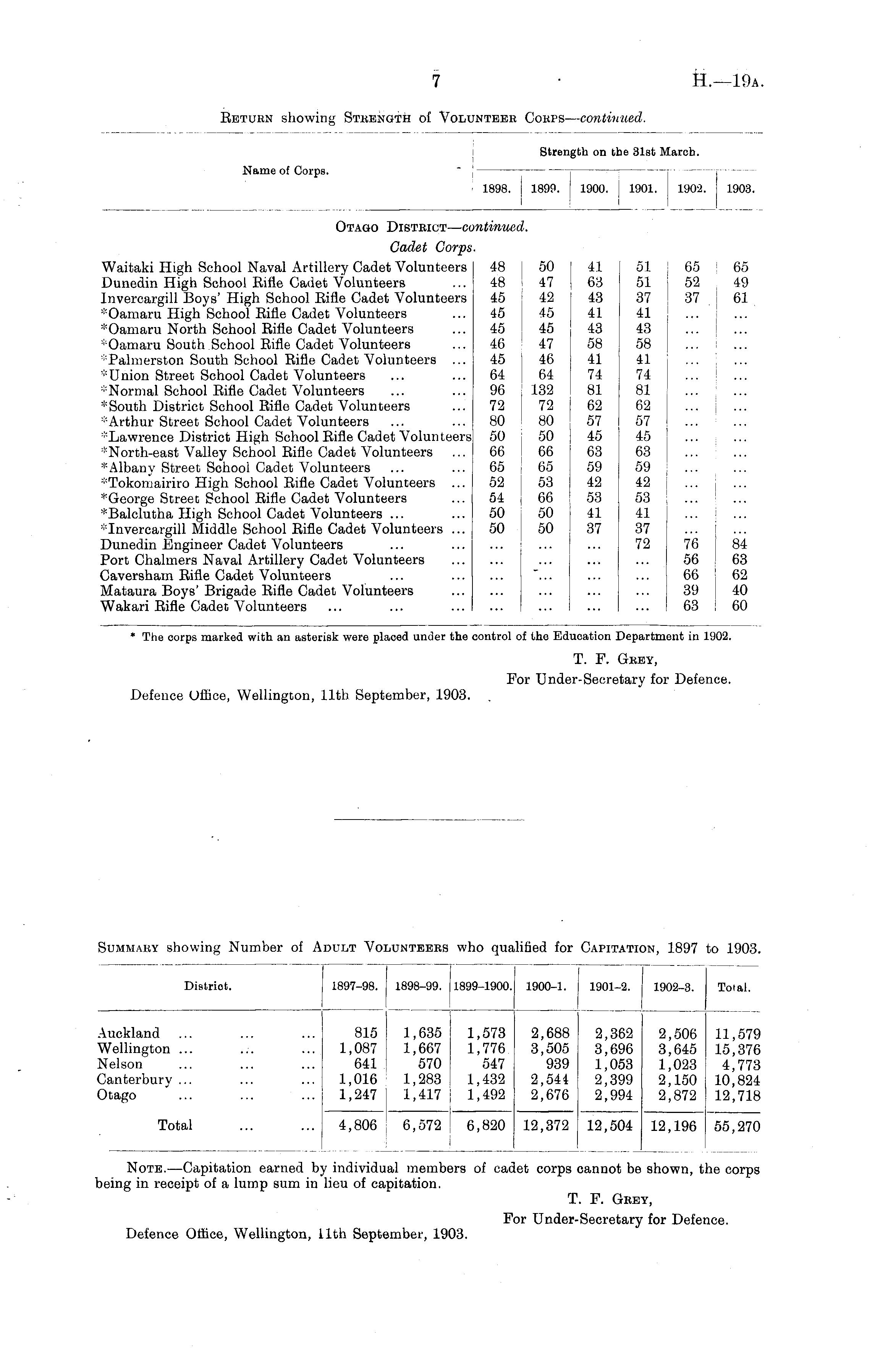 Note.—Capitation earned by individual members of cadet corps cannot be shown, the corps being in receipt of a lump sum in lieu of capitation. T. F. Grey, For Under-Secretary for Defence. Defence Office, Wellington, 11th September, 1903.