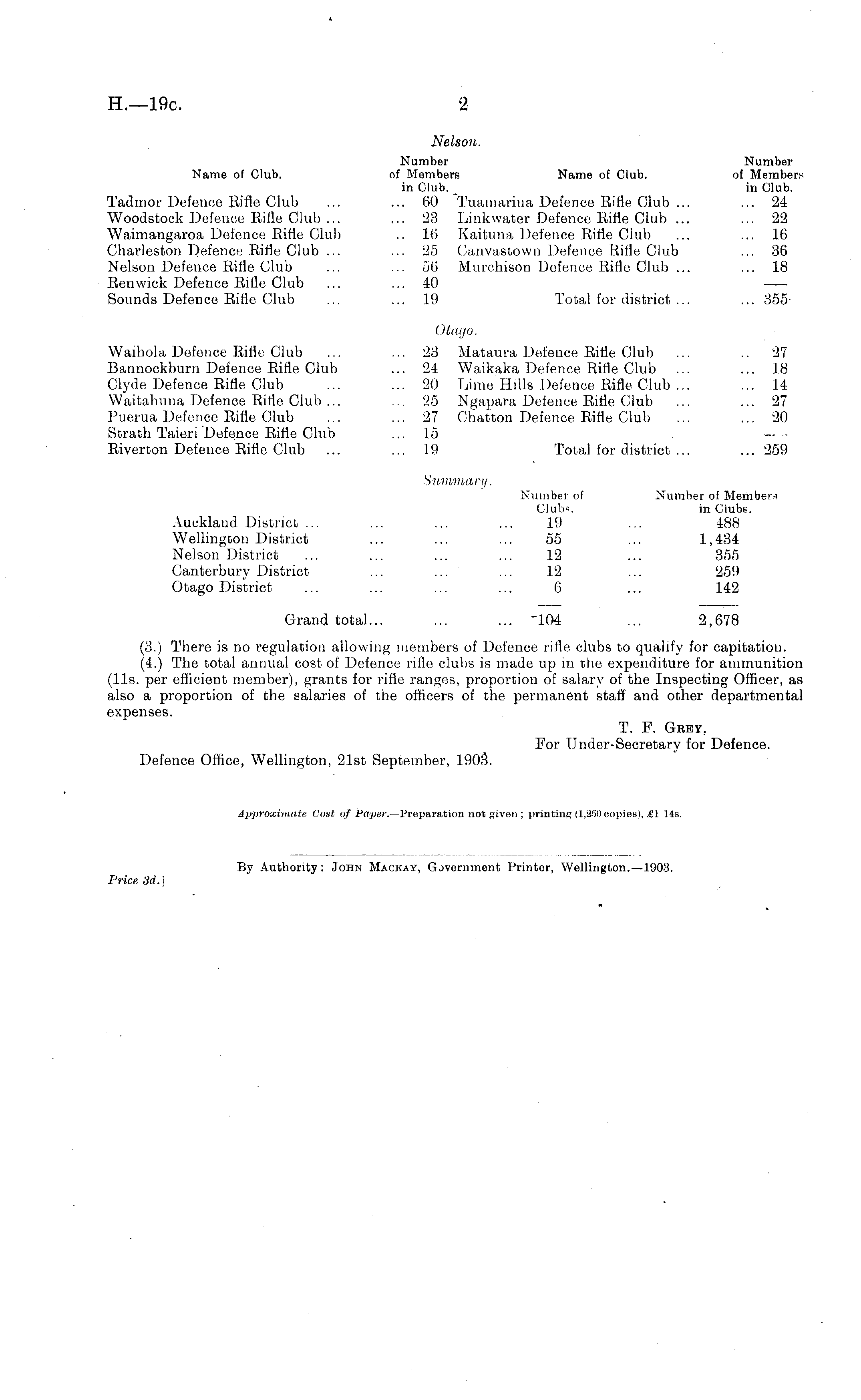 Nelson. Number Number Name of Club. of Members Name of Club. of Members in Club. _ in Club. Tadmor Defence Rifle Club ... ... 60 Tuamarina Defence Rifle Club ... ... 24 Woodstock Defence Rifle Club ... ... 23 Linkwater Defence Rifle Club ... ... 22 Waimangaroa Defence Rifle Club .. 16 Kaituna Defence Rifle Club ... ... 16 Charleston Defence Rifle Club ... ... 25 Canvastown Defence Rifle Club ... 36 Nelson Defence Rifle Club ... ... 56 Murchison Defence Rifle Club ... ... 18 Renwick Defence Rifle Club ... ... 40 Sounds Defence Rifle Club ... ... 19 Total for district ... ... 355Otago. Waihola Defence Rifle Club ... ... 23 Mataura Defence Rifle Club ... .. 27 Bannockburn Defence Rifle Club ... 24 Waikaka Defence Rifle Club ... ... 18 Clyde Defence Rifle Club ... ... 20 Lime Hills Defence Rifle Club ... ... 14 Waitahuna Defence Rifle Club ... ... 25 Ngapara Defence Rifle Club ... ... 27 Puerua Defence Rifle Club ... ... 27 Chatton Defence Rifle Club ... ... 20 Strath Taieri Defence Rifle Club ... 15 Riverton Defence Rifle Club ... ... 19 Total for district ... ... 259 Summary. Number of Number of Members Club". in Clubs. Auckland District ... ... ... ... 19 ... 488 Wellington District ... ... ... 55 ... 1,434 Nelson District ... ... ... ... 12 ... 355 Canterbury District ... ... ... 12 ... 259 Otago District ... ... ... ... 6 ... 142 Grand total... ... ... "104 ... 2,678 (3.) There is no regulation allowing members of Defence rifle clubs to qualify for capitation. (4.) The total annual cost of Defence rifle clubs is made up in the expenditure for ammunition (lis. per efficient member), grants for rifle ranges, proportion of salary of the Inspecting Officer, as also a proportion of the salaries of the officers of the permanent staff and other departmental expenses. T. F. Grey, For Under-Secretary for Defence. Defence Office, Wellington, 21st September, 1903. Approximate Cost of Paper. —Preparation not given ; printing (1,250 copies), £1 14s.