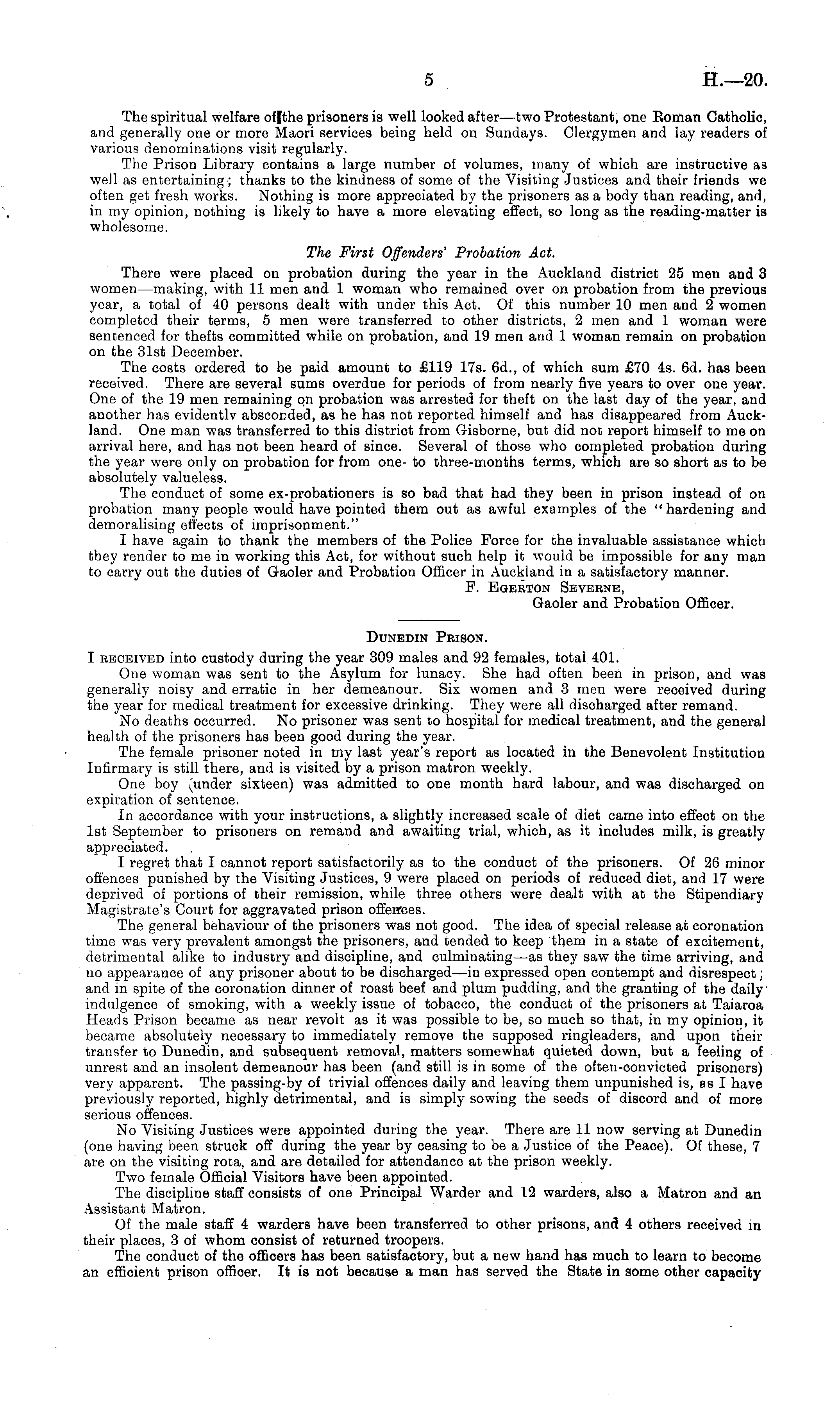DUNEDIN PsiSON. I received into custody during the year 309 males and 92 females, total 401. One woman was sent to the Asylum for lunacy. She had often been in prison, and was generally noisy and erratic in her demeanour. Six women and 3 men were received during the year for medical treatment for excessive drinking. They were all discharged after remand. No deaths occurred. No prisoner was sent to hospital for medical treatment, and the general health of the prisoners has been good during the year. The female prisoner noted in my last year's report as located in the Benevolent Institution Infirmary is still there, and is visited by a prison matron weekly. One boy (under sixteen) was admitted to one month hard labour, and was discharged on expiration of sentence. In accordance with your instructions, a slightly increased scale of diet came into effect on the Ist September to prisoners on remand and awaiting trial, which, as it includes milk, is greatly appreciated. I regret that I cannot report satisfactorily as to the conduct of the prisoners. Of 26 minor offences punished by the Visiting Justices, 9 were placed on periods of reduced diet, and 17 were deprived of portions of their remission, while three others were dealt with at the Stipendiary Magistrate's Court for aggravated prison offerees. The general behaviour of the prisoners was not good. The idea of special release at coronation time was very prevalent amongst the prisoners, and tended to keep them in a state of excitement, detrimental alike to industry and discipline, and culminating—as they saw the time arriving, and no appearance of any prisoner about to be discharged—in expressed open contempt and disrespect; and in spite of the coronation dinner of roast beef and plum pudding, and the granting of the daily indulgence of smoking, with a weekly issue of tobacco, the conduct of the prisoners at Taiaroa Heads Prison became as near revolt as it was possible to be, so much so that, in my opinion, it became absolutely necessary to immediately remove the supposed ringleaders, and upon their transfer to Dunedin, and subsequent removal, matters somewhat quieted down, but a feeling of unrest and an insolent demeanour has been (and stiil is in some of the often-convicted prisoners) very apparent. The passing-by of trivial offences daily and leaving them unpunished is, as I have previously reported, highly detrimental, and is simply sowing the seeds of discord and of more serious offences. No Visiting Justices were appointed during the year. There are 11 now serving at Dunedin (one having been struck off during the year by ceasing to be a Justice of the Peace). Of these, 7 are on the visiting rota, and are detailed for attendance at the prison weekly. Two female Official Visitors have been appointed. The discipline staff consists of one Principal Warder and 12 warders, also a Matron and an Assistant Matron. Of the male staff 4 warders have been transferred to other prisons, and 4 others received in their places, 3 of whom consist of returned troopers. The conduct of the officers has been satisfactory, but a new hand has much to learn to become an efficient prison officer. It is not because a man has served the State in some other capacity