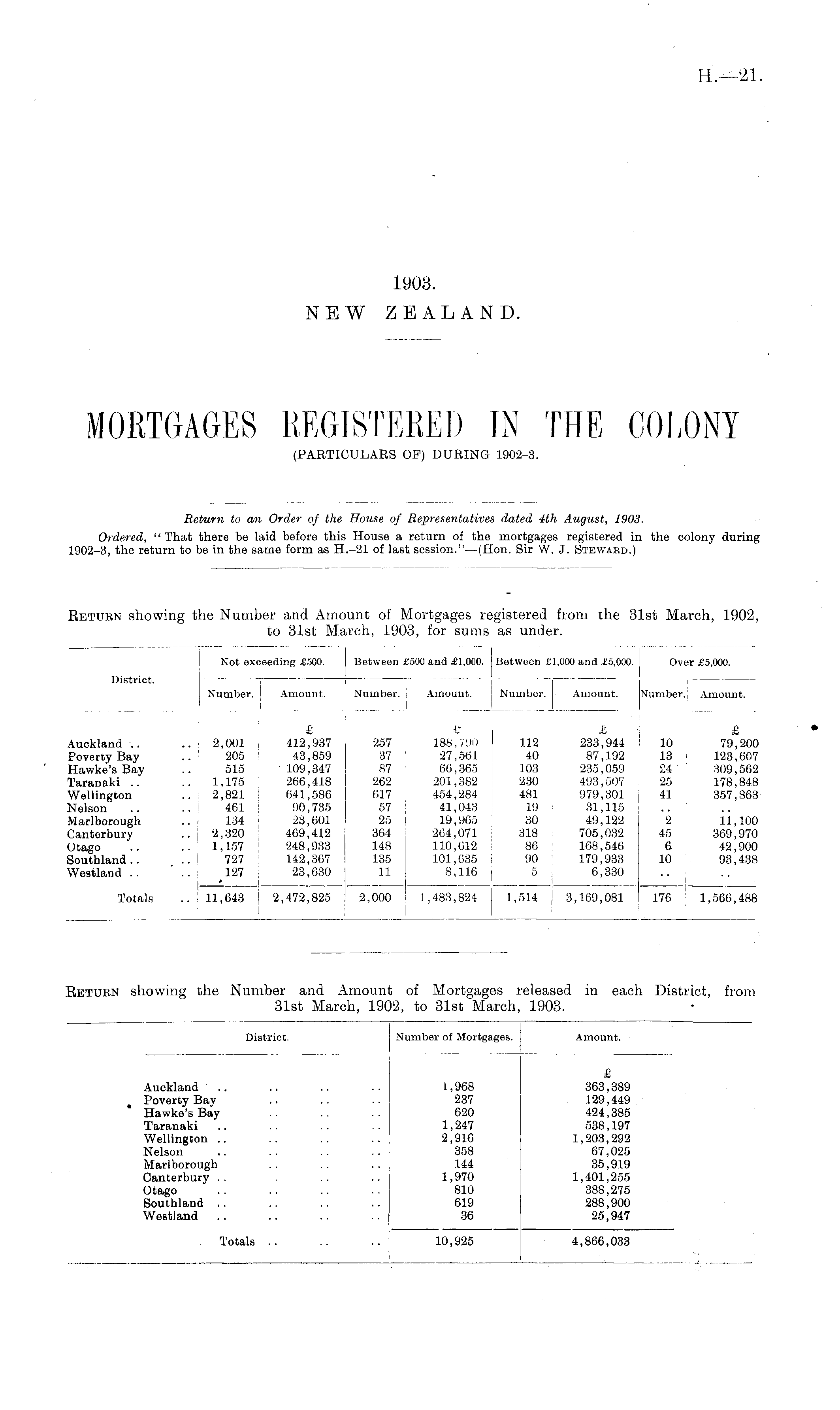 Return to an Order of the House of Representatives dated 4th August, 1903. Ordered, "That there be laid before this House a return of the mortgages registered in the colony during 1902-3, the return to be in the same form as H.-21 of last session." —(Hon. Sir W. J. Steward.)